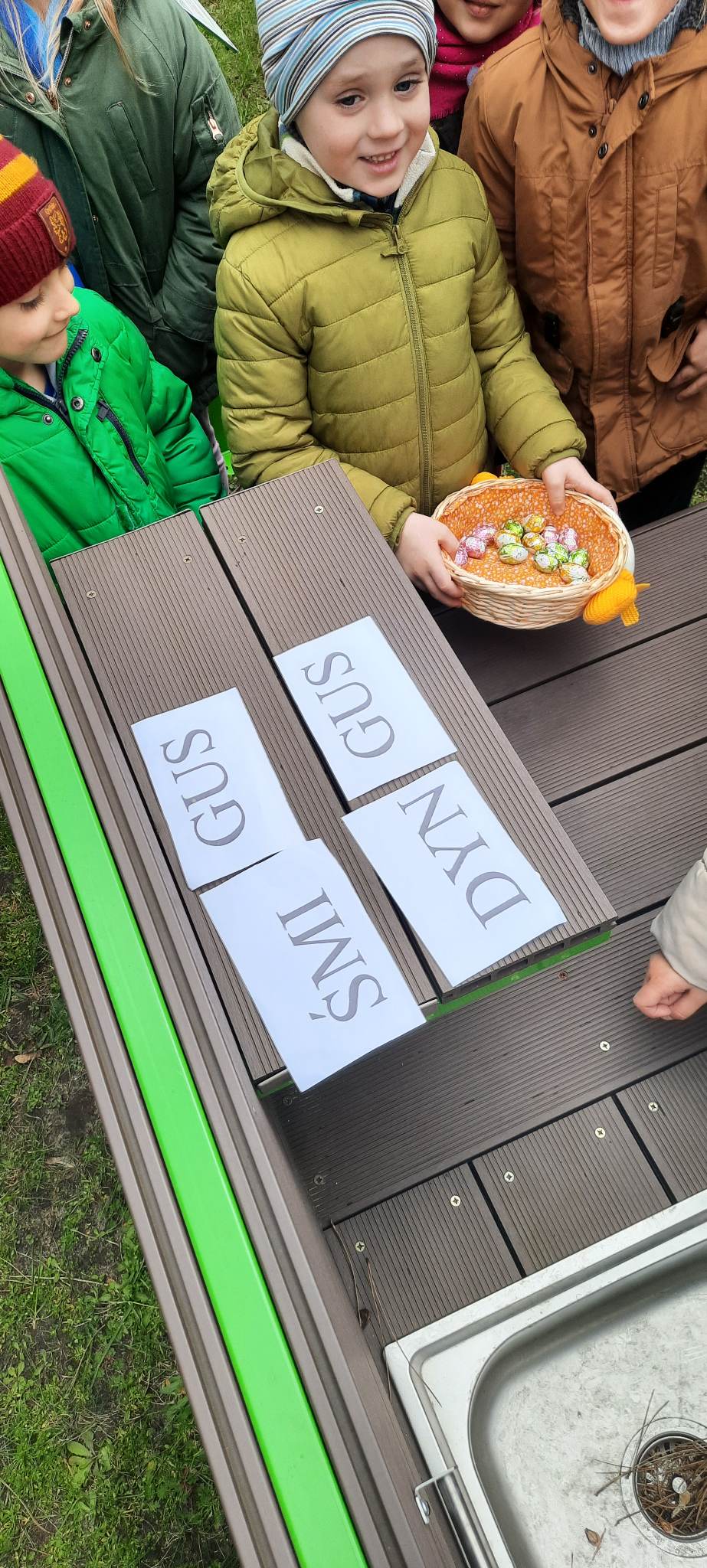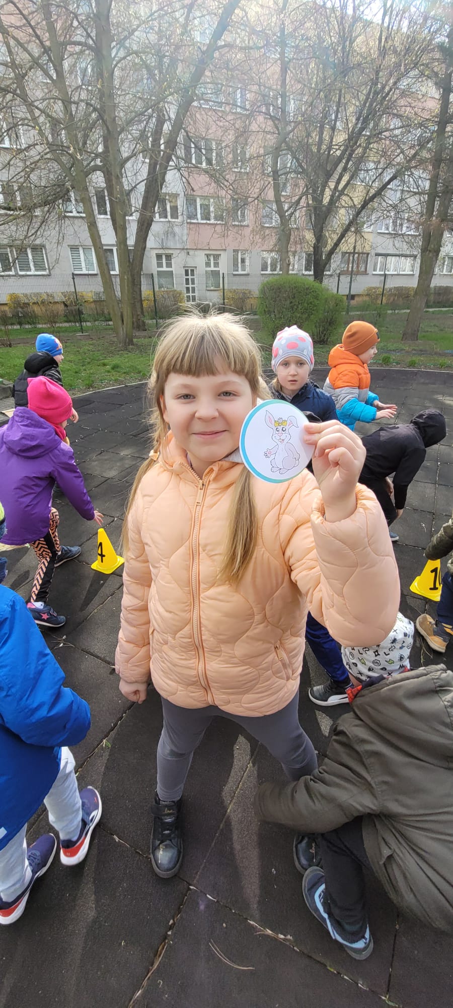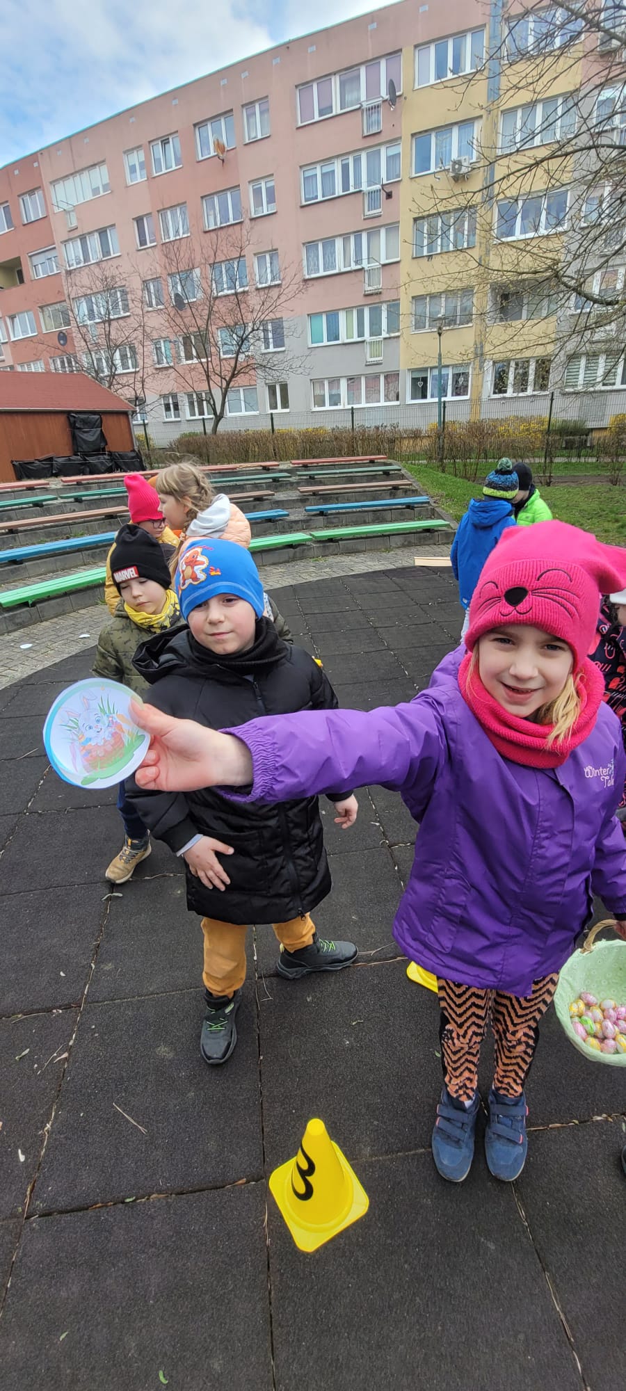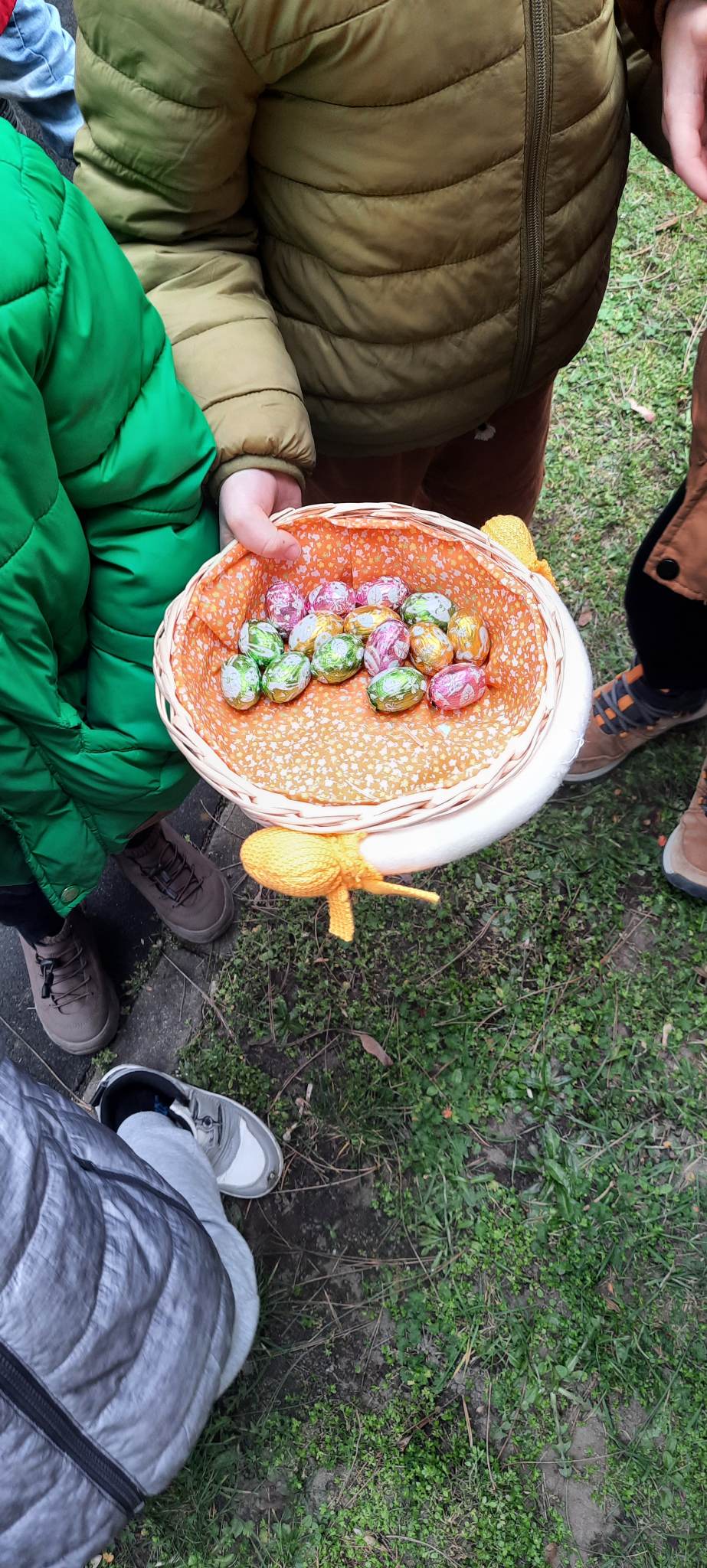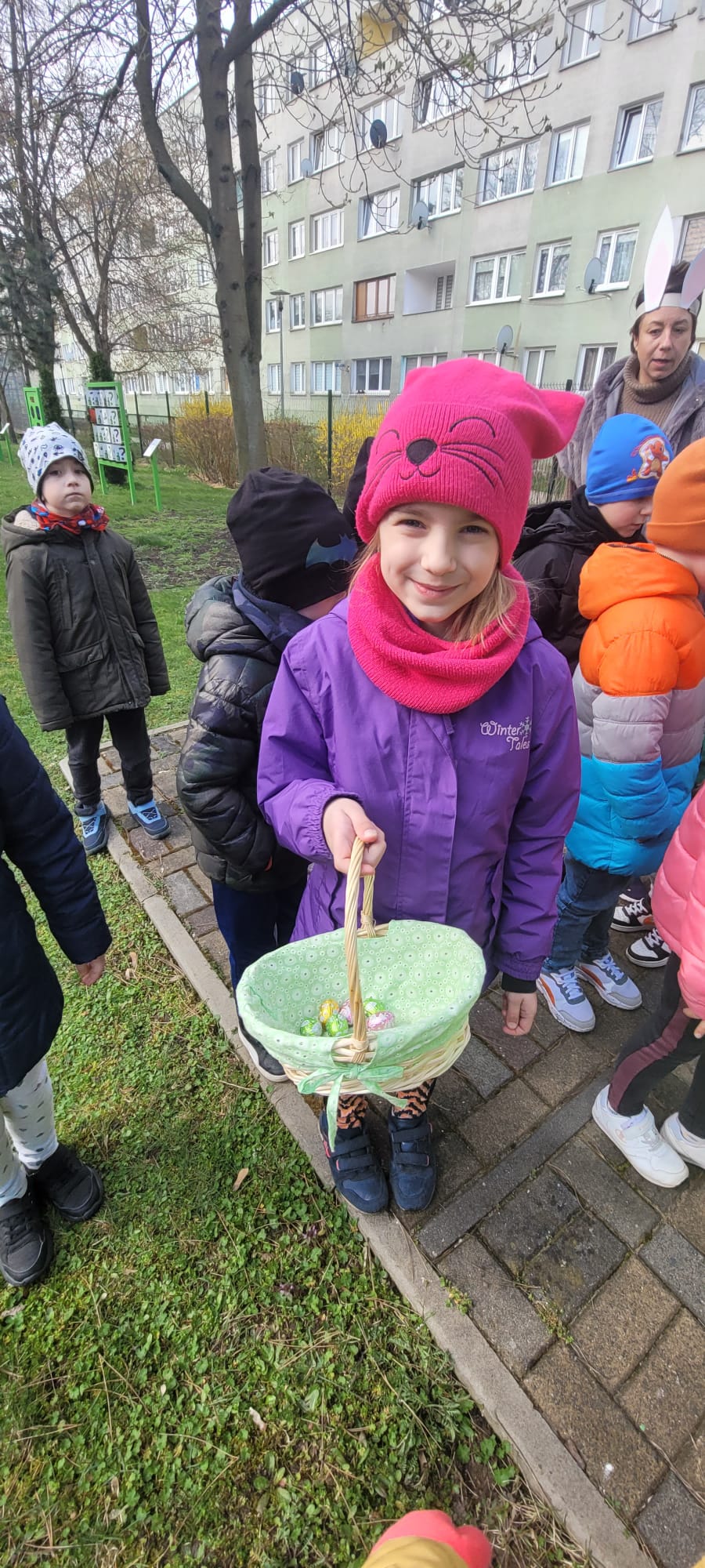 Zajączek przykicał, nie tylko z niespodziankami dla dzieci, ale również z zadaniami, które musiały wykonać, aby otrzymać słodki upominek. Zabawa była przednia i z jajem, dosłownie z jajem bo dzieci musiały pokonać tor przeszkód z jajkiem na łyżce i nie tylko. Z naszego przedszkolnego ogrodu dochodził radosny śmiech dzieci i Wielkanocnego Zajączka, podczas znajdowania poukrywanych czekoladowych jajeczek.