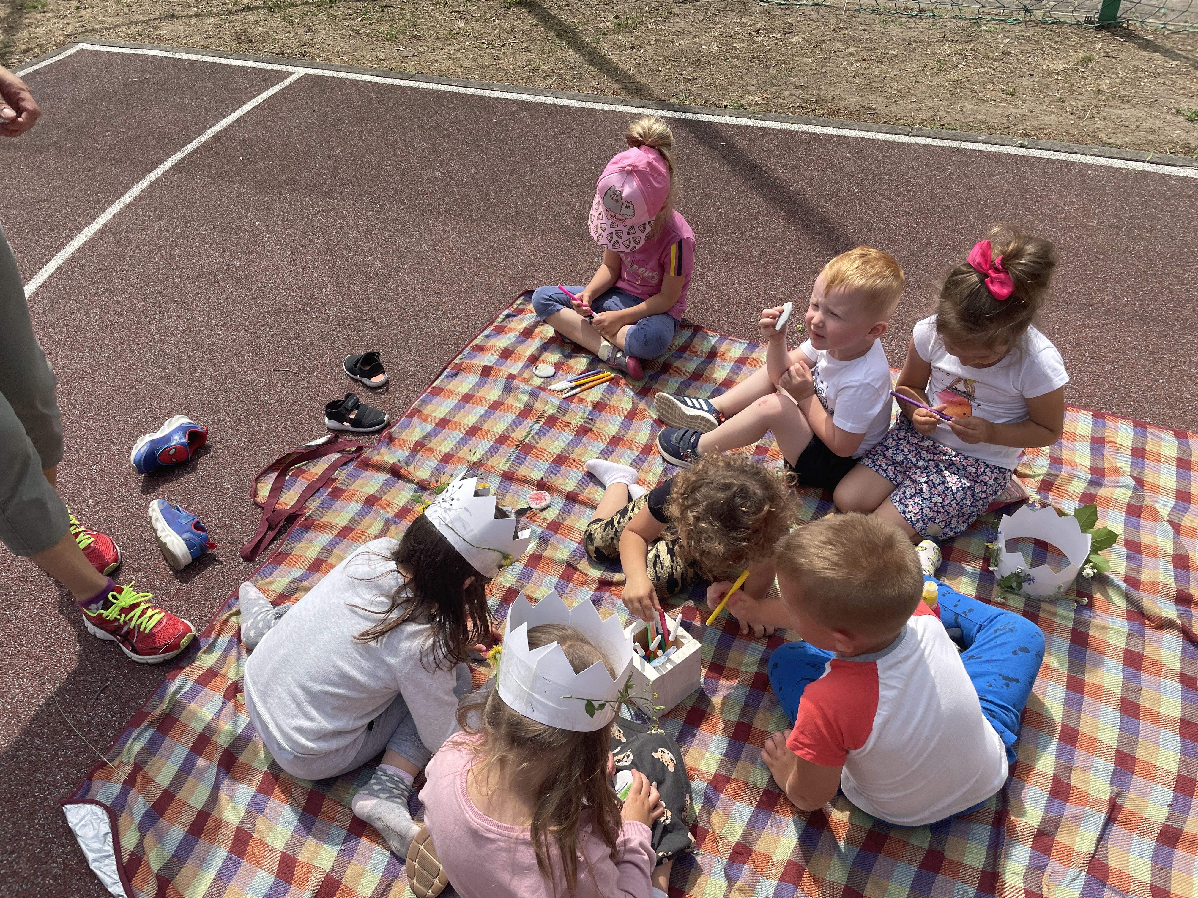 Później rozpoczęły się zabawy, które sprawiły wszystkim wiele radości – „Roślinne korony”, „Ozdabianie glinianych kamieni”, „Malowanie gałązek”, rzucanie balonami z wodą. Rodzice przygotowali dla dzieci pizzę oraz słodki poczęstunek w postaci babeczek i ciasta.