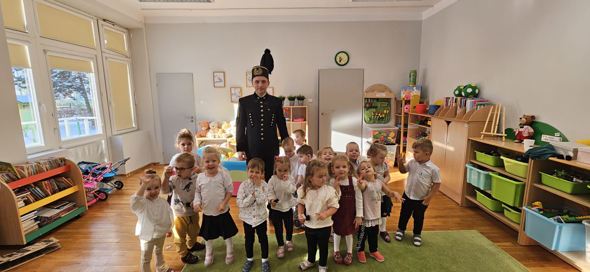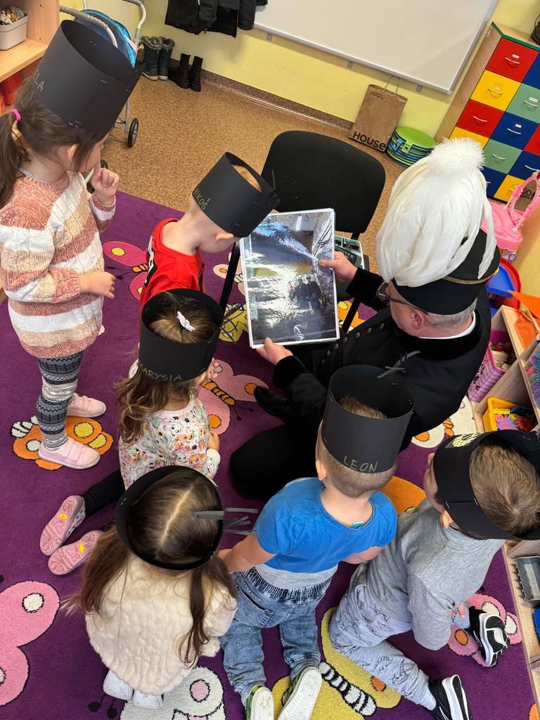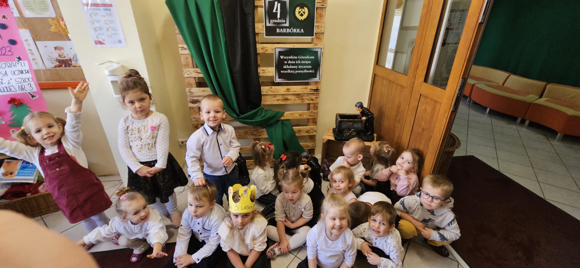 z ciekawostkami dotyczącej swojej pracy. Przedstawili dzieciom przepiękną historię o Świętej Barbarze – patronce górników. Przedszkolaki dowiedziały się, że górnicy wydobywają nie tylko miedź, ale i węgiel, że górnicy witają się i żegnają słowami- „Szczęść Boże”. Panowie górnicy przybyli do nas w stroju galowym. Dlatego dzieci miały okazję przyjrzeć się z bliska mundurowi, czapce górniczej, odznaczeniom, które górnicy otrzymują za długoletnią, ciężką pracę w kopalni. Panowie górnicy wyjaśnili dzieciom, jakie znaczenie mają kolory pióropuszy na czapce i kto je nosi. Przedszkolaki chętnie i z zaciekawieniem wysłuchały opowieści. W trakcie wizyty zadawały wiele pytań, na które gość chętnie odpowiadał. Miały również możliwość założenia czapki górniczej – czako oraz wysłuchania bajki czytanej przez gościa.
