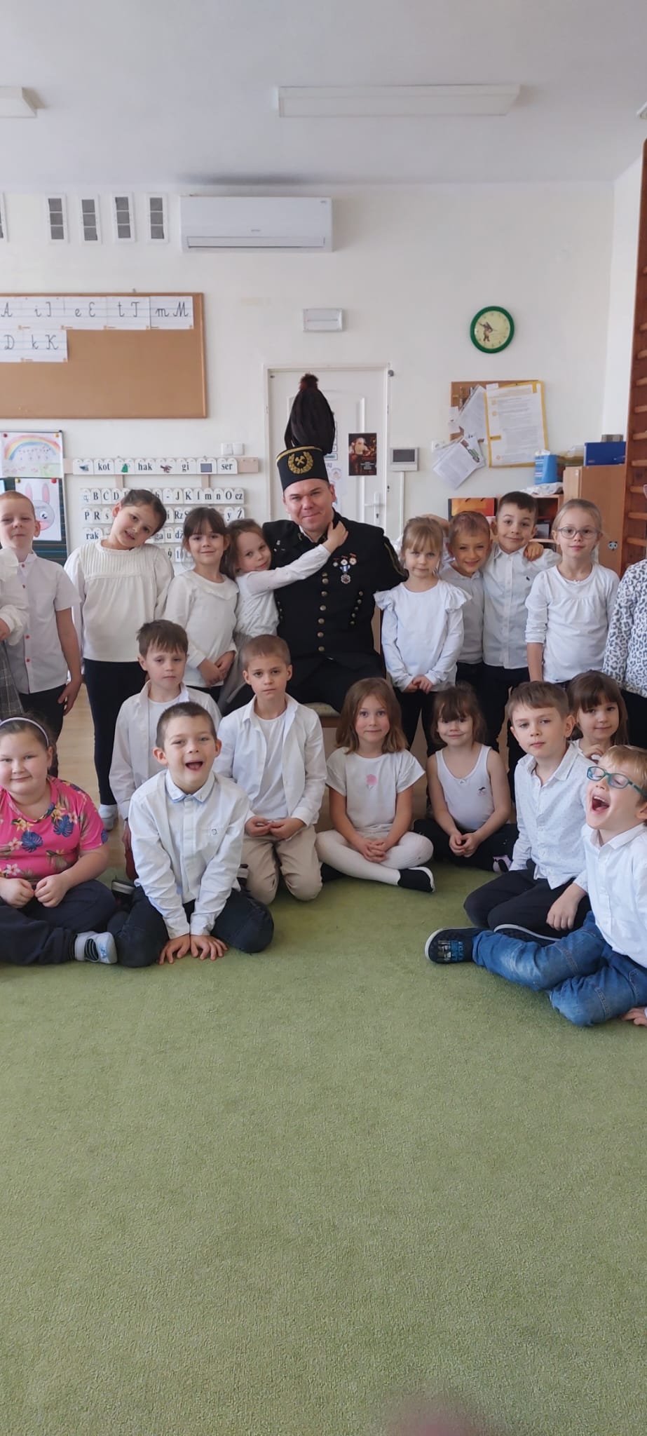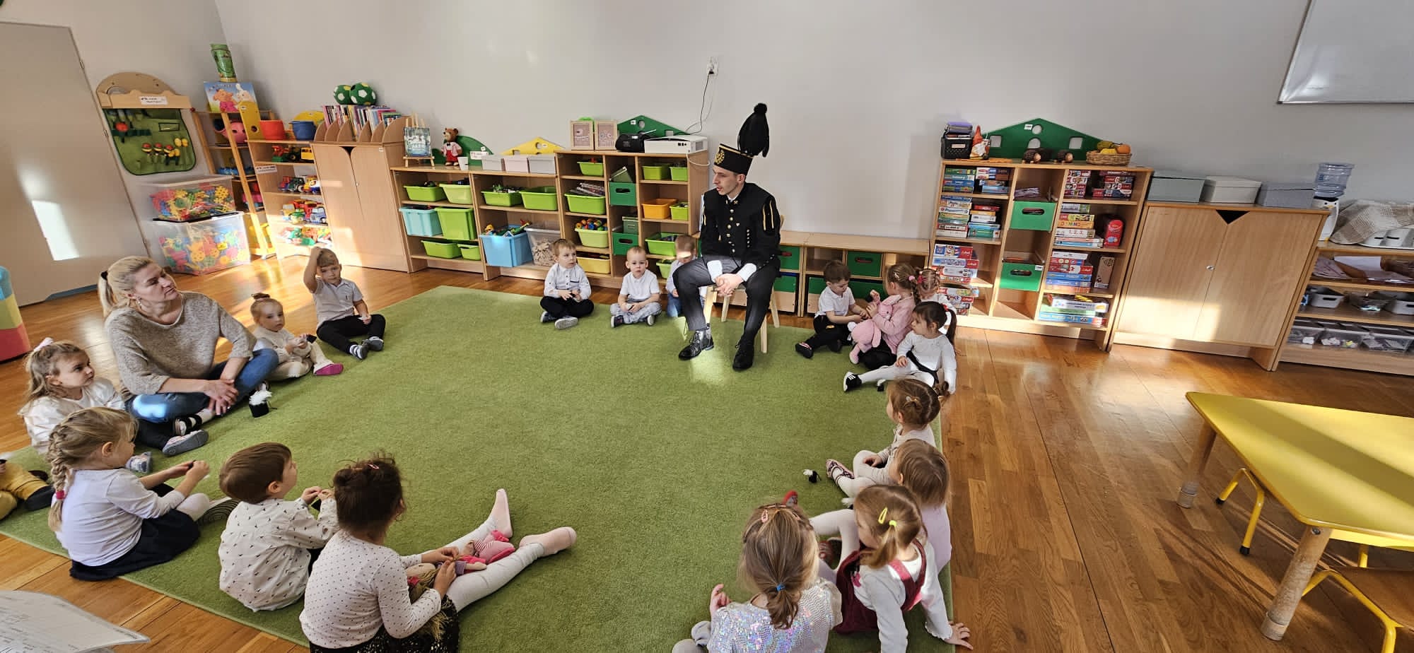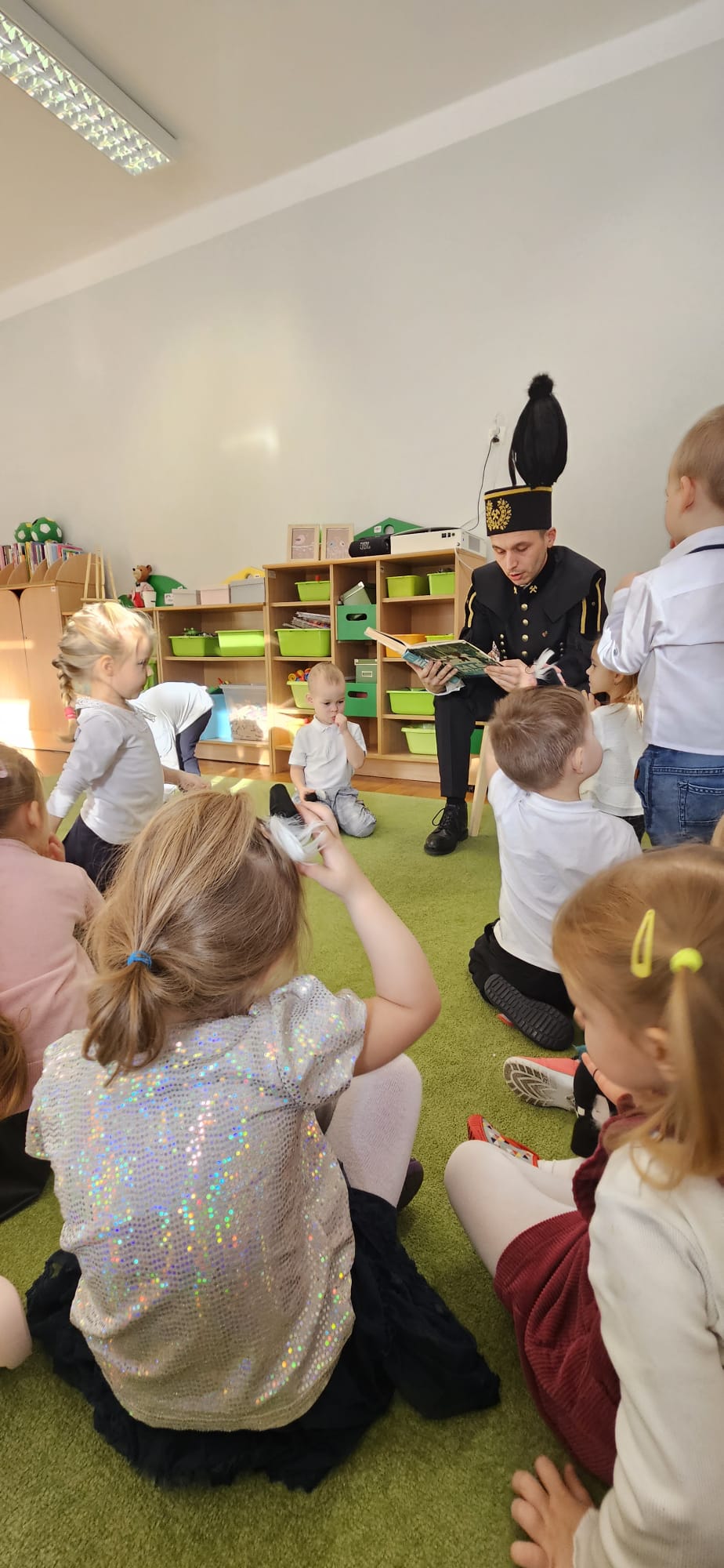 z ciekawostkami dotyczącej swojej pracy. Przedstawili dzieciom przepiękną historię o Świętej Barbarze – patronce górników. Przedszkolaki dowiedziały się, że górnicy wydobywają nie tylko miedź, ale i węgiel, że górnicy witają się i żegnają słowami- „Szczęść Boże”. Panowie górnicy przybyli do nas w stroju galowym. Dlatego dzieci miały okazję przyjrzeć się z bliska mundurowi, czapce górniczej, odznaczeniom, które górnicy otrzymują za długoletnią, ciężką pracę w kopalni. Panowie górnicy wyjaśnili dzieciom, jakie znaczenie mają kolory pióropuszy na czapce i kto je nosi. Przedszkolaki chętnie i z zaciekawieniem wysłuchały opowieści. W trakcie wizyty zadawały wiele pytań, na które gość chętnie odpowiadał. Miały również możliwość założenia czapki górniczej – czako oraz wysłuchania bajki czytanej przez gościa.