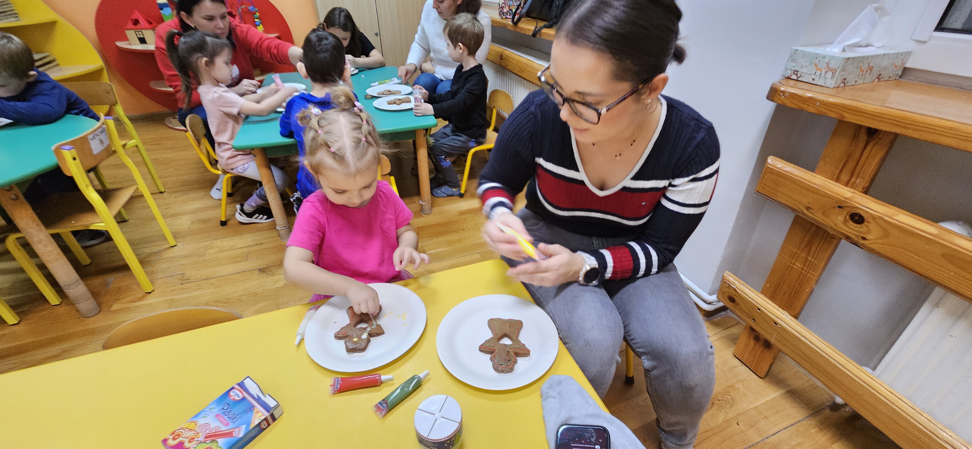 o tematyce świątecznej. Wspólnie została ubrana sensoryczna choinka, następnie wszyscy uczestnicy wzięli udział w Mikołajowej jodze. Na koniec warsztatów z zapałem zostały ozdobione aromatyczne pierniczki według pomysłów dzieci, które wykazały się przy tym pomysłowością