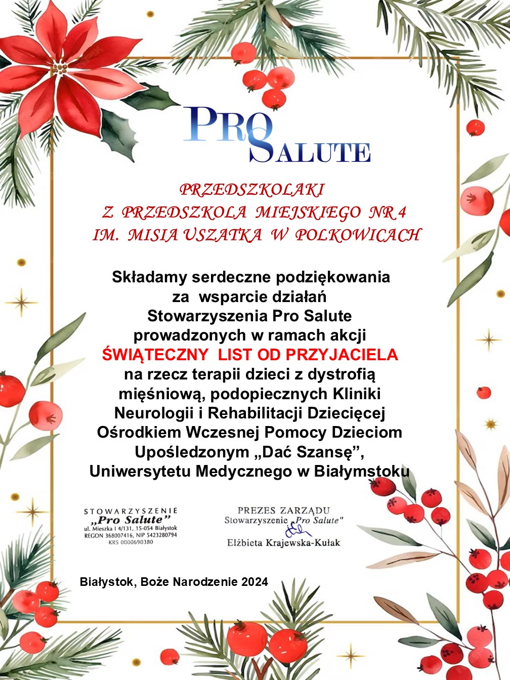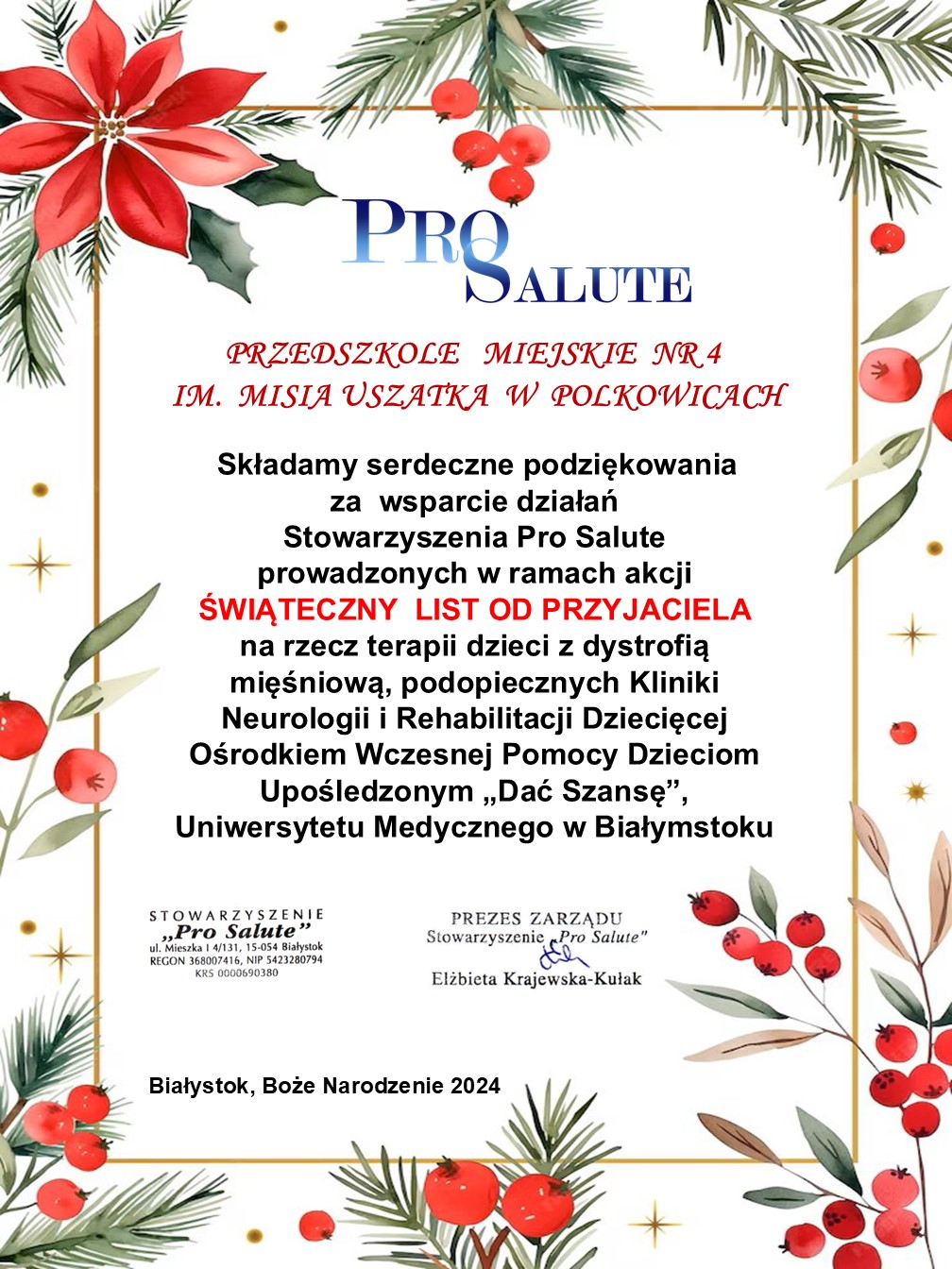 W grudniu 2024 roku cała społeczność przedszkola wzięła udział w Świątecznej Akcji Charytatywnej pt. „Świąteczny List od Przyjaciela”, która została zorganizowana przez Stowarzyszenie „Pro Salute” z Białegostoku.