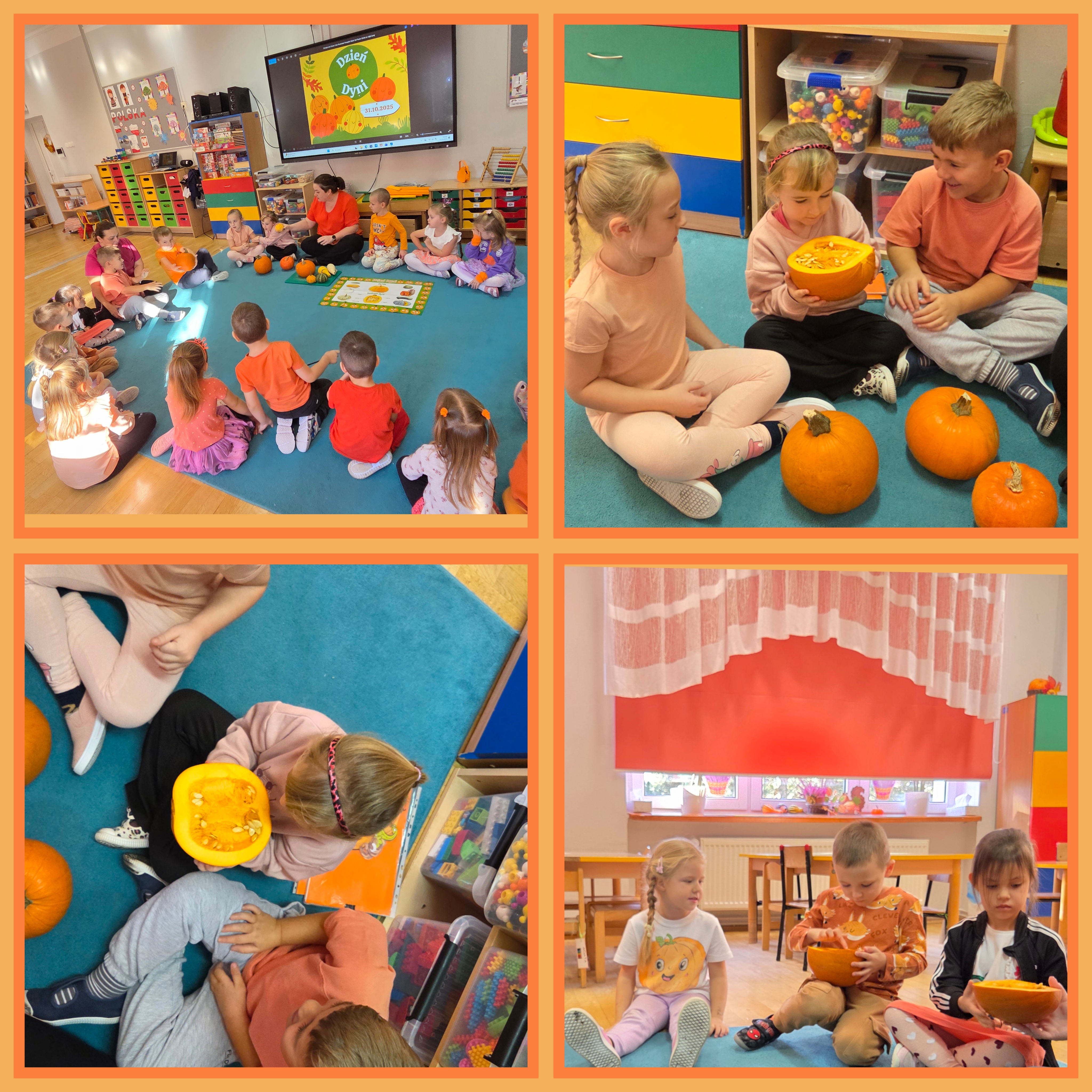 W dniu 31 października dzieci z grupy Wróbelki obchodziły Dzień Dyni – wyjątkowe święto, podczas którego dzieci miały okazję poznać to niezwykłe warzywo z różnych stron. Sala została udekorowana w barwach pomarańczowych, co wprowadziło wszystkich w jesienny, radosny nastrój. Na początku zajęć dzieci zapoznały się z różnymi rodzajami dyń – mogły je obejrzeć, porównać ich kształty, kolory i wielkości. Wspólnie dokonaliśmy również przekroju prawdziwej dyni, aby zobaczyć, jak wygląda w środku, poznać jej zapach oraz budowę. Dzieci z dużym zainteresowaniem oglądały pestki i miąższ dyni. W dalszej części dnia przedszkolaki uczestniczyły w zabawach matematycznych z dynią – przeliczały dynie, segregowały je według wielkości i koloru oraz układały proste rytmy z dyniowych ilustracji.