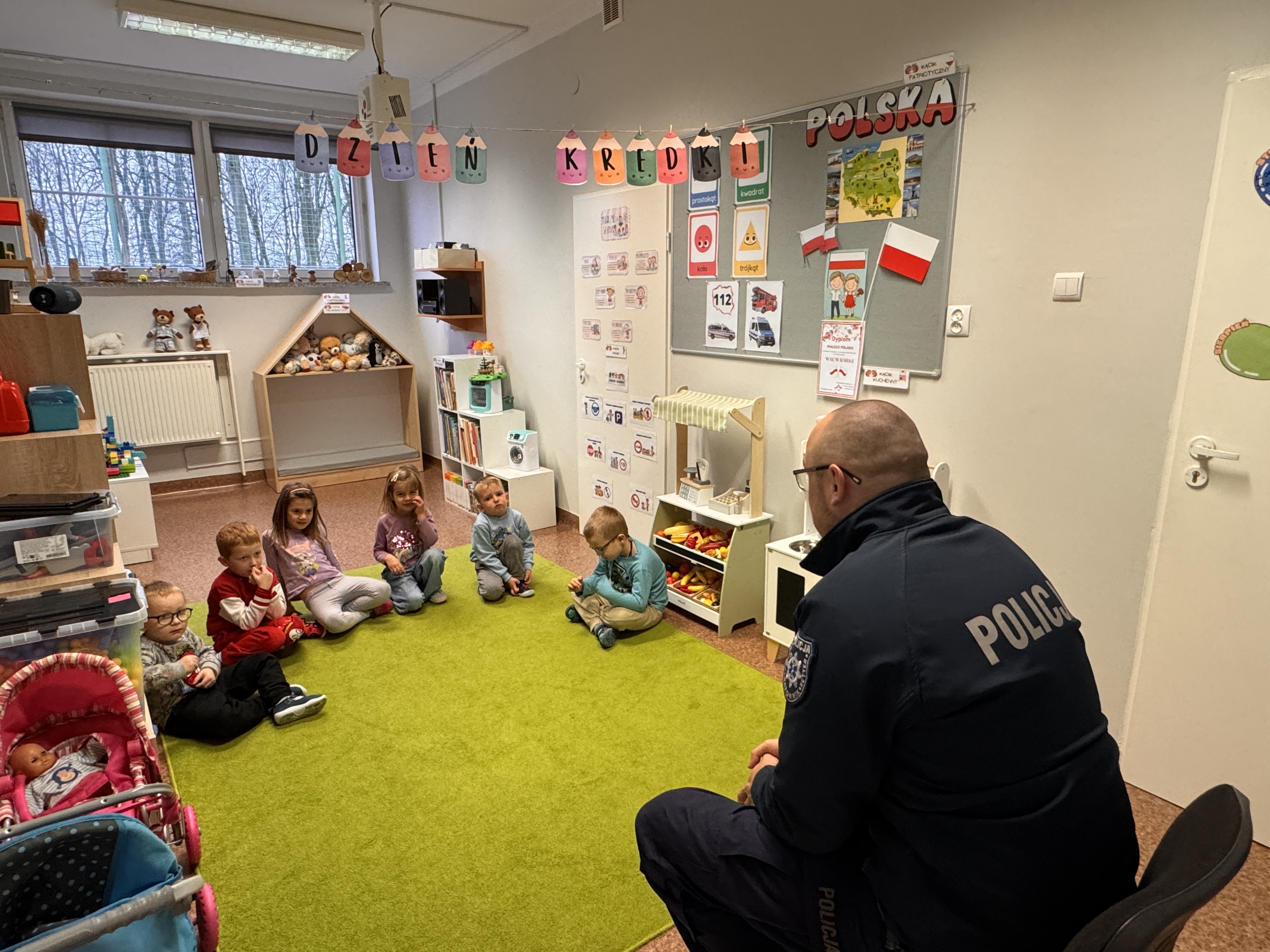 Tematem przewodnim spotkania było bezpieczeństwo. Asp. szt. Radosław Konarski z polkowickiego posterunku policji rozmawiał z dziećmi o bezpiecznym zachowaniu się w przedszkolu, w domu i na drodze. Dzieci dowiedziały się jak trzeba postępować w kontakcie z obcym psem, ćwiczyły pozycję bezpieczną a także jak należy poruszać się po drodze, utrwaliły sobie właściwe przechodzenie przez jezdnię. Pan Policjant wyjaśnił też przedszkolakom jak należy podróżować samochodem, jaką rolę pełnią pasy bezpieczeństwa oraz jak ważne są elementy odblaskowe dla pieszego. Dzieci z dużym zainteresowaniem słuchały rad i wskazówek zaproszonego gościa.