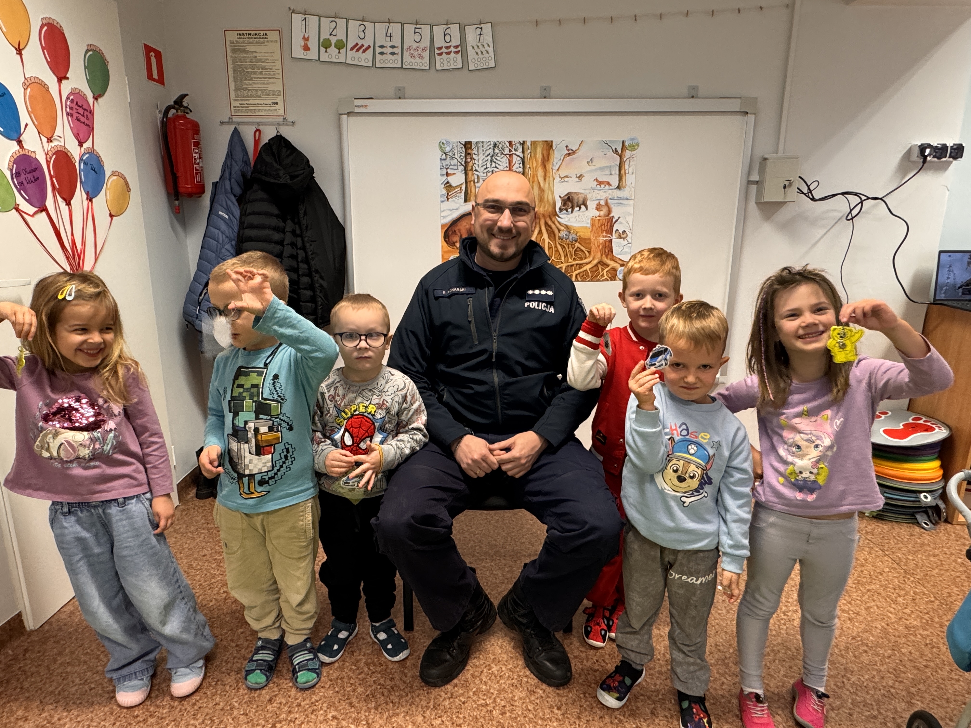 24 listopada 2025r. odbyła się w grupie Wiewiórki wizyta dzielnicowego, która była dla przedszkolaków dużym przeżyciem. To niecodzienne spotkanie było okazją do porozmawiania o ich bezpieczeństwie. Nie zabrakło również cennych porad, odblasków i wspólnej zabawy.