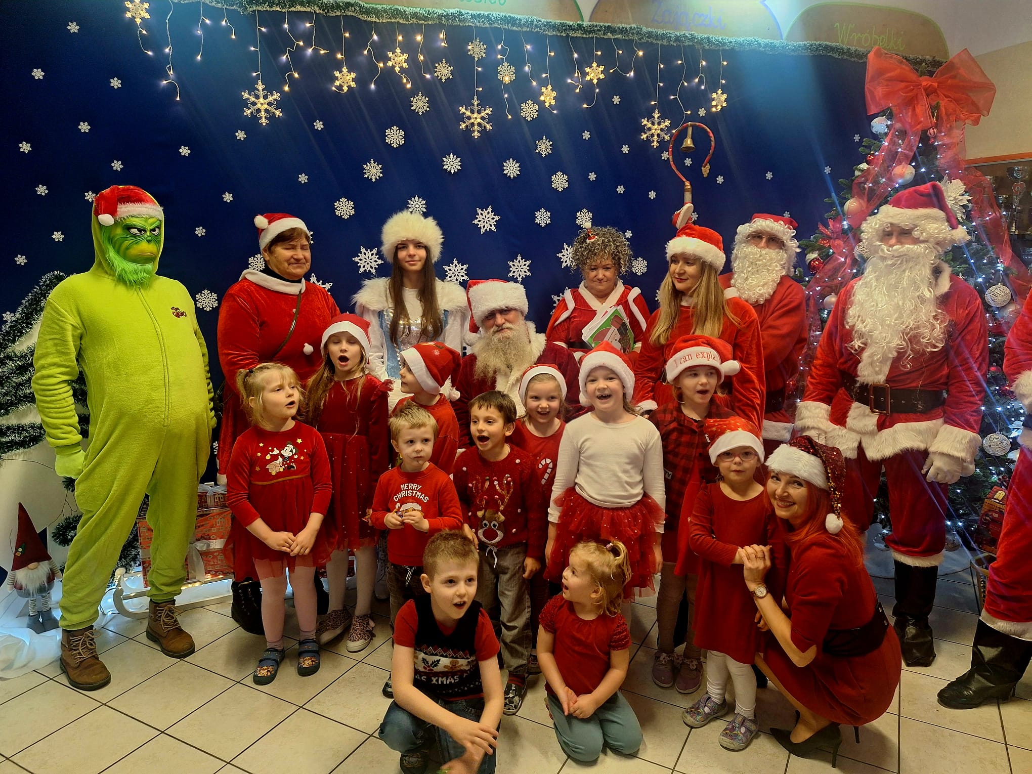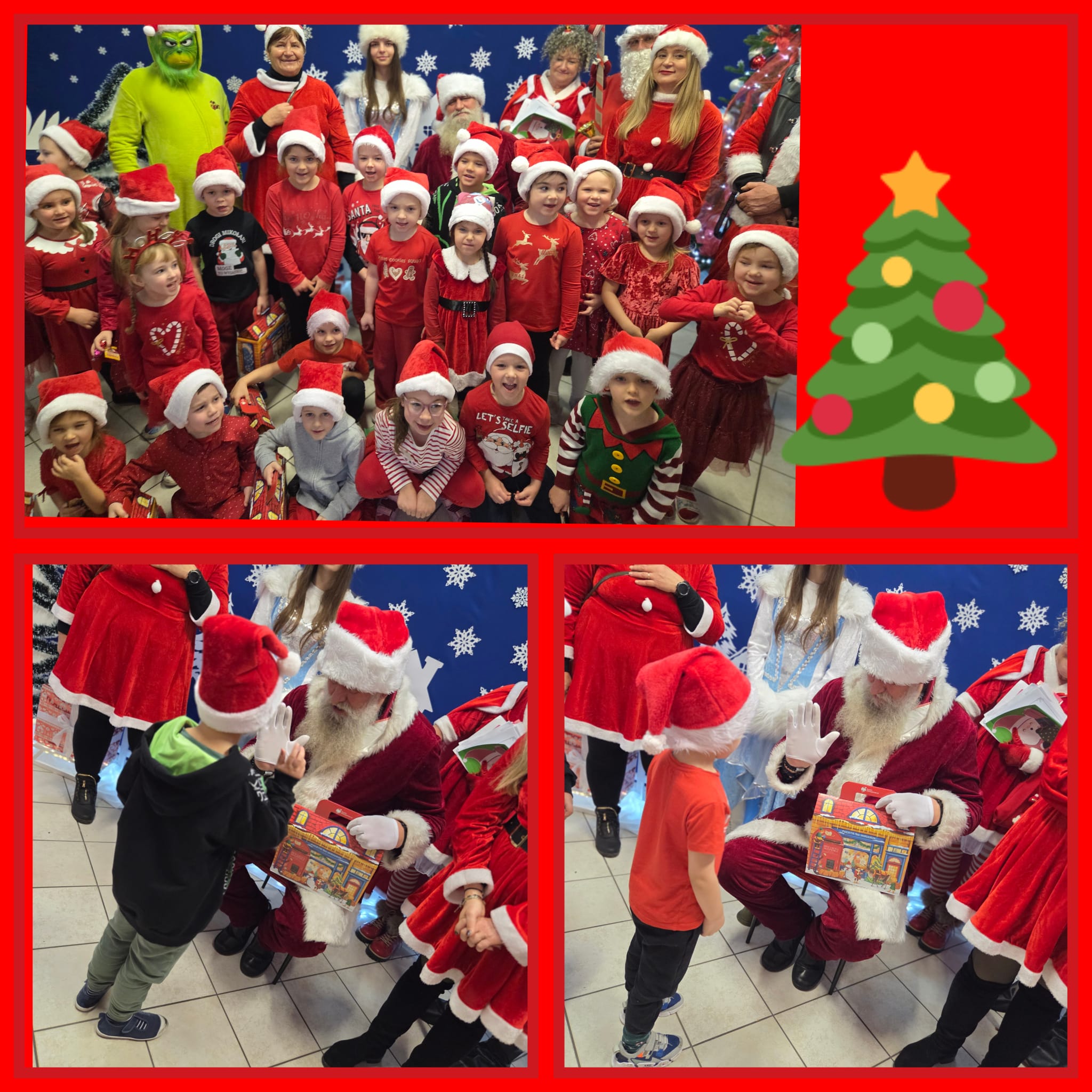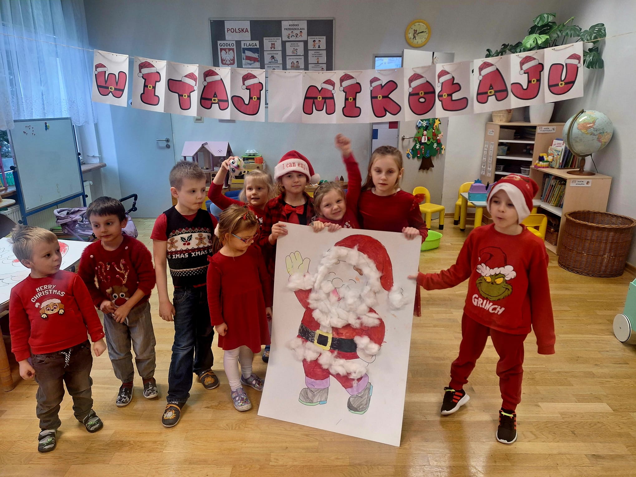 Od rana wszyscy z niecierpliwością spoglądaliśmy za okno i wypatrywaliśmy pojazdów Mikołaja. Nagle! Trąbienie klaksonów i pojawił się świąteczny zaprzęg Mikołaja. Z uśmiechem przywitaliśmy Mikołaja, jego pomocników, a nawet Grincha. Mikołaj zapytał, czy byliśmy grzeczni. Oczywiście, że tak! Każda z grup zaśpiewała piosenkę, a Mikołaj wręczył nam piękne prezenty.