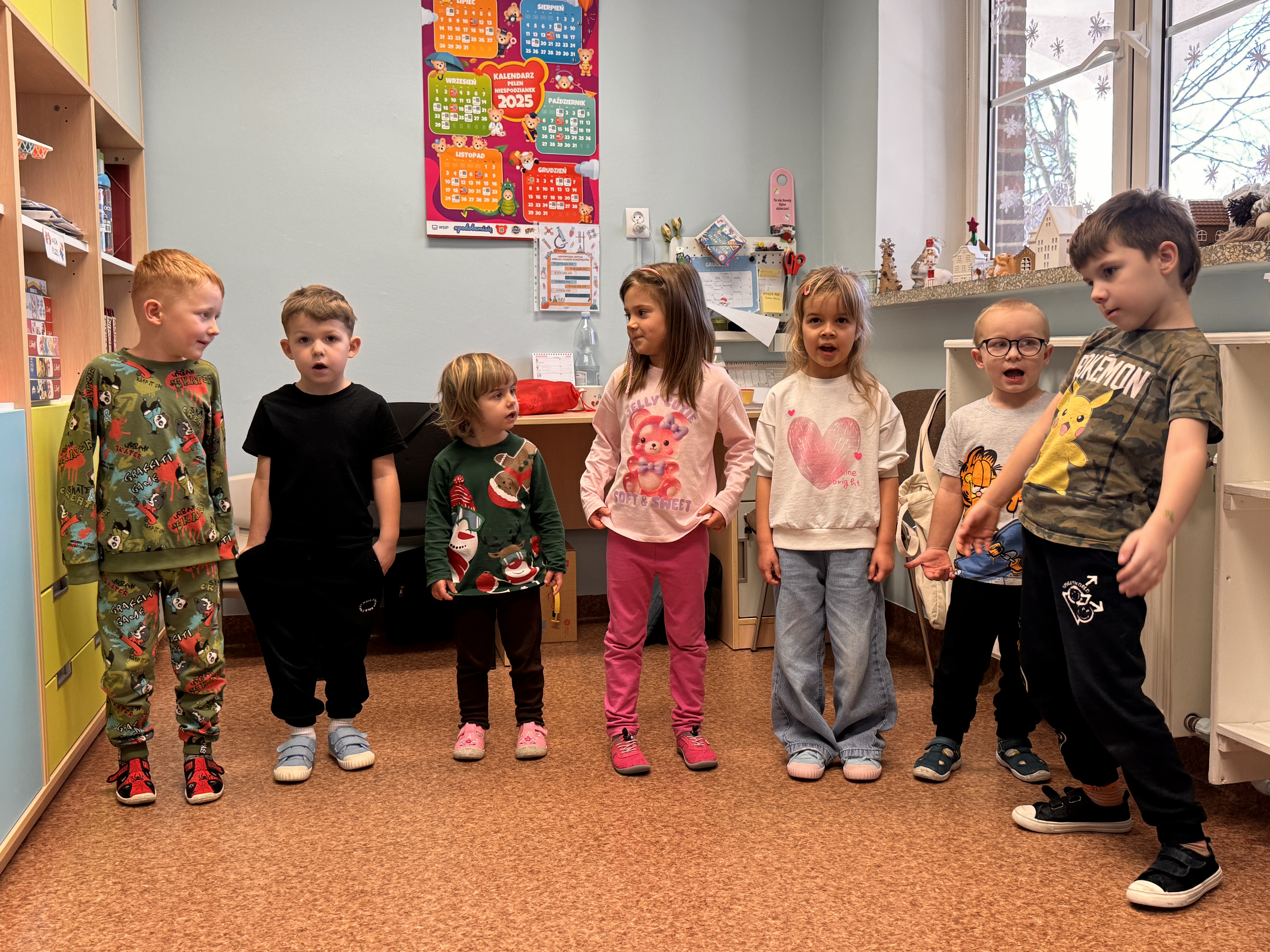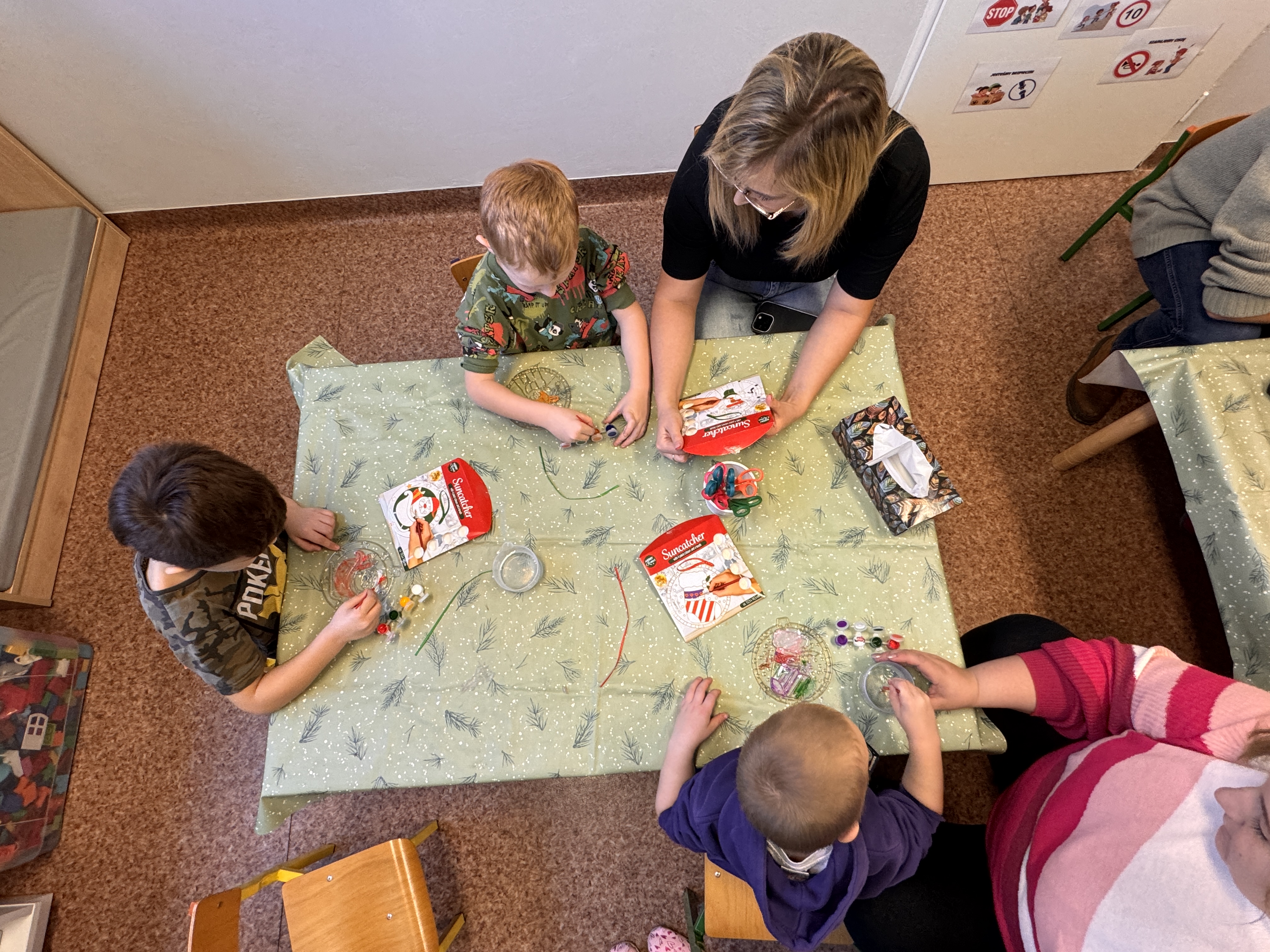 Spotkanie rozpoczęło się od występu dzieci, które zaśpiewały piosenkę „Mikołaj tu, Mikołaj tam”. Następnie przedszkolaki wraz z rodzicami zabrały się do pracy plastycznej. Wspólnie tworzyli ozdoby z drewnianych koralików, bombki ze śniegiem, drewniane oraz witrażowe bombki a w przerwach twórczych działań, rodzice skosztowali upieczone przez dzieci pierniczki oraz bawili się z nimi gumą sensoryczną.