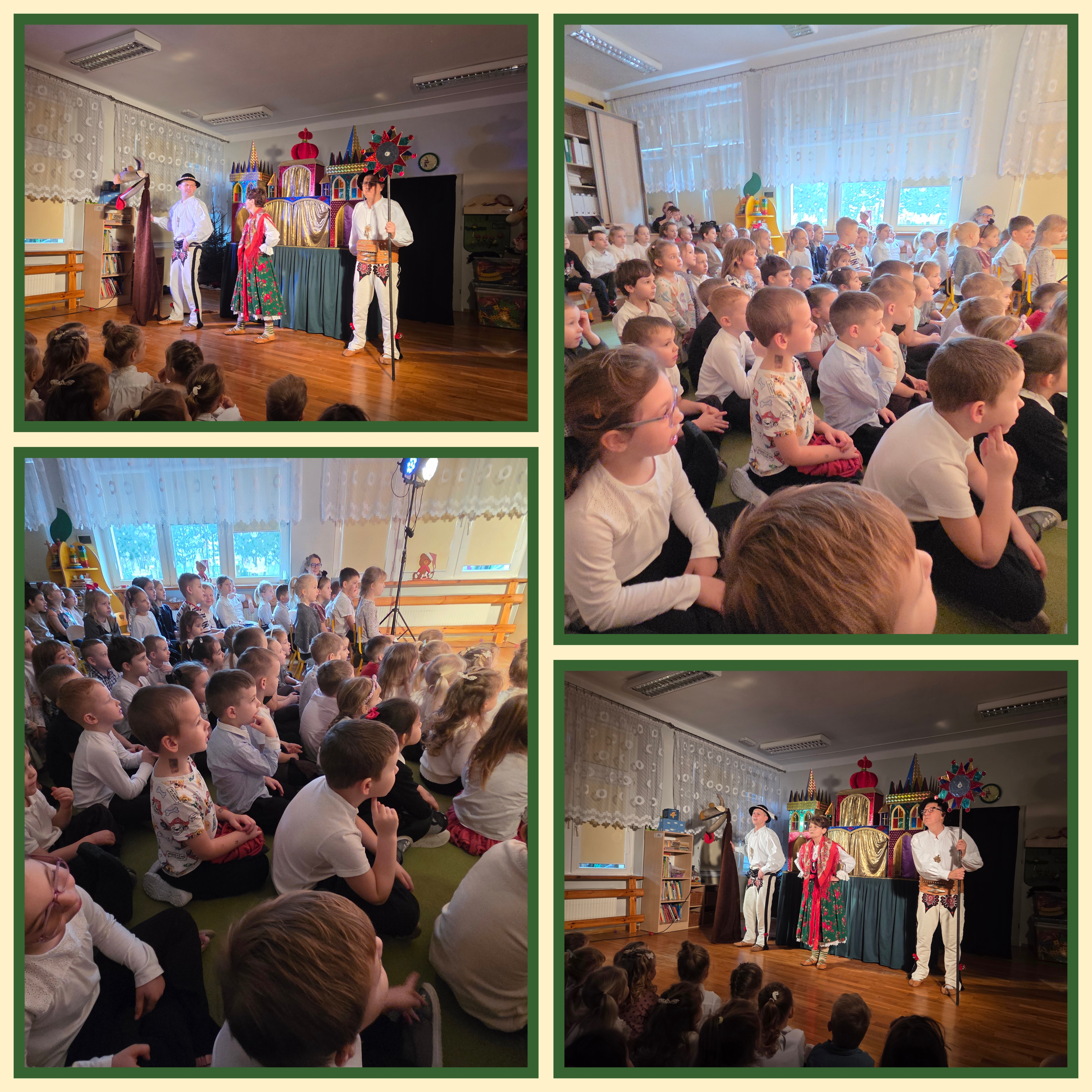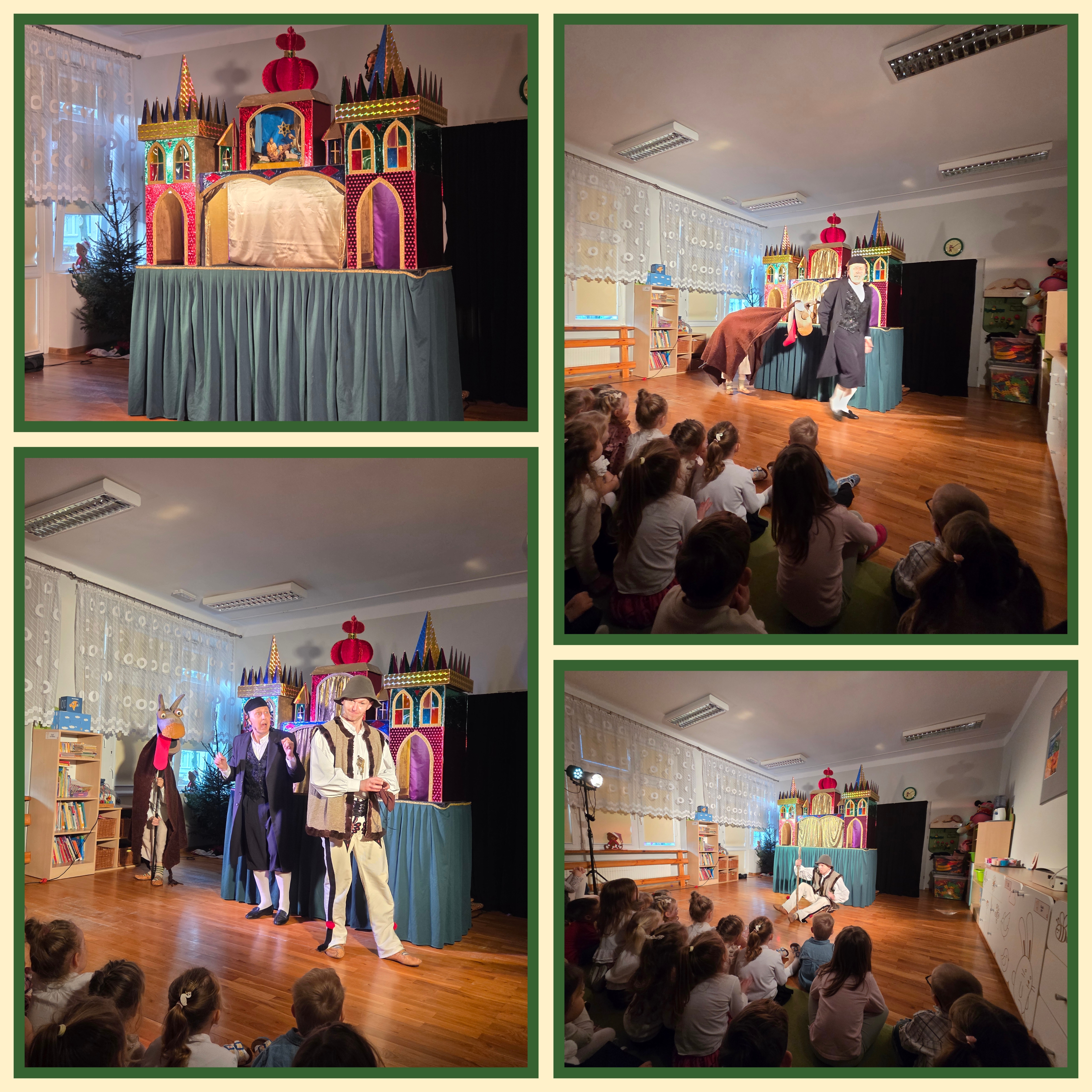 W naszym przedszkolu 9 grudnia 2025 odbył się niezwykły teatrzyk pt. Hej kolęda ! nawiązujący do bardzo starej polskiej tradycji kolędowania – chodzenia z szopką, jednej z najstarszych form teatru lalek silnie związanej z polską kulturą i obyczajowością. Dzieci obejrzały wielowątkową historię o zwiastowaniu, o pasterzach podążających do Betlejem oraz o Herodzie. Sceny te przedstawiane były przez przepiękne lalki w okazałej, ponad dwumetrowej szopce krakowskiej – niemalże repliki budowli stworzonych przez najsłynniejszych krakowskich szopkarzy, braci Ezenkierów. Wesołe intermedia w wykonaniu aktorów grających „w planie żywym” (w oryginalnych, ludowych strojach) ukazywały charakterystyczne dla szopki krakowskiej sceny z Żydem, Góralami, Dziadem i Babą oraz Maćkiem i Turoniem. Całość zakończyła się barwną rewią postaci świeckich. Aktorzy śpiewali kolędy z zapałem wiejskich kolędników, zachęcając do wspólnego śpiewu również nasze przedszkolaki. Język był subtelnie podbarwiony gwarą, lecz całkowicie zrozumiały. Historia była jednocześnie wzruszająca i zabawna, oparta na tradycyjnych tekstach szopkowych.