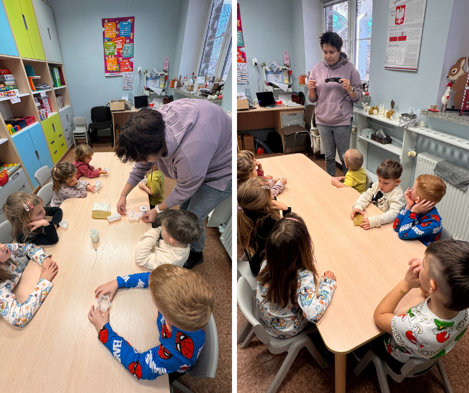 W grupie Wiewiórki odbyły się warsztaty tworzenia świec sojowych. Poprowadziła je Pani Weronika – mama Poli B. Podczas zajęć dzieci dowiedziały się o różnych rodzajach wosku, knotów i kompozycji zapachowych, a także o bezpiecznych metodach zalewania wosku i dodawania barwników, aby uzyskać unikalne i piękne świece.
