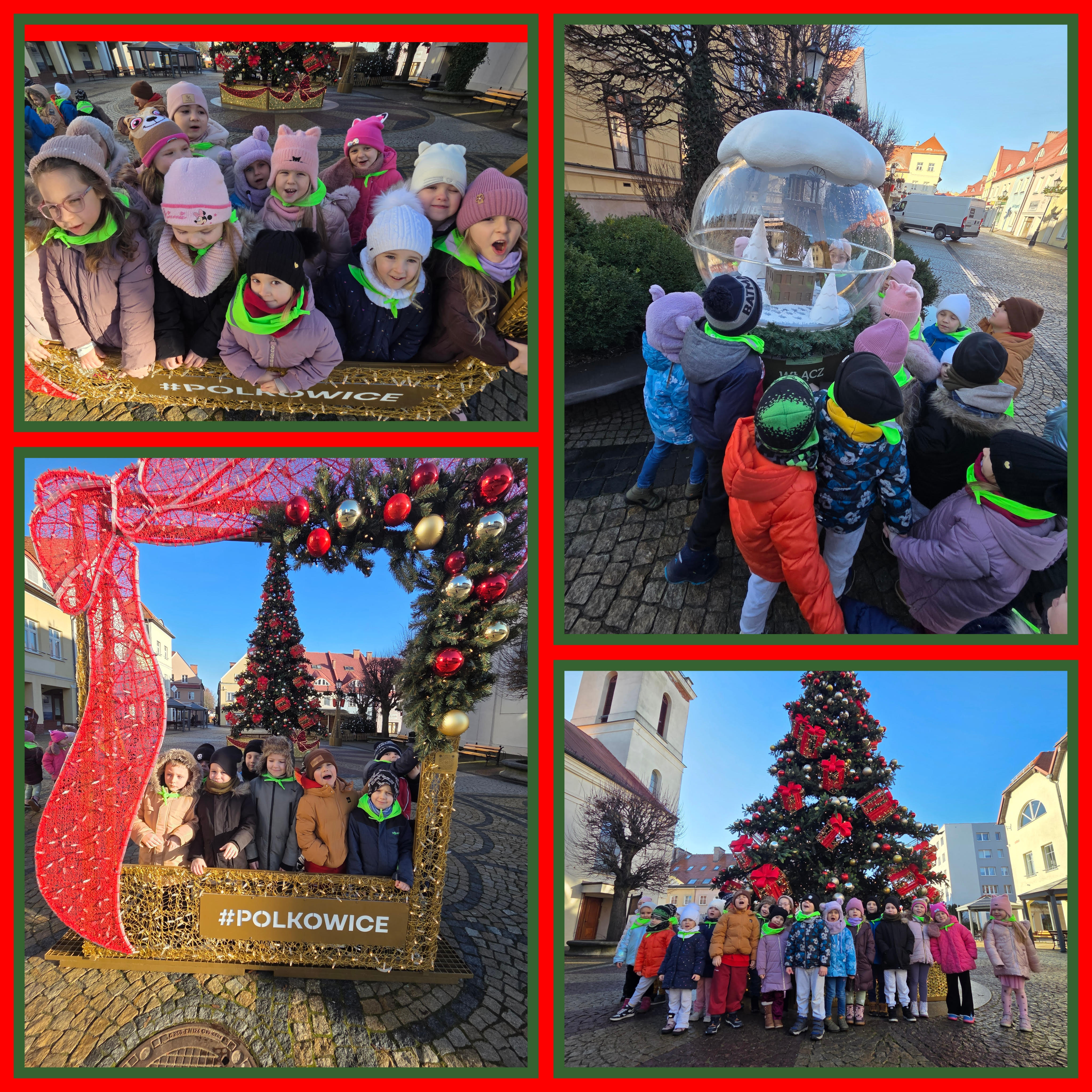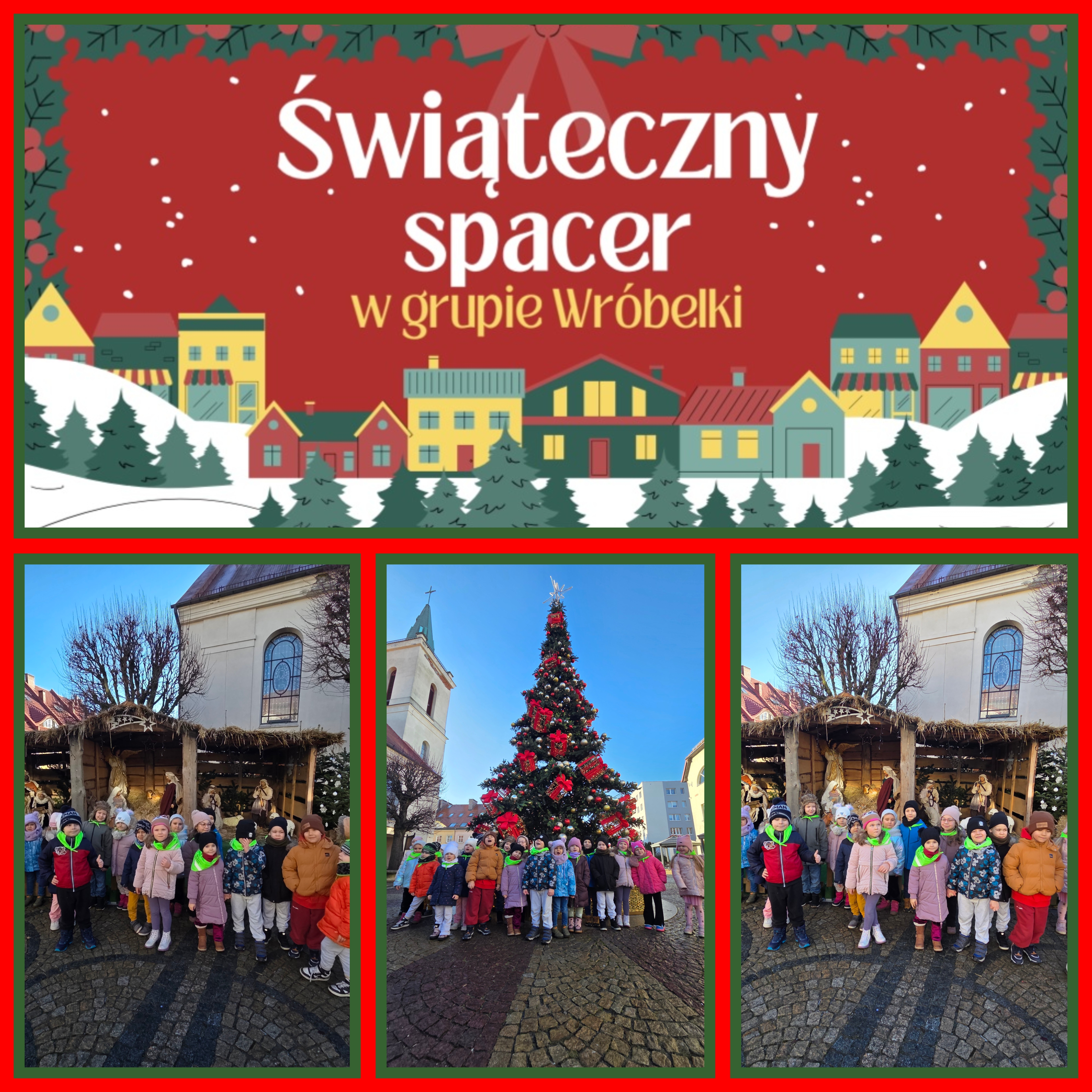 Dnia 18 grudnia 2025 dzieci z grupy Wróbelki w mroźne przedpołudnie uczestniczyły w świątecznym spacerze po okolicy. Podczas wyjścia miały okazję oglądać miejskie ozdoby bożonarodzeniowe oraz podziwiać pięknie udekorowane ulice. Szczególną atrakcją była wizyta na rynku Polkowic, gdzie dzieci z dużym zainteresowaniem oglądały okazałą choinkę oraz świąteczną szopkę. Spacer sprawił dzieciom wiele radości i pozwolił poczuć wyjątkową, świąteczną atmosferę.