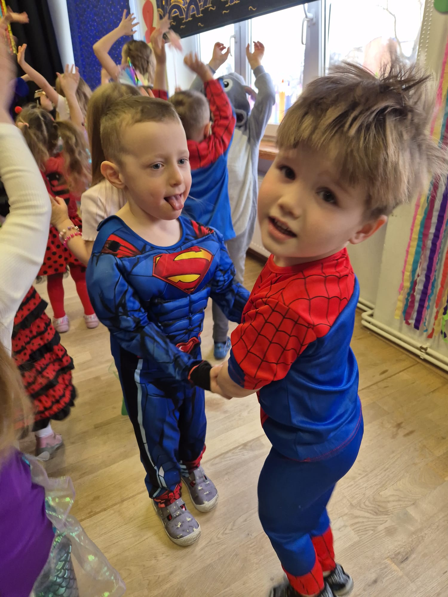 Bal karnawałowy przebiegał w radosnej i bezpiecznej atmosferze, a uśmiechy na twarzach dzieci były najlepszym dowodem na to, jak bardzo podobała im się wspólna zabawa. Wydarzenie to było doskonałą okazją do kształtowania umiejętności społecznych, współdziałania oraz kreatywnego wyrażania siebie.