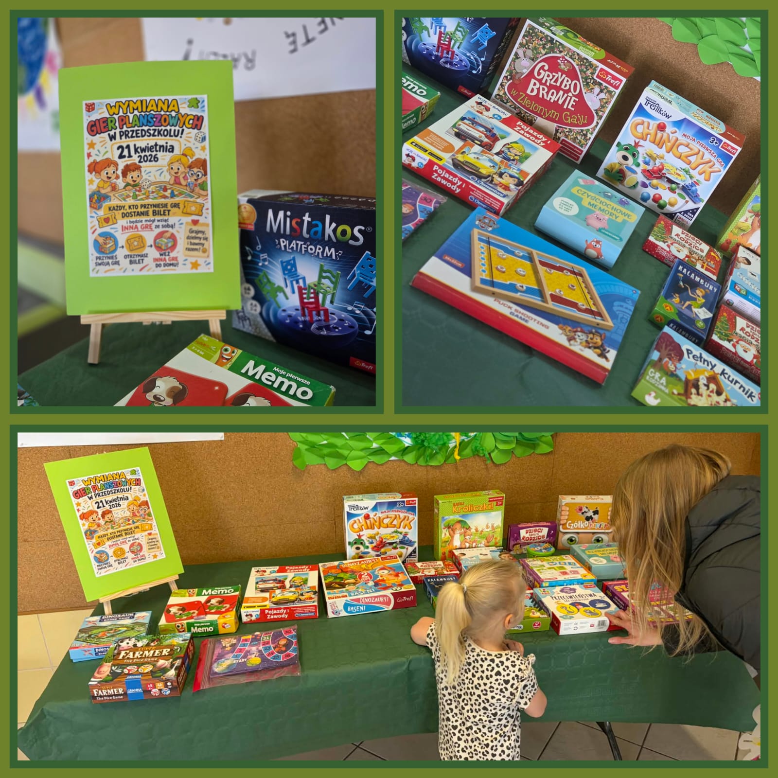 Dnia 21 kwietnia 2026 roku w ramach obchodów Polkowickiego Festiwalu Ziemi w naszym przedszkolu odbyła się akcja wymiany gier planszowych. Dzieci miały możliwość przyniesienia gier, z których już nie korzystają i wymienienia ich na inne. Inicjatywa spotkała się z dużym zainteresowaniem oraz radością przedszkolaków, którzy z entuzjazmem wybierali „nowe” gry do zabawy.