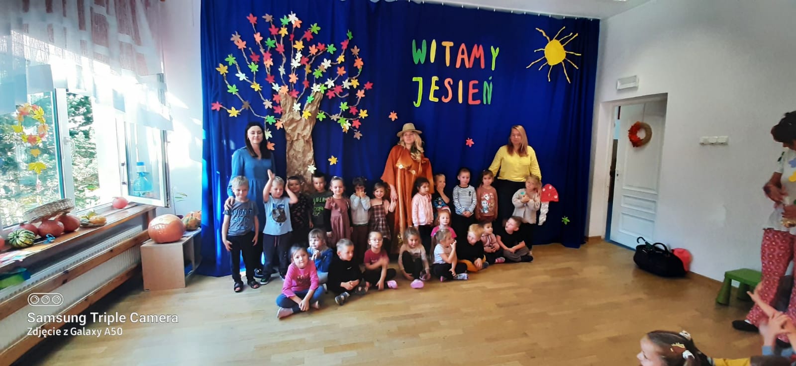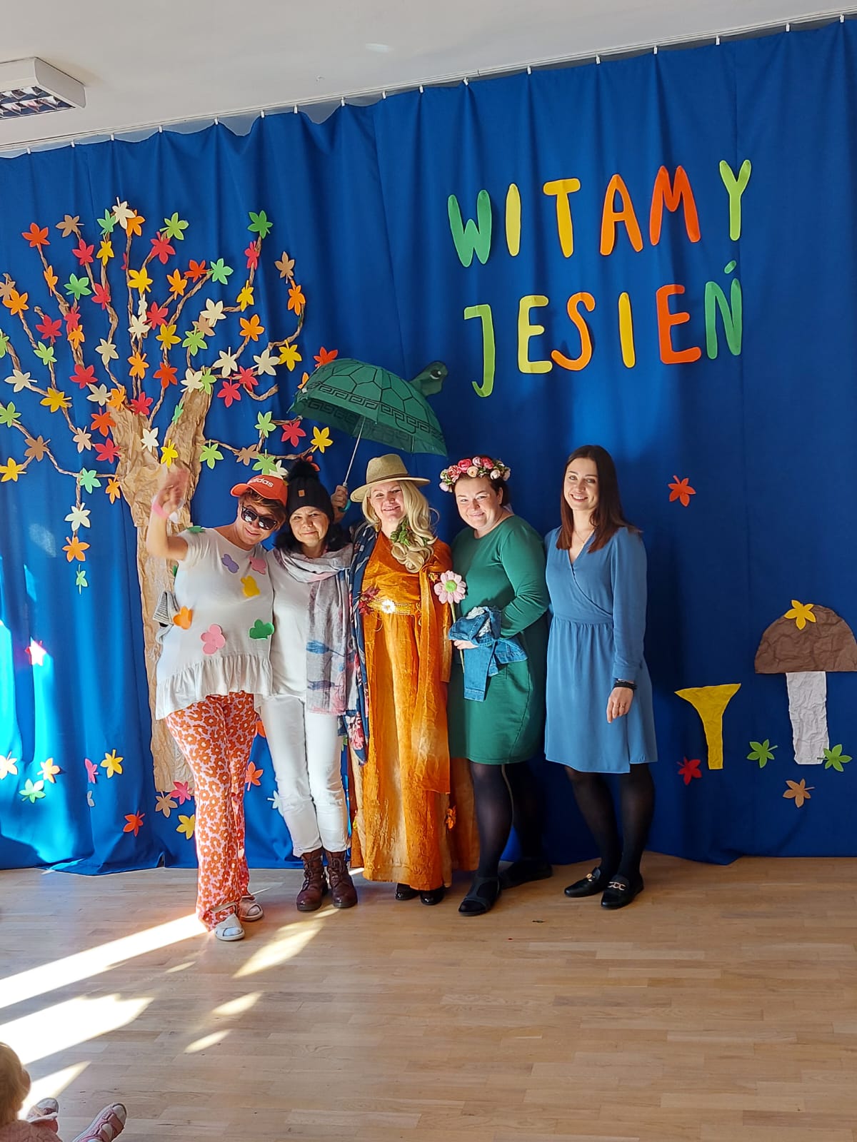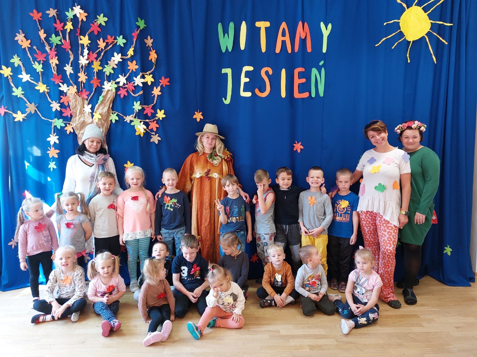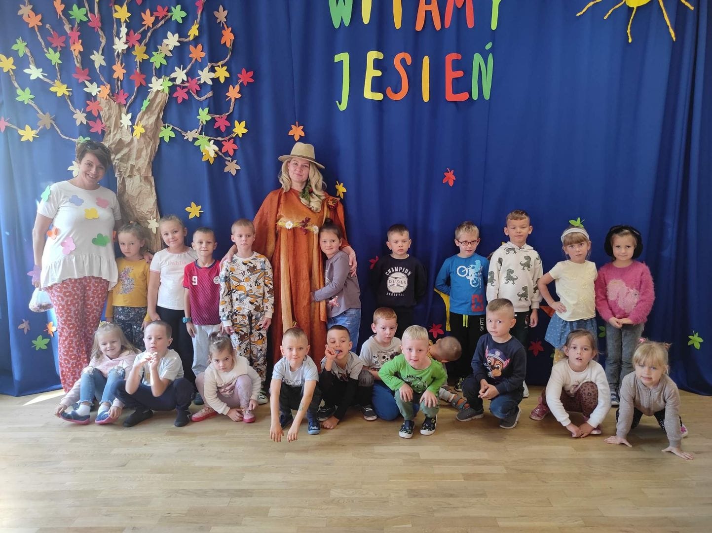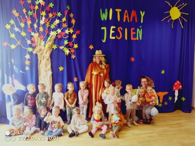 23 września 2022r. w naszym przedszkolu tradycyjnie odbyła się uroczystość Powitania Jesieni. Przedszkolaki obejrzały inscenizację „Gdzie jesteś, Jesieni?” w wykonaniu nauczycielek, która była przeplatana ruchowymi zabawami integracyjnymi. Dzieci miały okazję wykazać się wiedzą podczas rozwiązywania zagadek , rozpoznawania darów jesieni oraz porządkowania atrybutów pór roku. Grupa starszaków Wróbelki pięknie wykonała piosenkę „Kończy się lato”. Na zakończenie Pani Jesień obdarowała dzieci ciasteczkami- grzybkami i zaprosiła do wspólnego zdjęcia.