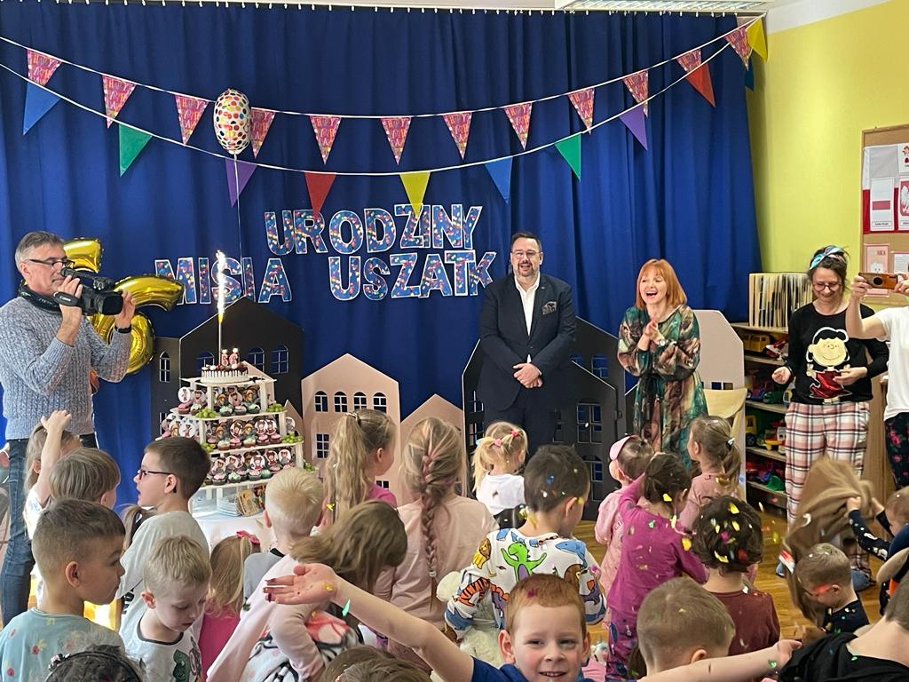 W dniu 06 marca 2023 świętowaliśmy kolejne Urodziny Misia Uszatka - patrona naszego przedszkola. Zabawę urodzinową rozpoczęliśmy od powitania zaproszonych gości, a wśród nich był Burmistrz Polkowic Pan Łukasz Puźniecki, były absolwent naszego przedszkola.