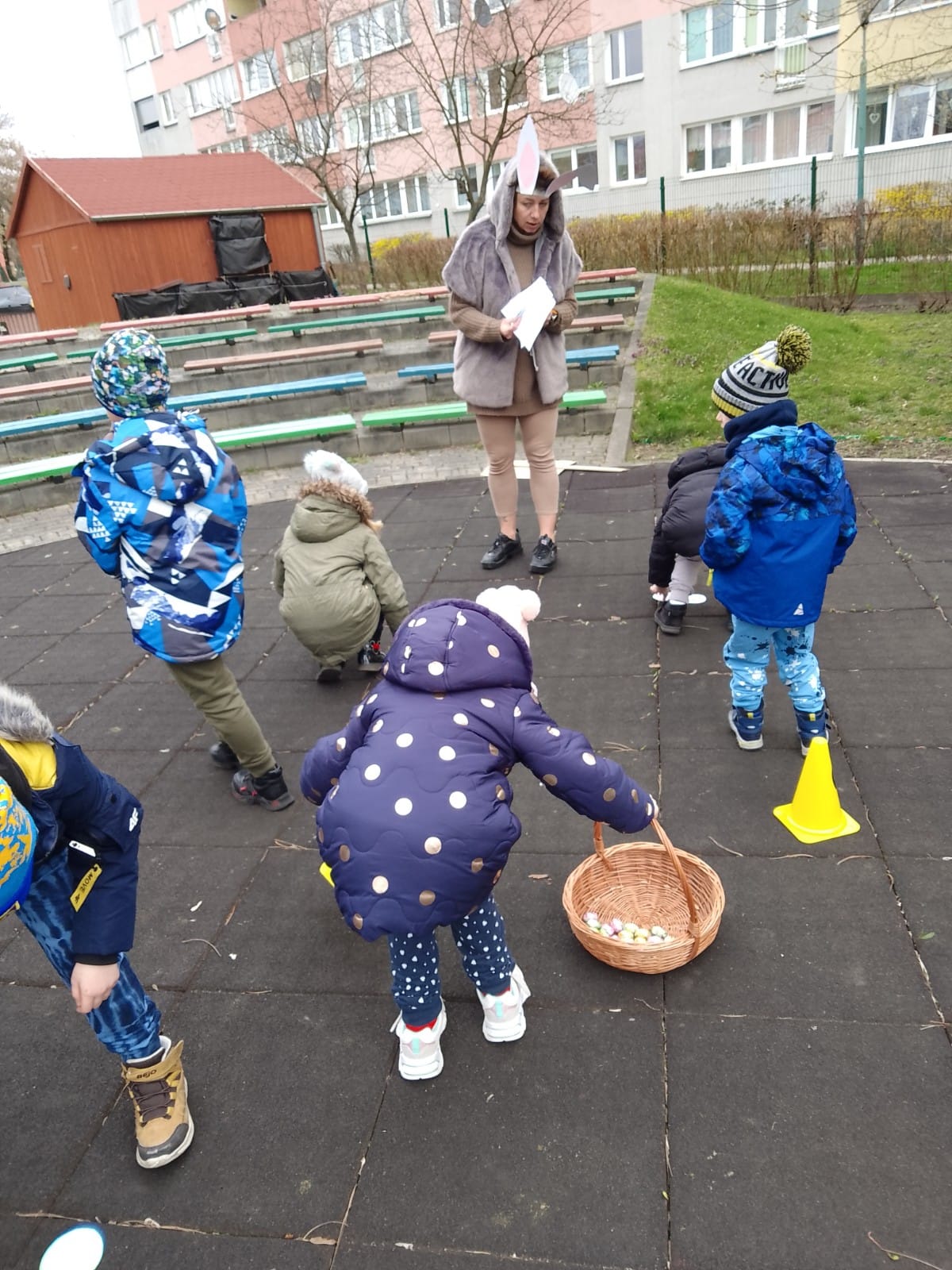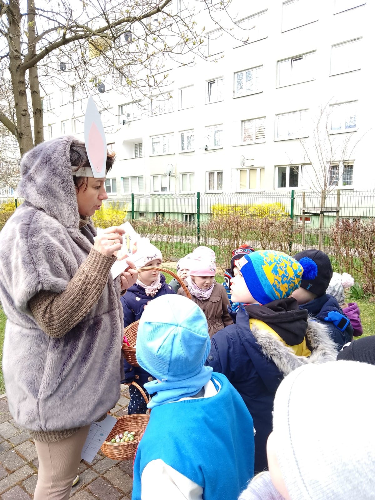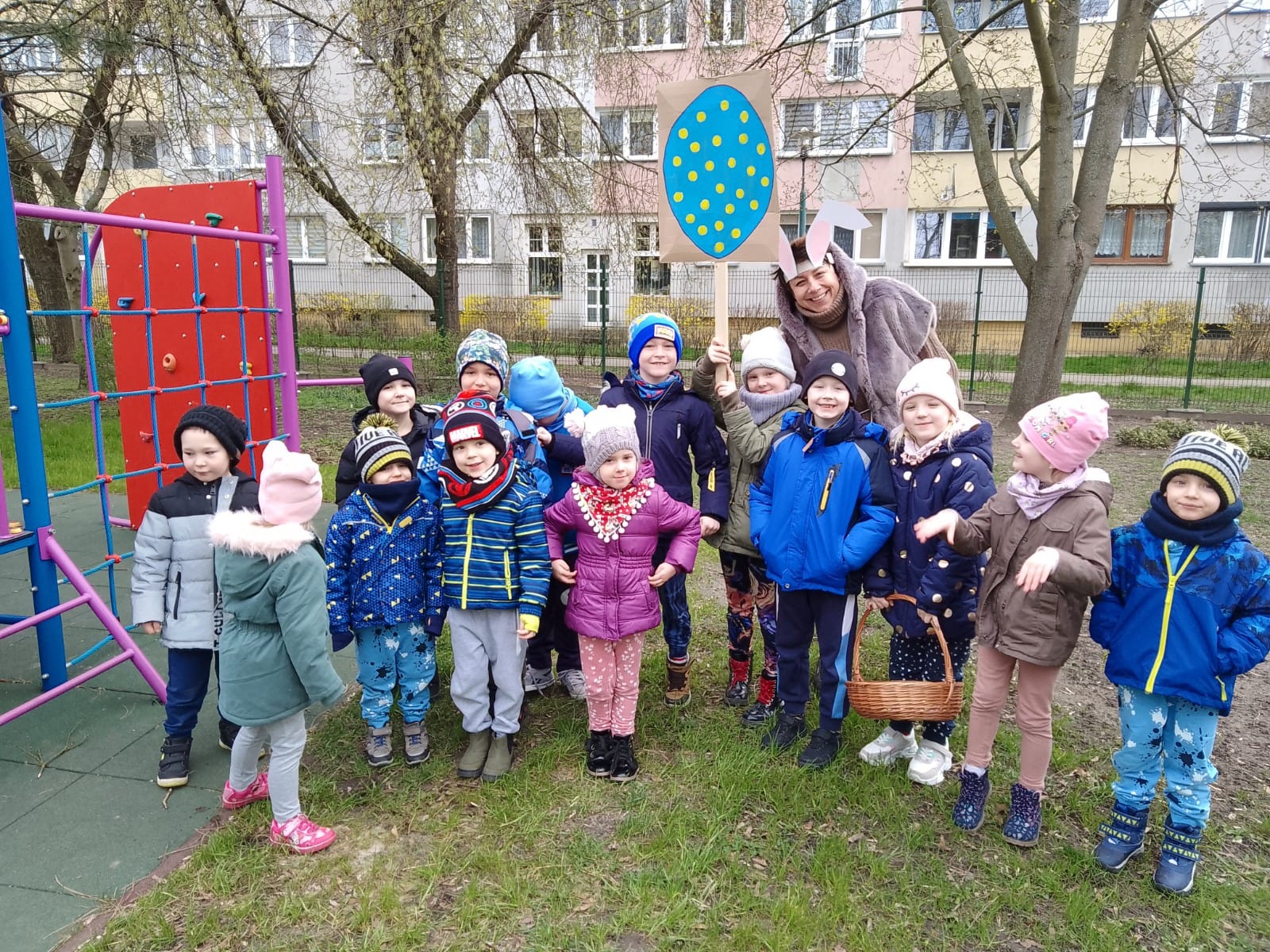 Zajączek przykicał, nie tylko z niespodziankami dla dzieci, ale również z zadaniami, które musiały wykonać, aby otrzymać słodki upominek. Zabawa była przednia i z jajem, dosłownie z jajem bo dzieci musiały pokonać tor przeszkód z jajkiem na łyżce i nie tylko. Z naszego przedszkolnego ogrodu dochodził radosny śmiech dzieci i Wielkanocnego Zajączka, podczas znajdowania poukrywanych czekoladowych jajeczek.