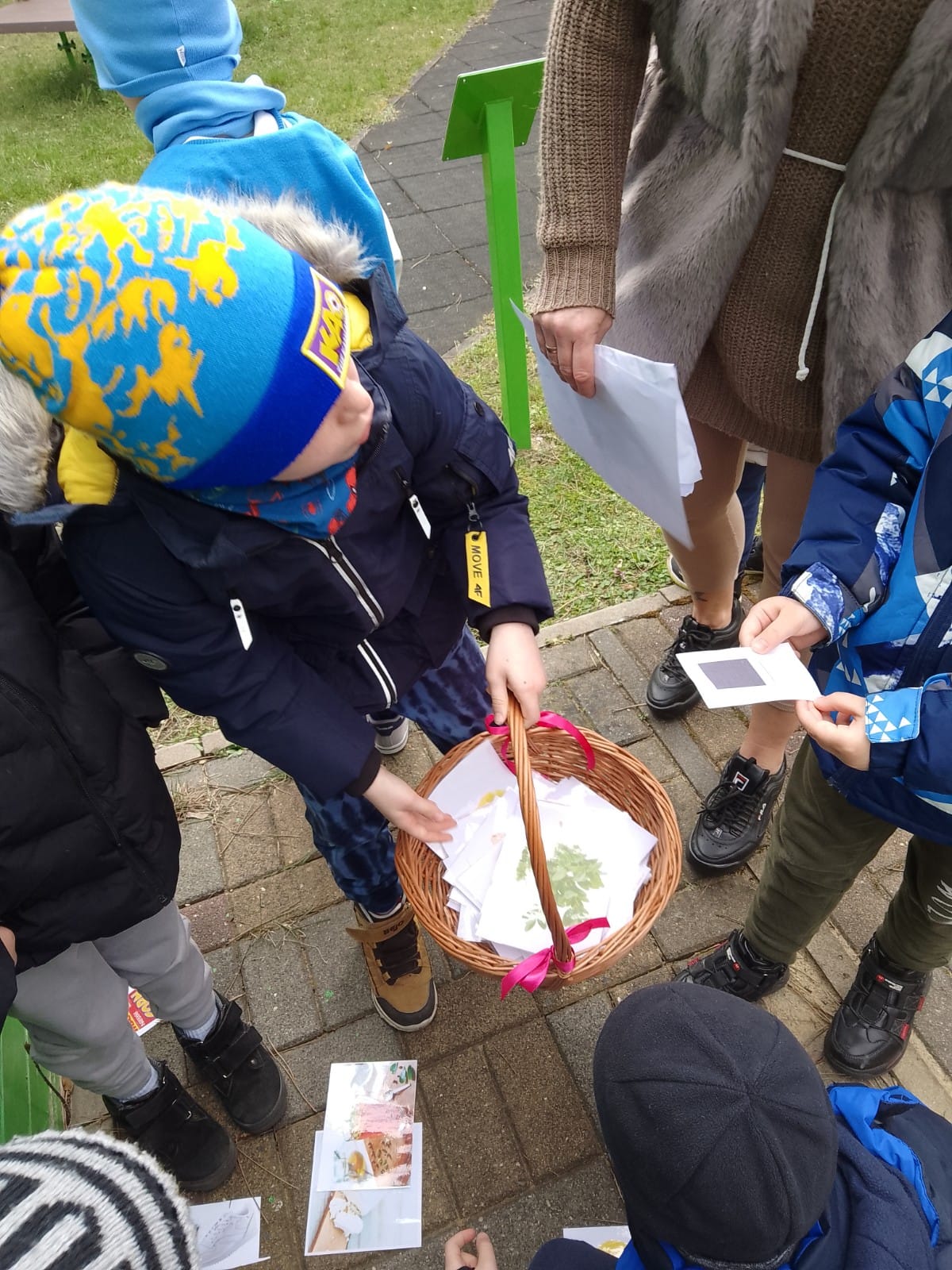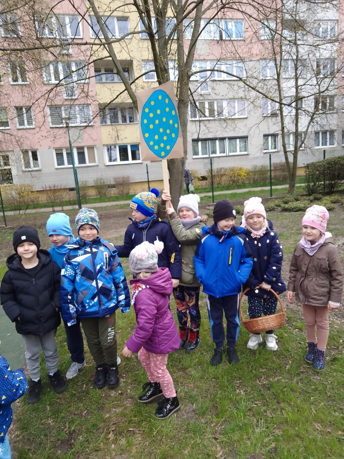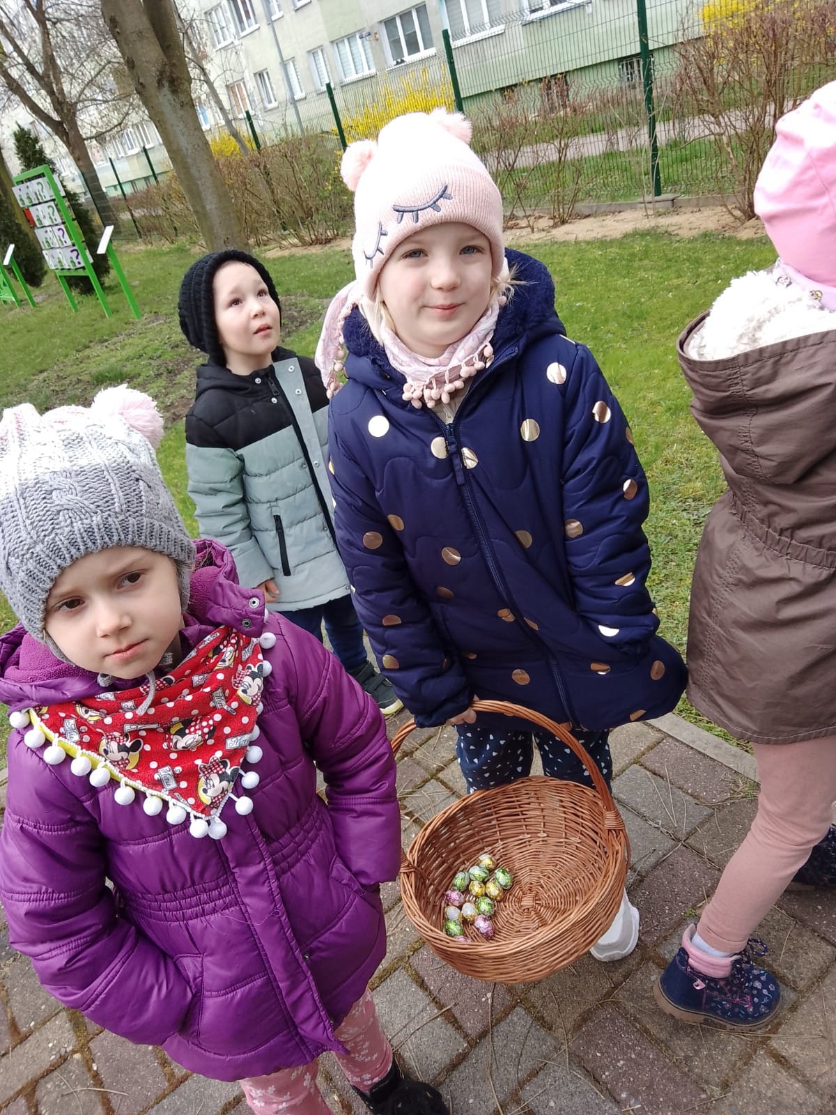 Zajączek przykicał, nie tylko z niespodziankami dla dzieci, ale również z zadaniami, które musiały wykonać, aby otrzymać słodki upominek. Zabawa była przednia i z jajem, dosłownie z jajem bo dzieci musiały pokonać tor przeszkód z jajkiem na łyżce i nie tylko. Z naszego przedszkolnego ogrodu dochodził radosny śmiech dzieci i Wielkanocnego Zajączka, podczas znajdowania poukrywanych czekoladowych jajeczek.