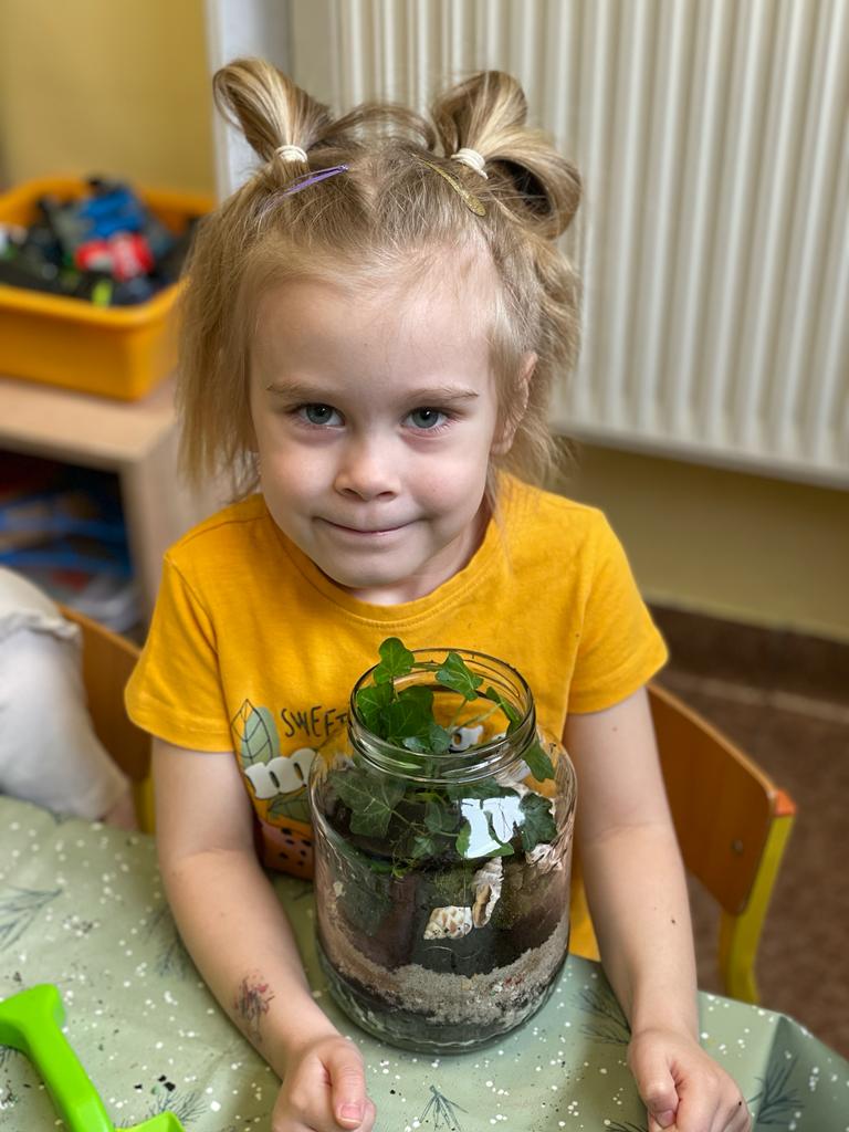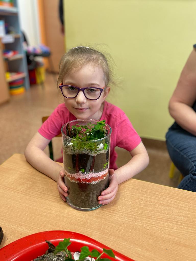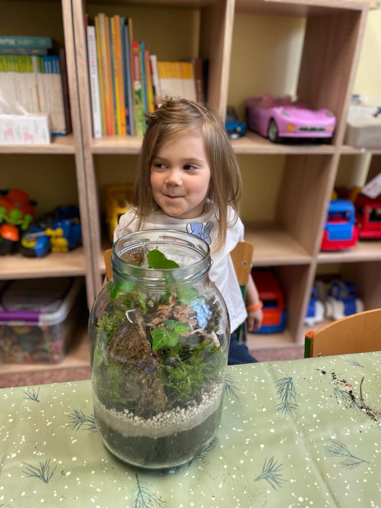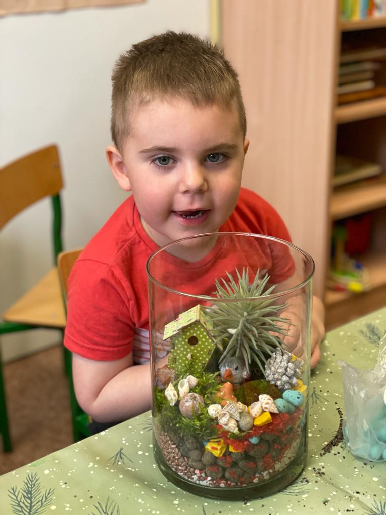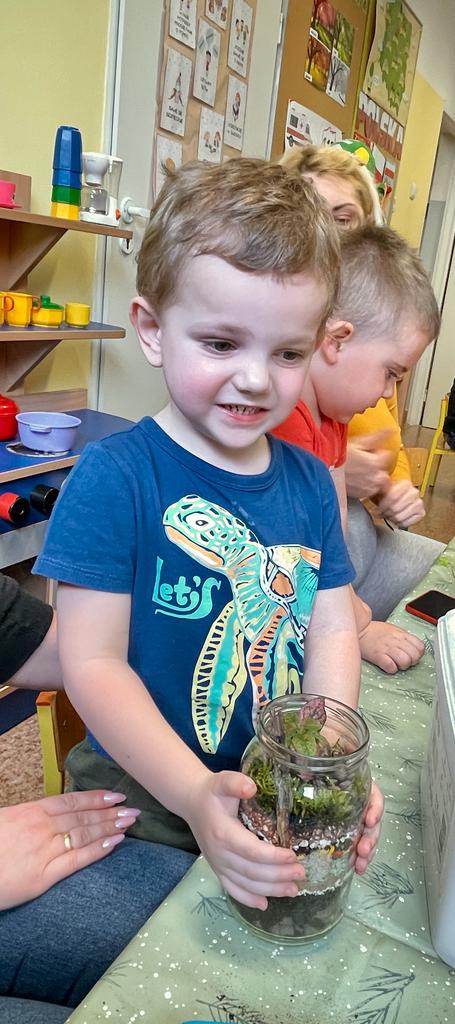 W grupie Wiewiórki w Suchej Górnej odbyły się warsztaty przyrodniczo - ekologiczne "Las w słoiku". Dzieci wraz z rodzicami wykonywały w przyniesionych słoikach swój własny las, używając do tego keramzytu, żwirku, ziemi, kamyków, roślinek oraz ozdobnych kamyczków. Wszystko według instrukcji nauczyciela ułożone zostało w słoiku w odpowiedniej kolejności. Las sam sobie ma wytwarzać wszystko, czego potrzebuje. To nie zwalnia dzieci z odpowiedniego dbania o roślinki, należy je podlewać go raz w tygodniu i postawić w odpowiednio nasłonecznionym miejscu. Mamy nadzieję, że powstałe piękne kompozycje długo będą zdobiły pokoje naszych Przedszkolaków.