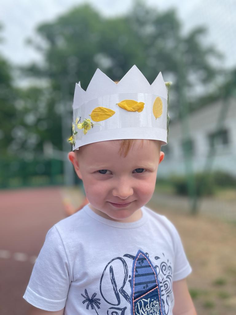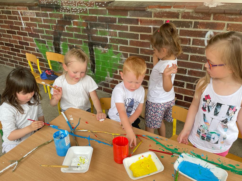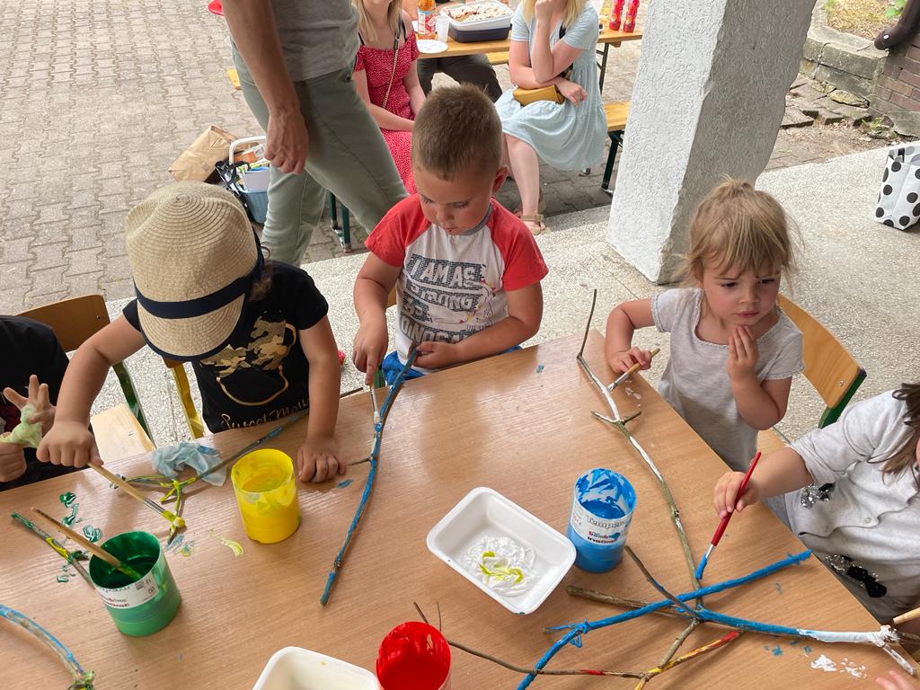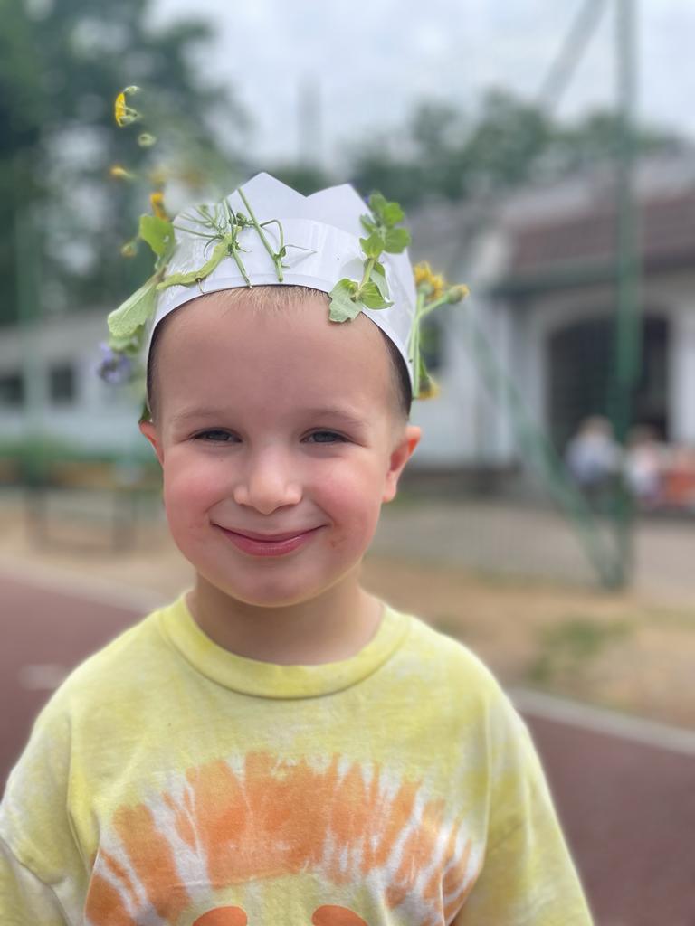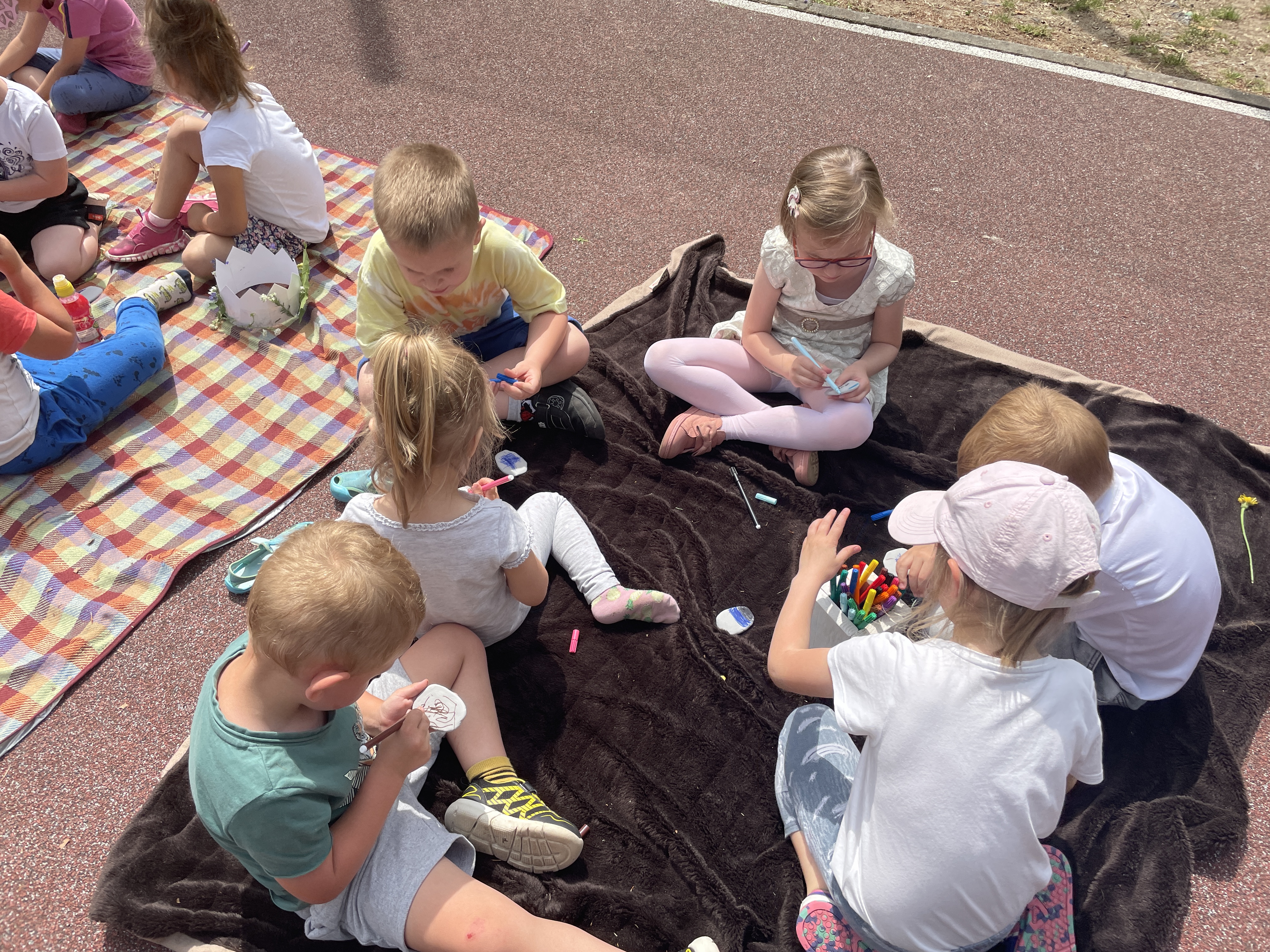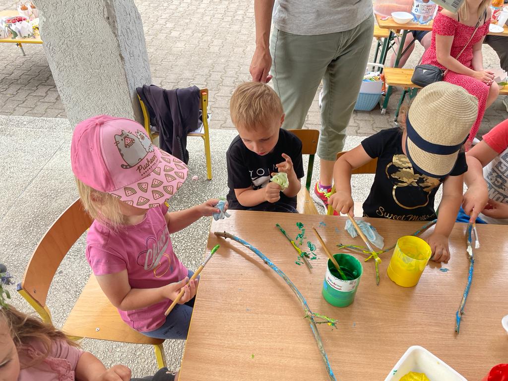 Później rozpoczęły się zabawy, które sprawiły wszystkim wiele radości – „Roślinne korony”, „Ozdabianie glinianych kamieni”, „Malowanie gałązek”, rzucanie balonami z wodą. Rodzice przygotowali dla dzieci pizzę oraz słodki poczęstunek w postaci babeczek i ciasta.