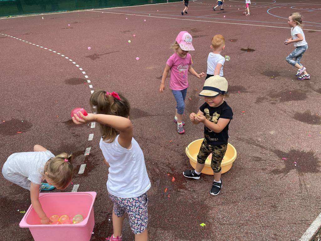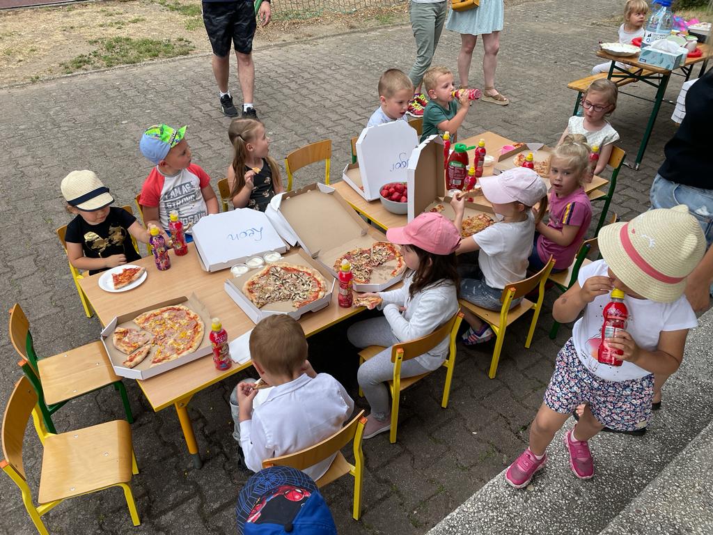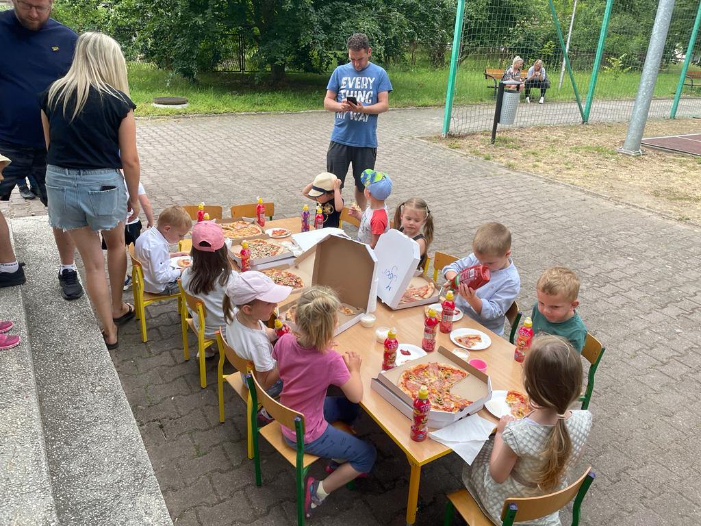 19 czerwca 2023r dzieci z naszego oddziału wraz z rodzicami, rodzeństwem oraz dziadkami bawiły się na boisku przy przedszkolu. Uroczystość rozpoczęła wychowawczyni, która wręczyła odchodzącym 5 – latkom pamiątkowe dyplomy i książki, z kolei wszystkim przedszkolakom na pamiątkę mijającego roku - tablo oraz książkę kucharską, która była podsumowaniem programu kulinarnego „Wiewiórki gotują”.