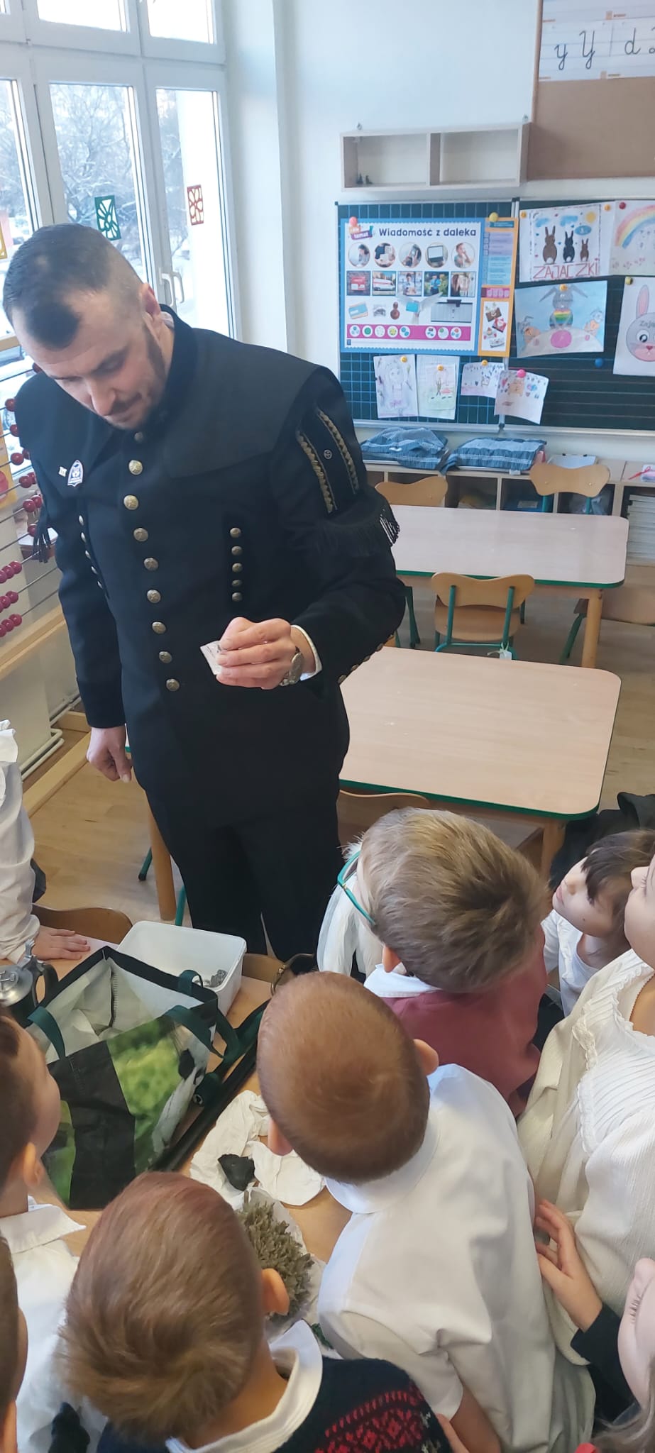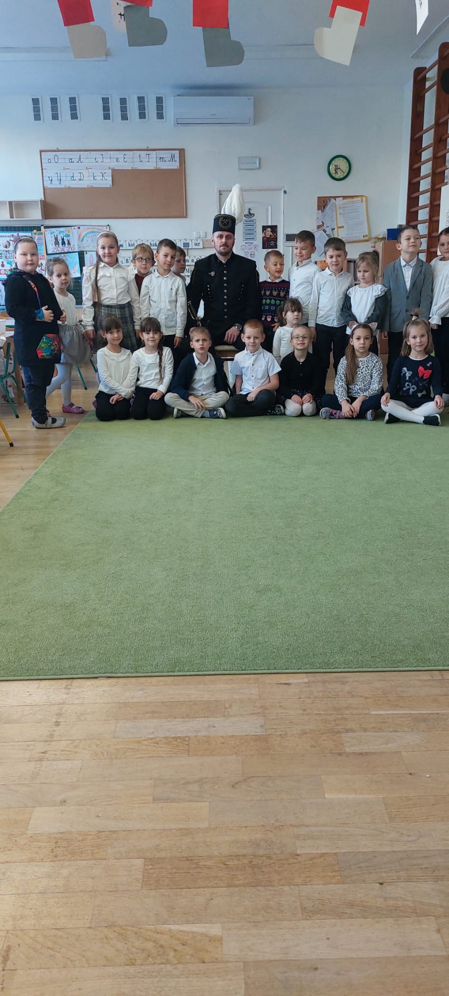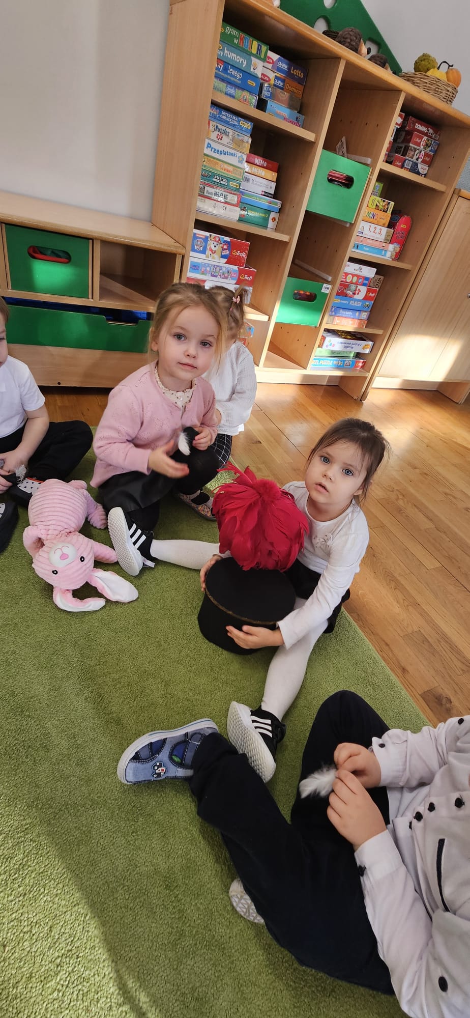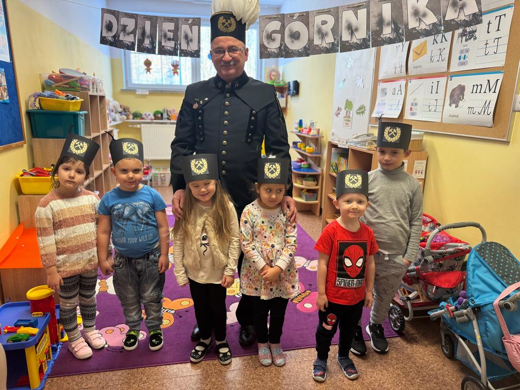 z ciekawostkami dotyczącej swojej pracy. Przedstawili dzieciom przepiękną historię o Świętej Barbarze – patronce górników. Przedszkolaki dowiedziały się, że górnicy wydobywają nie tylko miedź, ale i węgiel, że górnicy witają się i żegnają słowami- „Szczęść Boże”. Panowie górnicy przybyli do nas w stroju galowym. Dlatego dzieci miały okazję przyjrzeć się z bliska mundurowi, czapce górniczej, odznaczeniom, które górnicy otrzymują za długoletnią, ciężką pracę w kopalni. Panowie górnicy wyjaśnili dzieciom, jakie znaczenie mają kolory pióropuszy na czapce i kto je nosi. Przedszkolaki chętnie i z zaciekawieniem wysłuchały opowieści. W trakcie wizyty zadawały wiele pytań, na które gość chętnie odpowiadał. Miały również możliwość założenia czapki górniczej – czako oraz wysłuchania bajki czytanej przez gościa.
