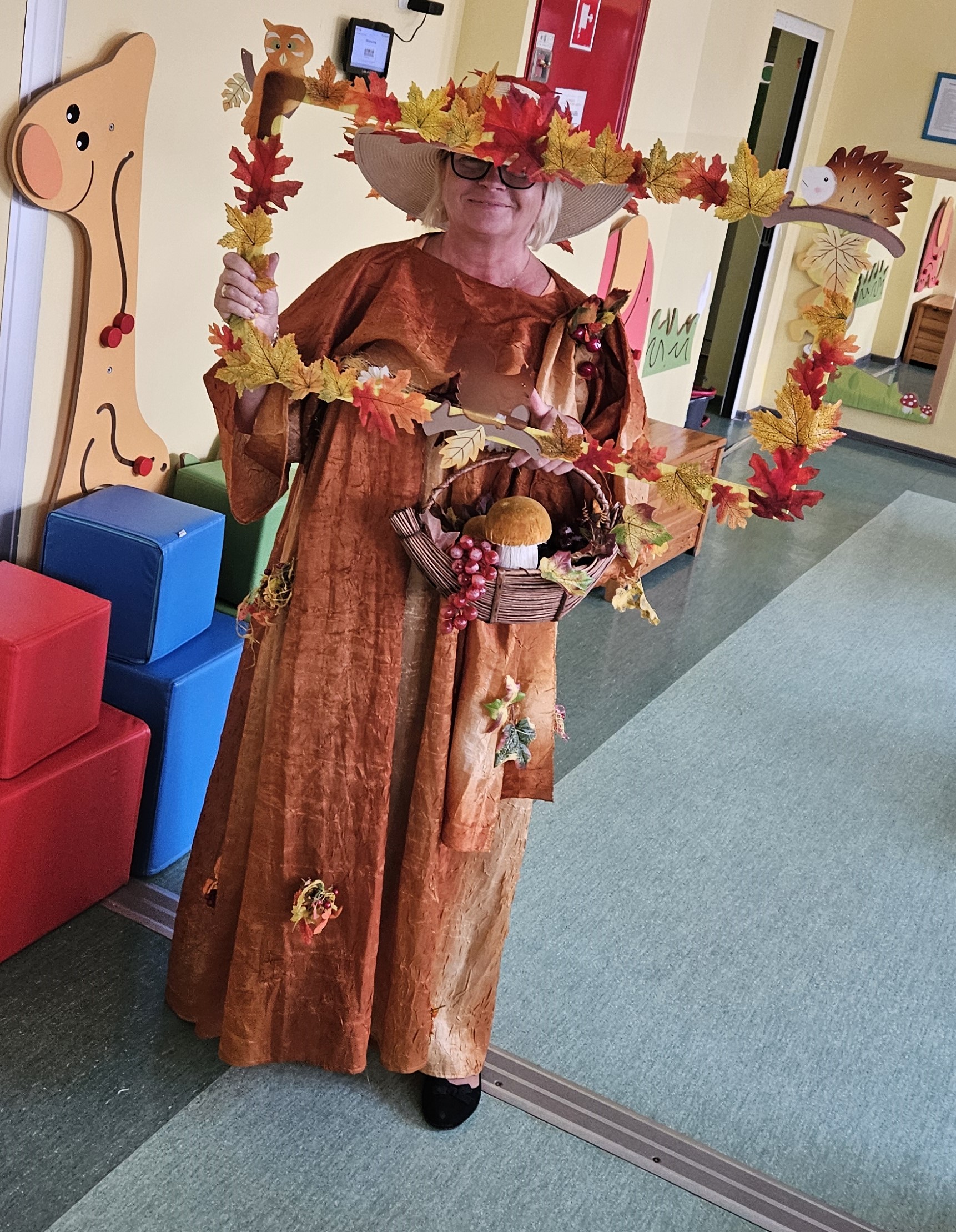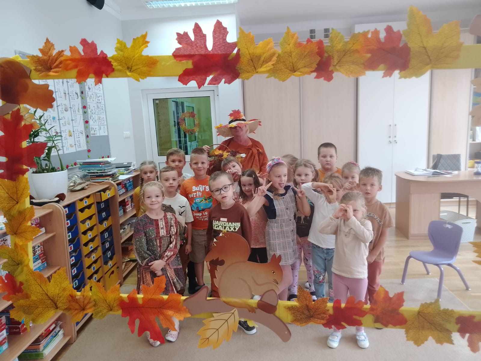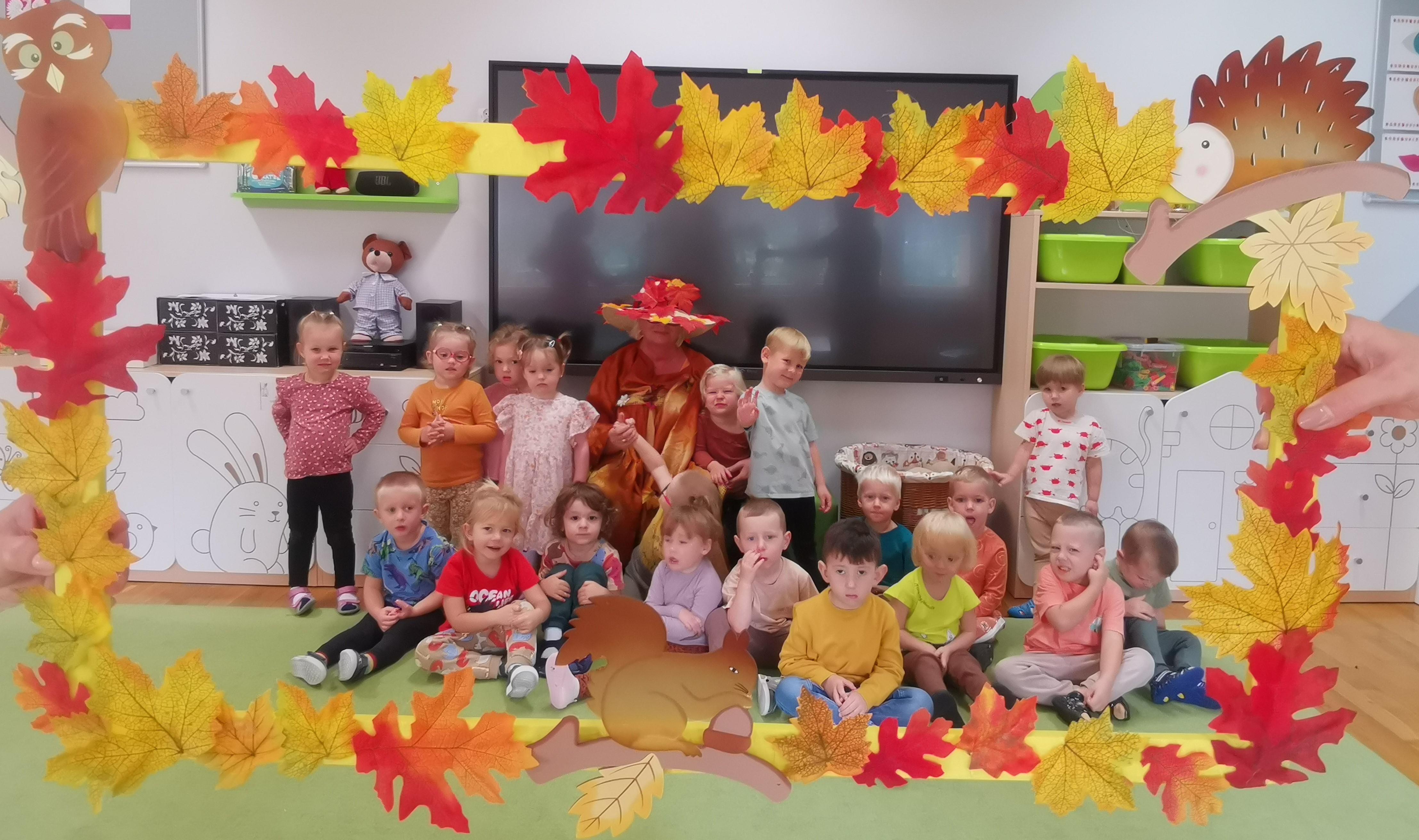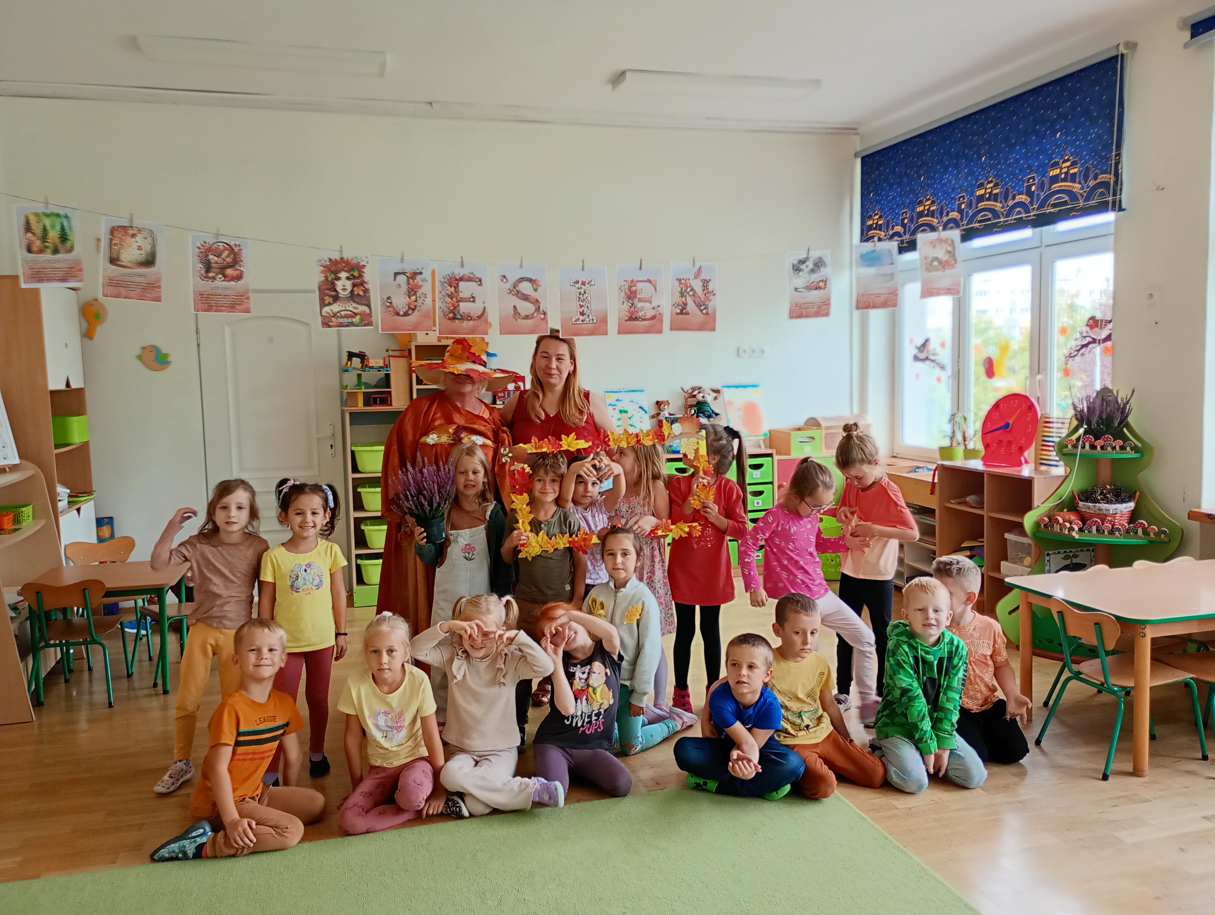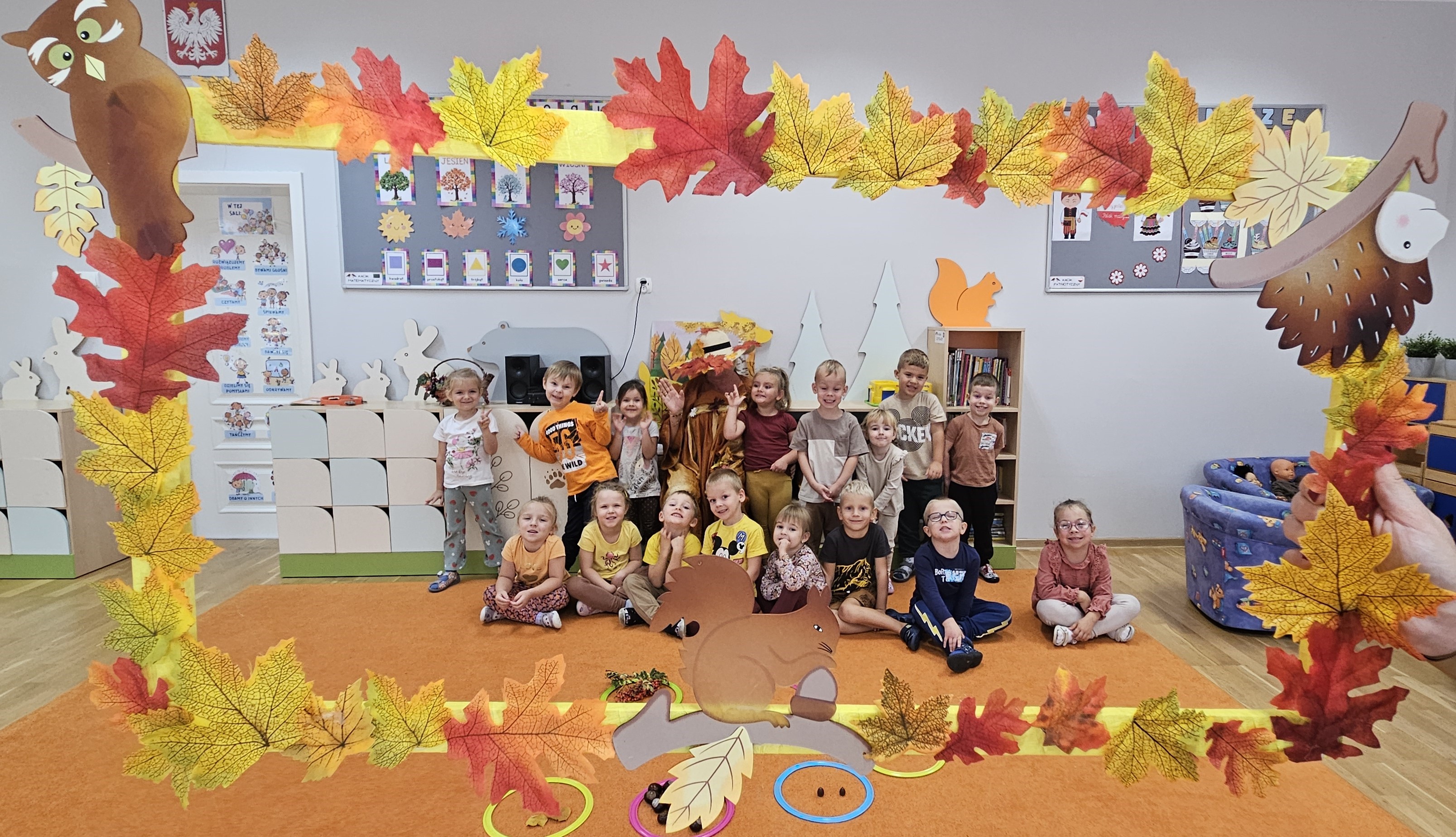 W naszym przedszkolu sezon jesienny uważamy za otwarty. Dnia 23 września oficjalnie powitaliśmy nową porę roku, która będzie panować przez najbliższe miesiące. Tego dnia w przedszkolu królowały kolory: brązowy, pomarańczowy i czerwony. Do wszystkich grup przedszkolnych zawitała Pani Jesień, której dzieci zaprezentowały wierszyki i piosenki, brały udział w zajęciach i zabawach o tematyce jesiennej, poprzez które zdobywały wiadomości o rozpoczynającej się porze roku. Dzieci miały okazję wykazać się wiedzą na temat nowej poru roku poprzez rozwiązywanie zagadek, rebusów. Z wielkim zaangażowaniem tworzyły również kolorowe jesienne prace plastyczne. Dzień ten był wprowadzeniem do tematyki związanej z jesienią. Przedszkolaki będą poszerzać swoją wiedzę, obserwować zmiany jakie przyniesie nam nowa pora roku podczas kolejnych zajęć, spacerów i wycieczek.