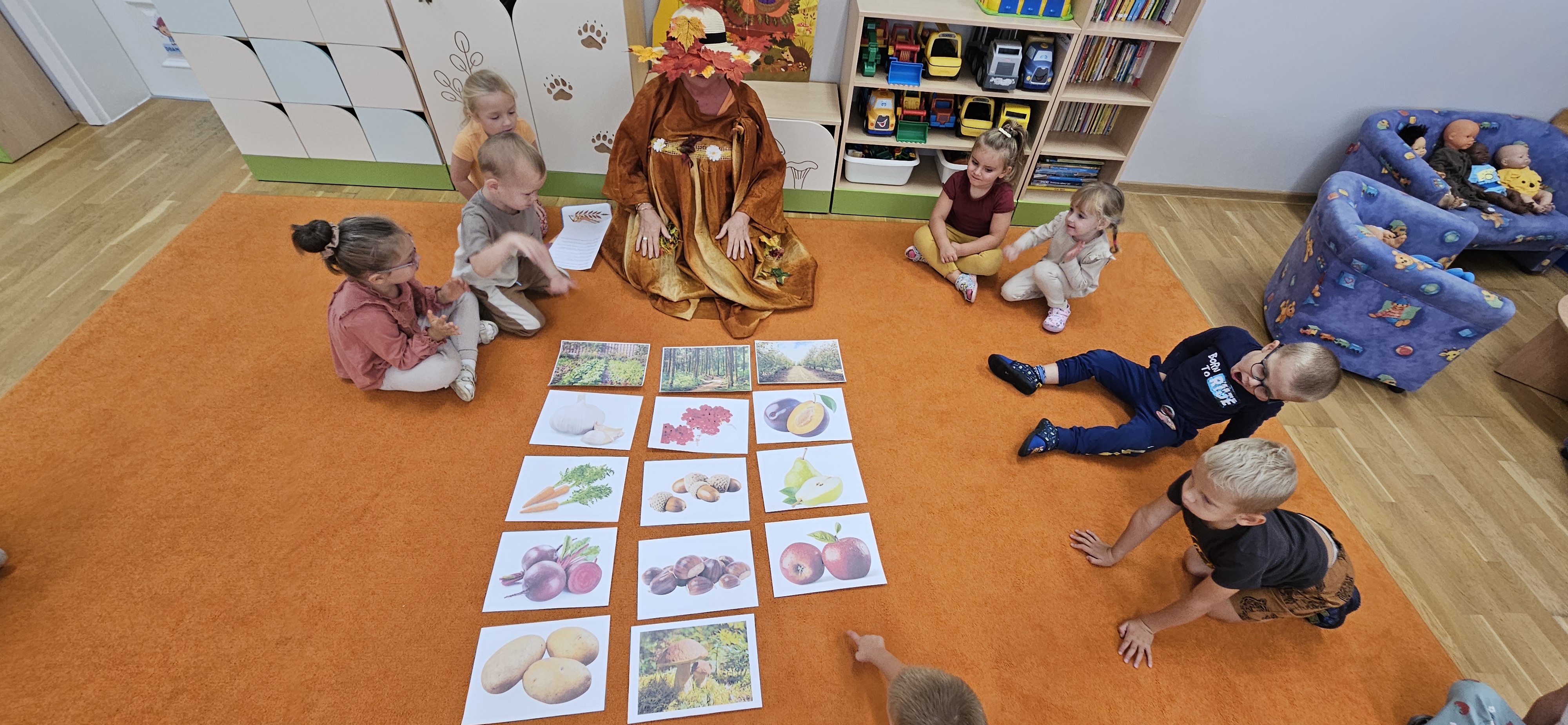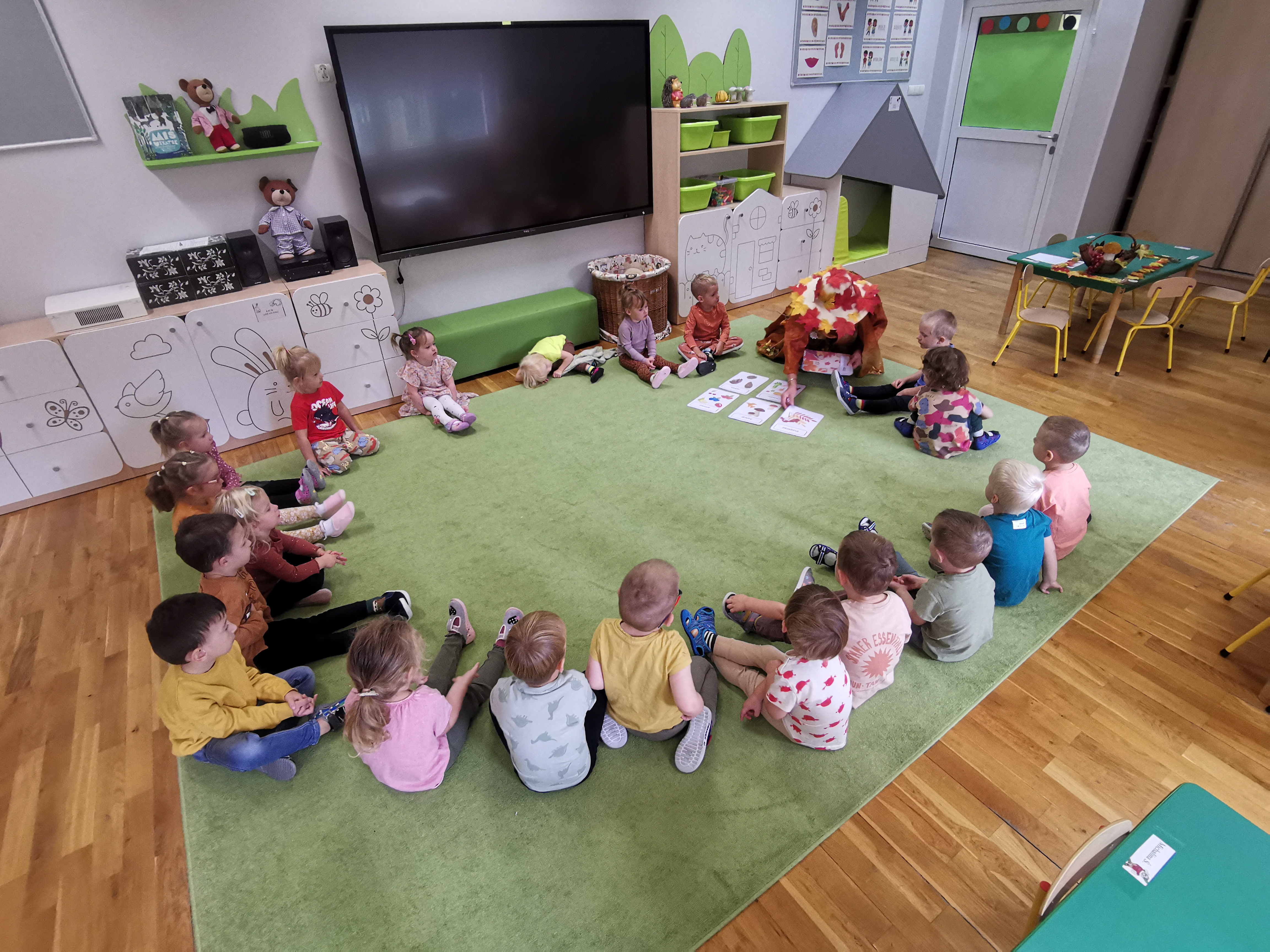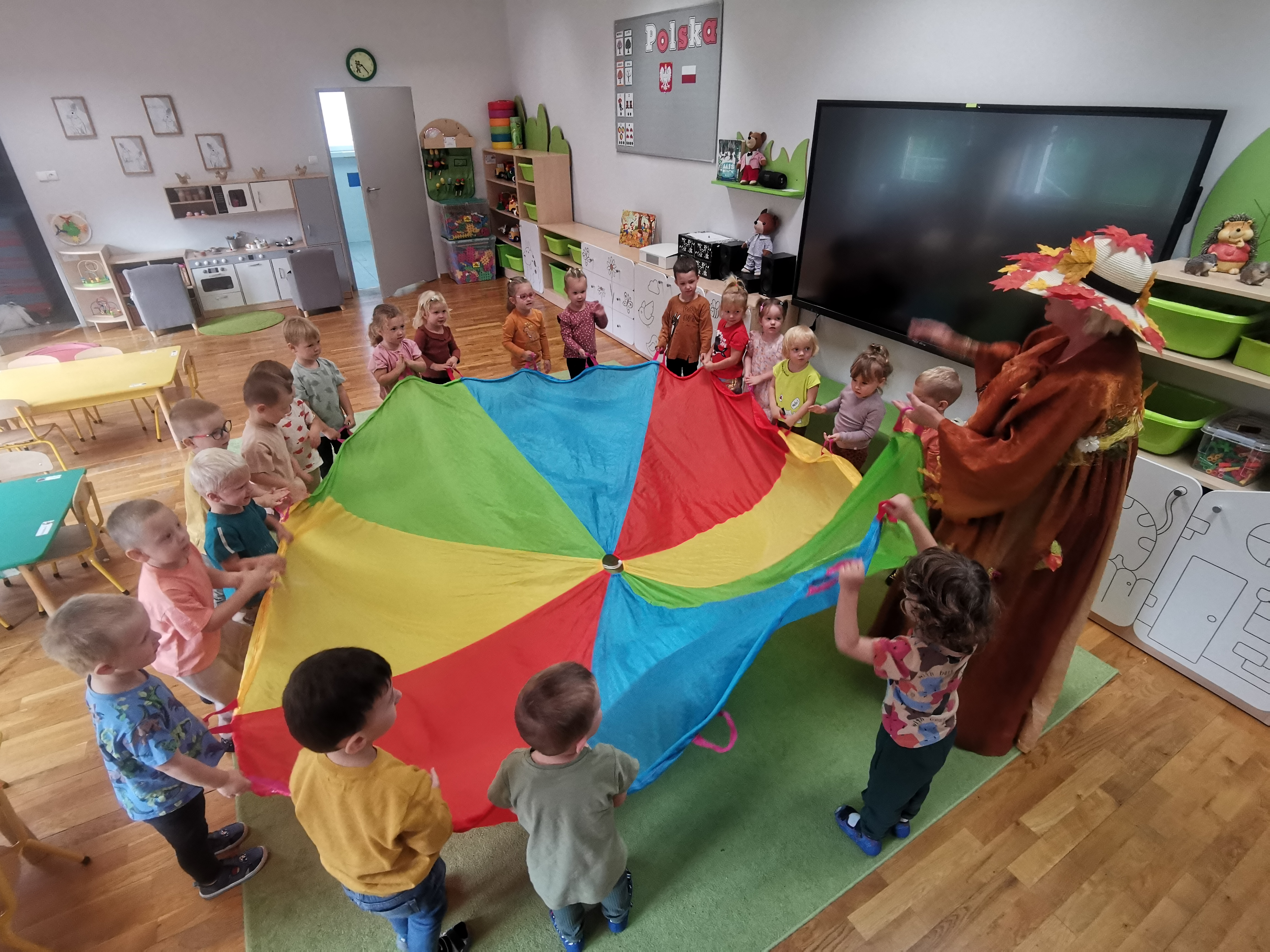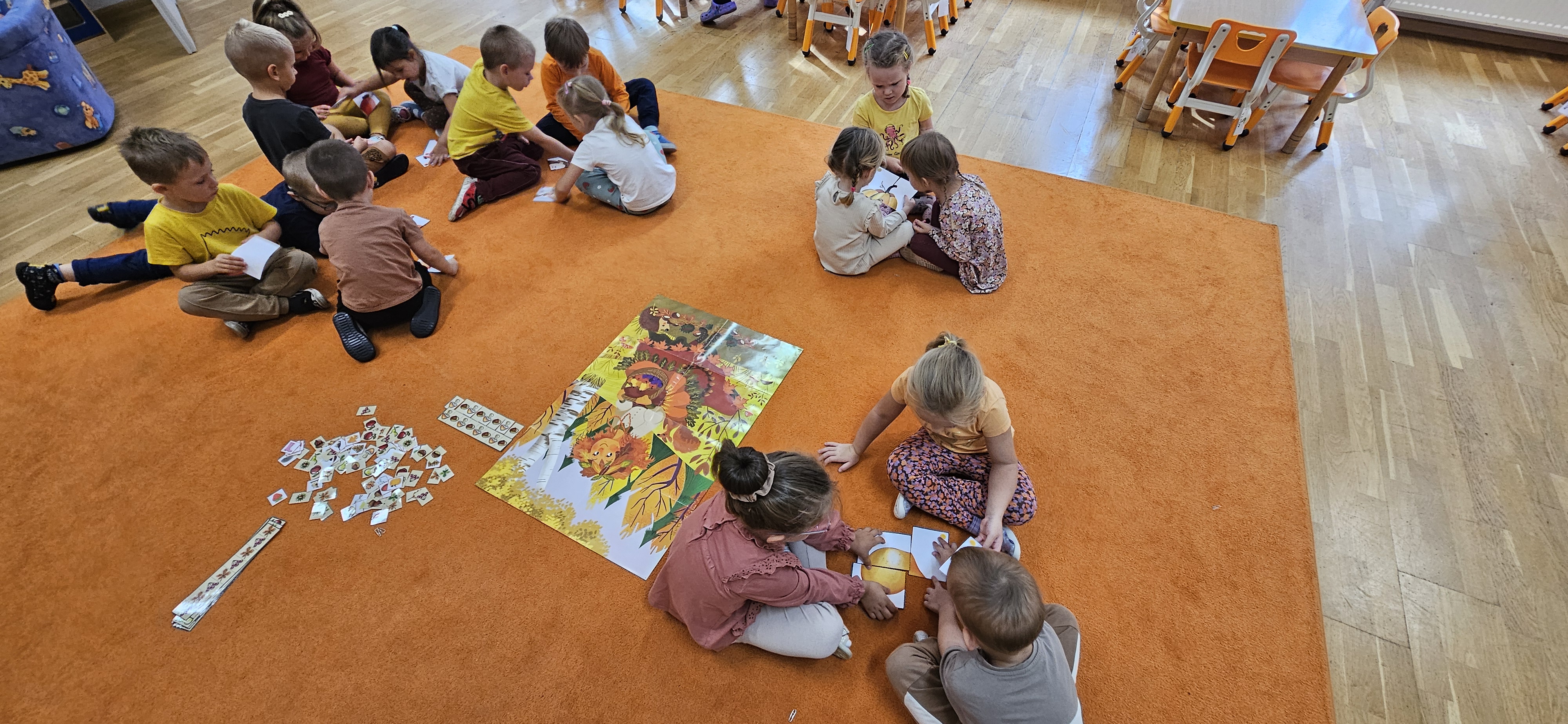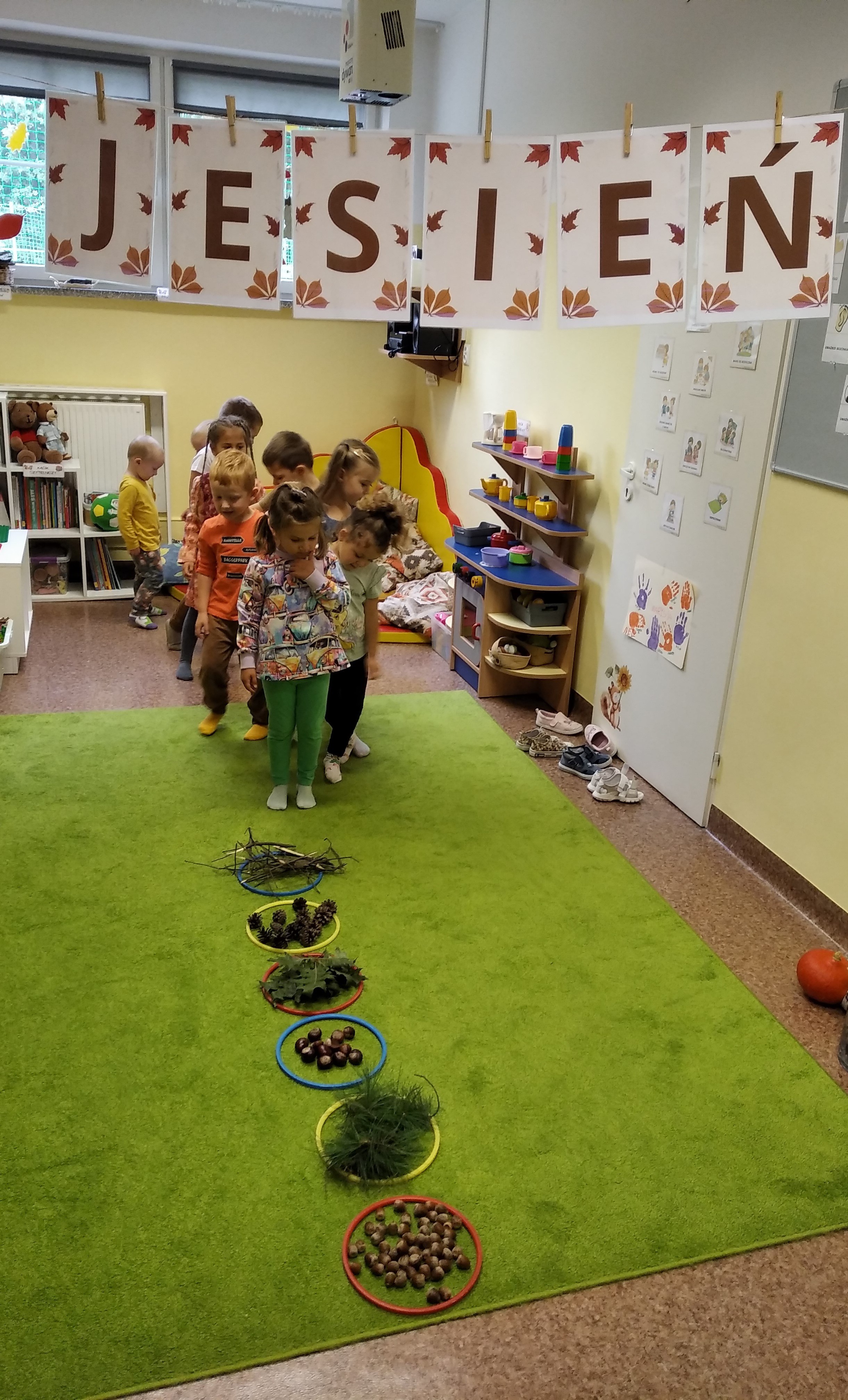 W naszym przedszkolu sezon jesienny uważamy za otwarty. Dnia 23 września oficjalnie powitaliśmy nową porę roku, która będzie panować przez najbliższe miesiące. Tego dnia w przedszkolu królowały kolory: brązowy, pomarańczowy i czerwony. Do wszystkich grup przedszkolnych zawitała Pani Jesień, której dzieci zaprezentowały wierszyki i piosenki, brały udział w zajęciach i zabawach o tematyce jesiennej, poprzez które zdobywały wiadomości o rozpoczynającej się porze roku. Dzieci miały okazję wykazać się wiedzą na temat nowej poru roku poprzez rozwiązywanie zagadek, rebusów. Z wielkim zaangażowaniem tworzyły również kolorowe jesienne prace plastyczne. Dzień ten był wprowadzeniem do tematyki związanej z jesienią. Przedszkolaki będą poszerzać swoją wiedzę, obserwować zmiany jakie przyniesie nam nowa pora roku podczas kolejnych zajęć, spacerów i wycieczek.