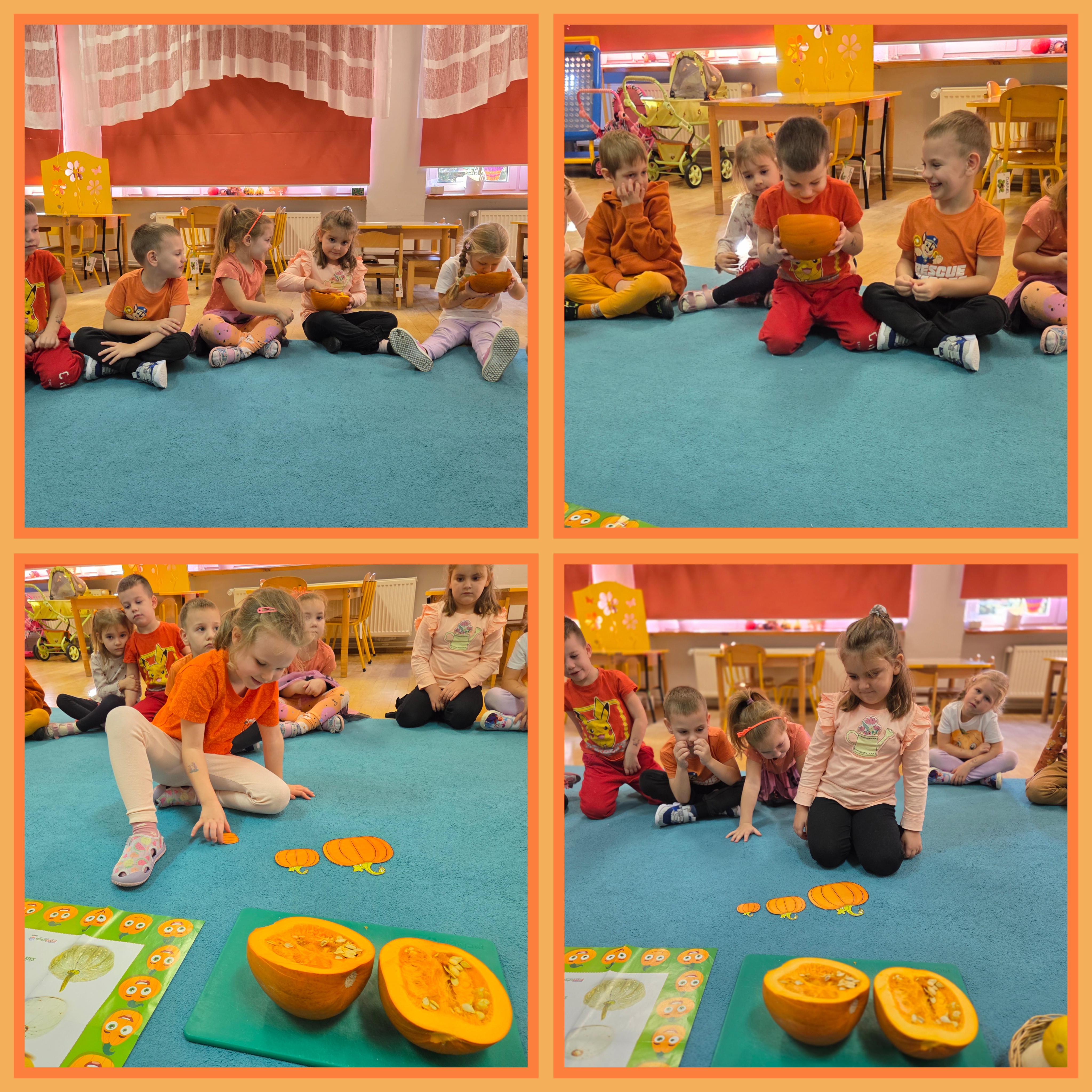 W dniu 31 października dzieci z grupy Wróbelki obchodziły Dzień Dyni – wyjątkowe święto, podczas którego dzieci miały okazję poznać to niezwykłe warzywo z różnych stron. Sala została udekorowana w barwach pomarańczowych, co wprowadziło wszystkich w jesienny, radosny nastrój. Na początku zajęć dzieci zapoznały się z różnymi rodzajami dyń – mogły je obejrzeć, porównać ich kształty, kolory i wielkości. Wspólnie dokonaliśmy również przekroju prawdziwej dyni, aby zobaczyć, jak wygląda w środku, poznać jej zapach oraz budowę. Dzieci z dużym zainteresowaniem oglądały pestki i miąższ dyni. W dalszej części dnia przedszkolaki uczestniczyły w zabawach matematycznych z dynią – przeliczały dynie, segregowały je według wielkości i koloru oraz układały proste rytmy z dyniowych ilustracji.