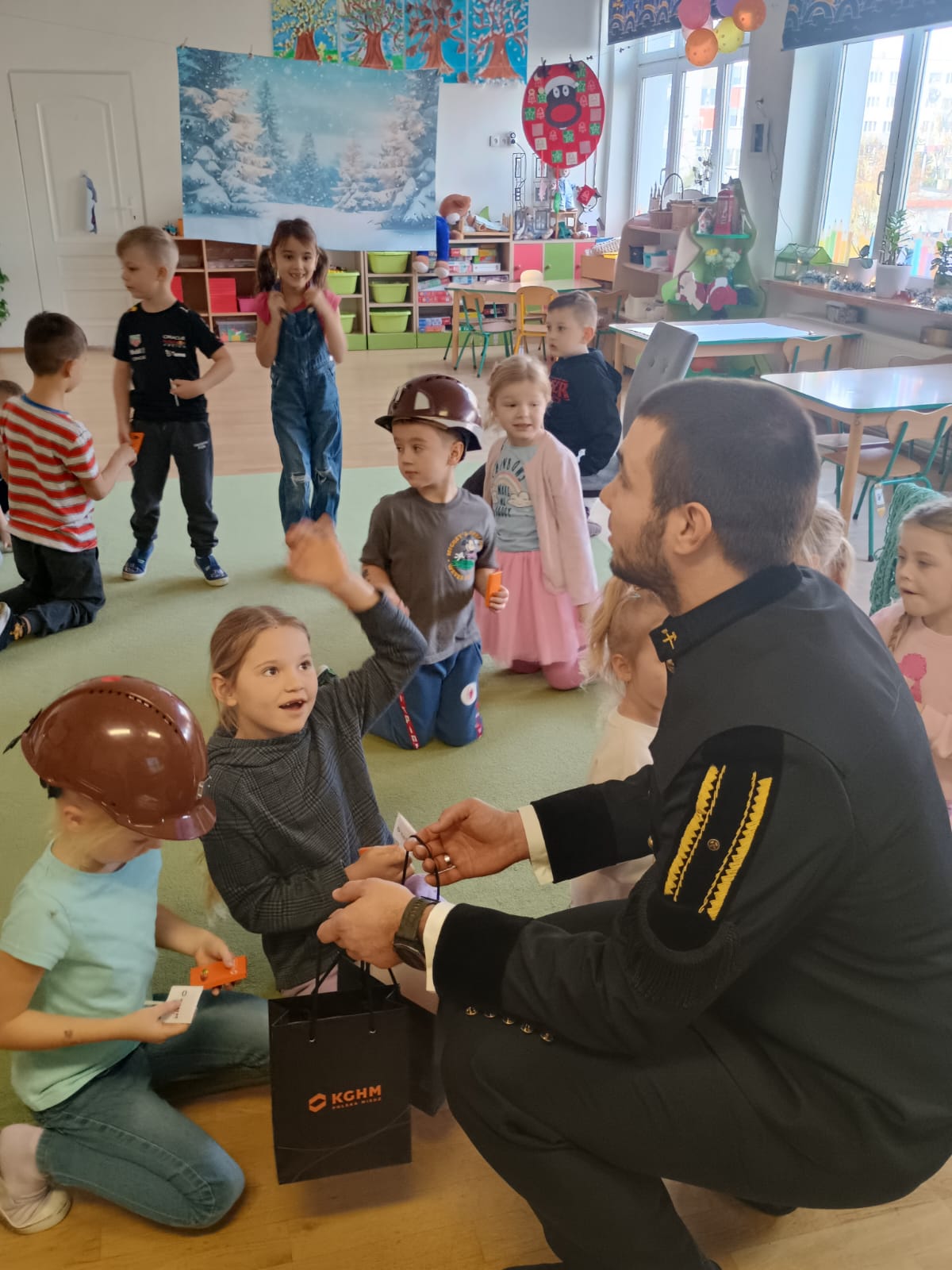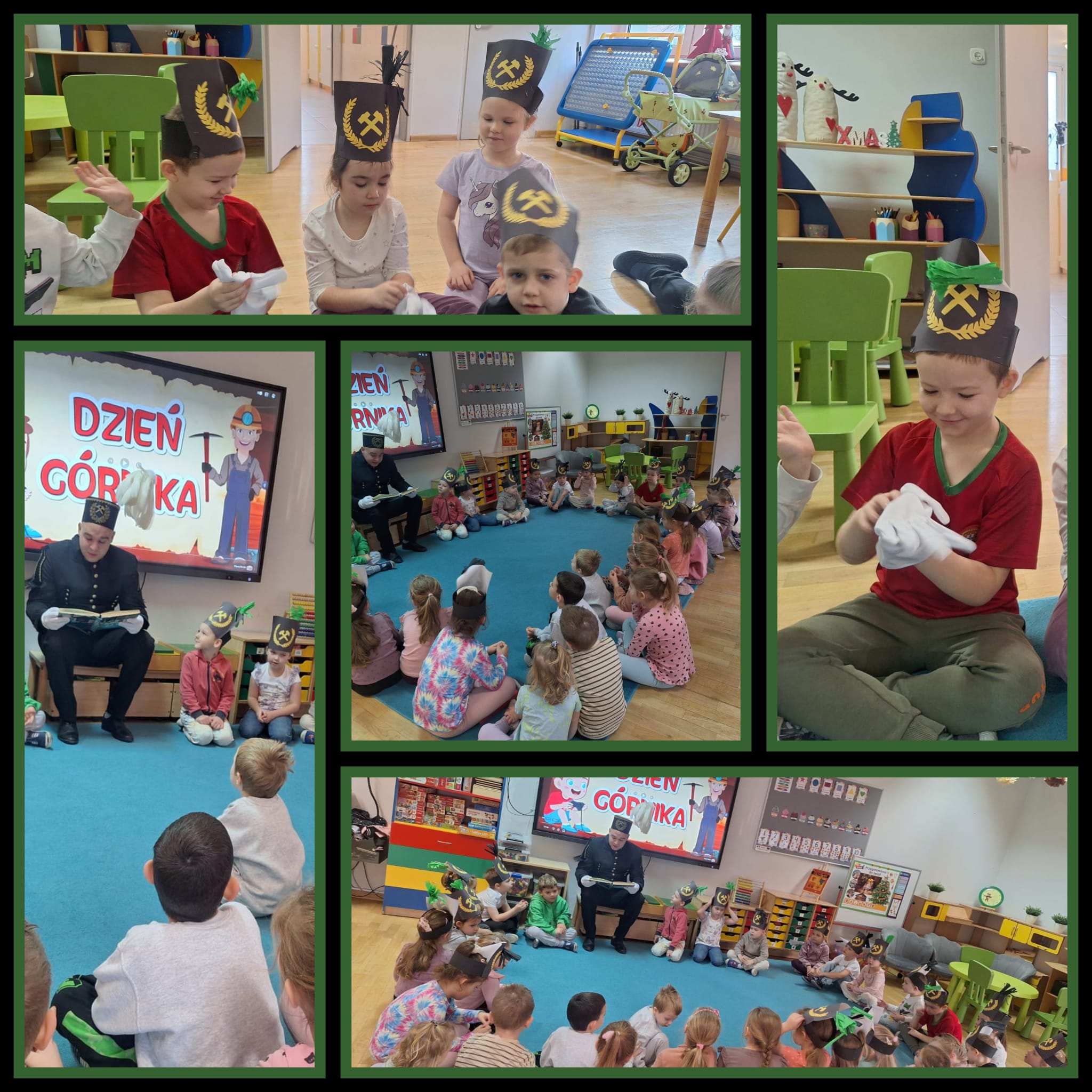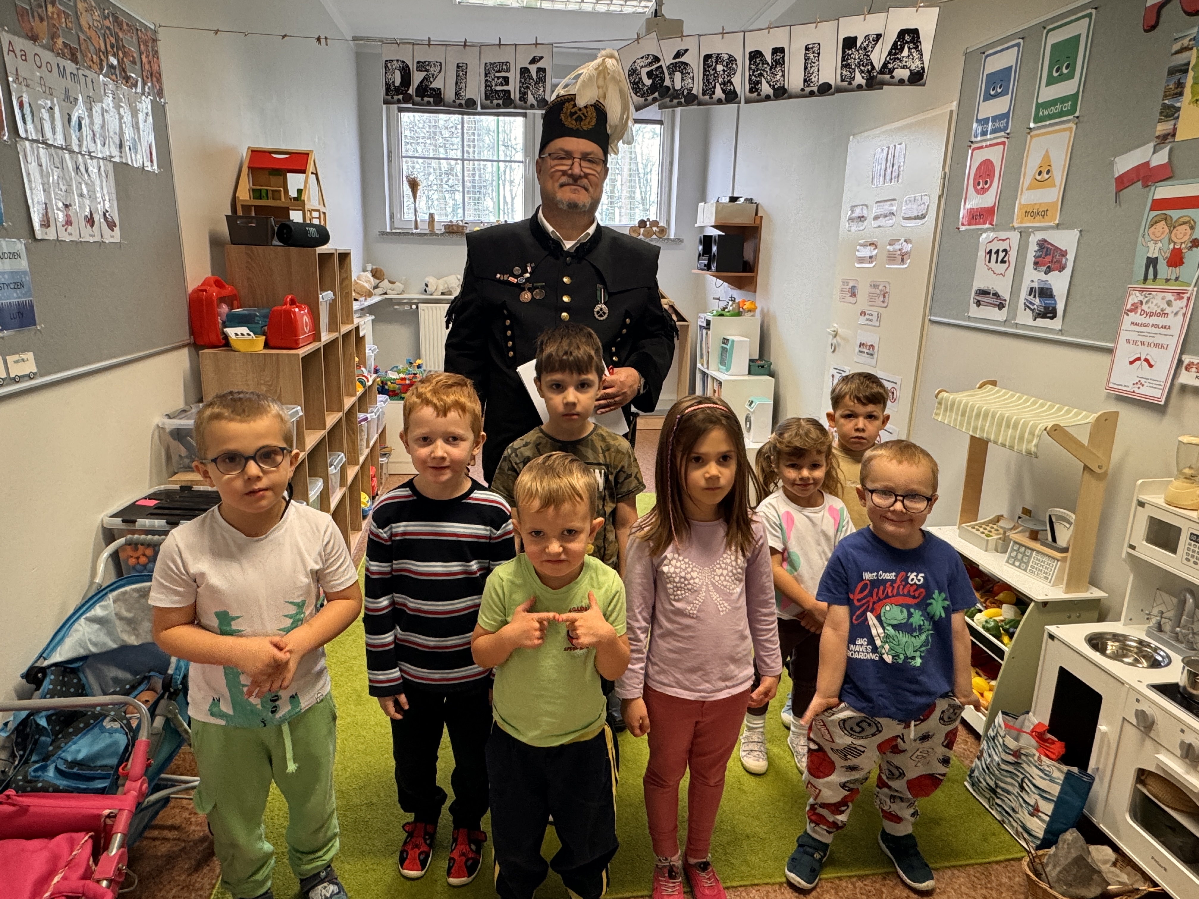 4 grudnia obchodziliśmy Dzień Górnika. Z tej okazji gościliśmy w naszym przedszkolu górników. Podczas spotkania dzieci miały okazję wzbogacić swoje wiadomości na temat ciężkiej, czasami niebezpiecznej pracy górnika. Dowiedziały się, w jaki sposób wydobywana jest w naszych kopalniach ruda miedzi oraz inne minerały . Górnicy przybyli do nas w stroju galowym, dlatego dzieci miały okazję przyjrzeć się z bliska mundurowi, czapce górniczej, odznaczeniom, które górnicy otrzymują za długoletnią, ciężką pracę w kopalni. Panowie górnicy wyjaśnili dzieciom, jakie znaczenie mają kolory pióropuszy na czapce i kto je nosi, miały również możliwość założenia czapki górniczej - czako. Przedszkolaki chętnie i z zaciekawieniem wysłuchały opowieści. W trakcie wizyty zadawały wiele pytań, na które goście chętnie odpowiadali.