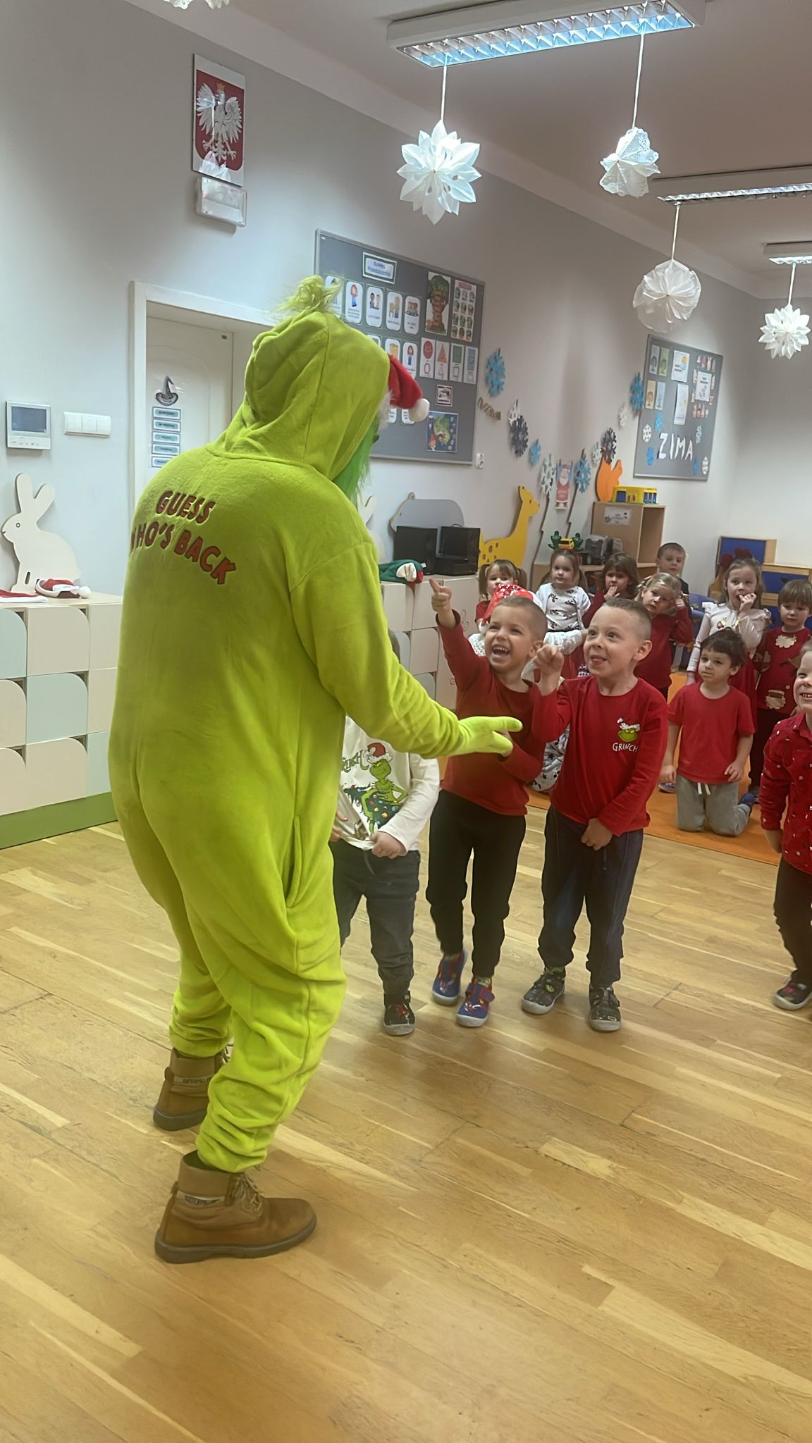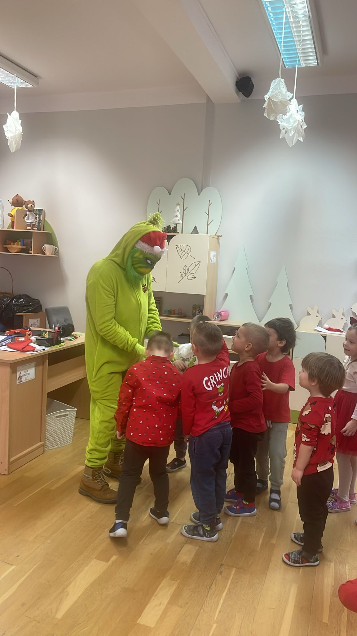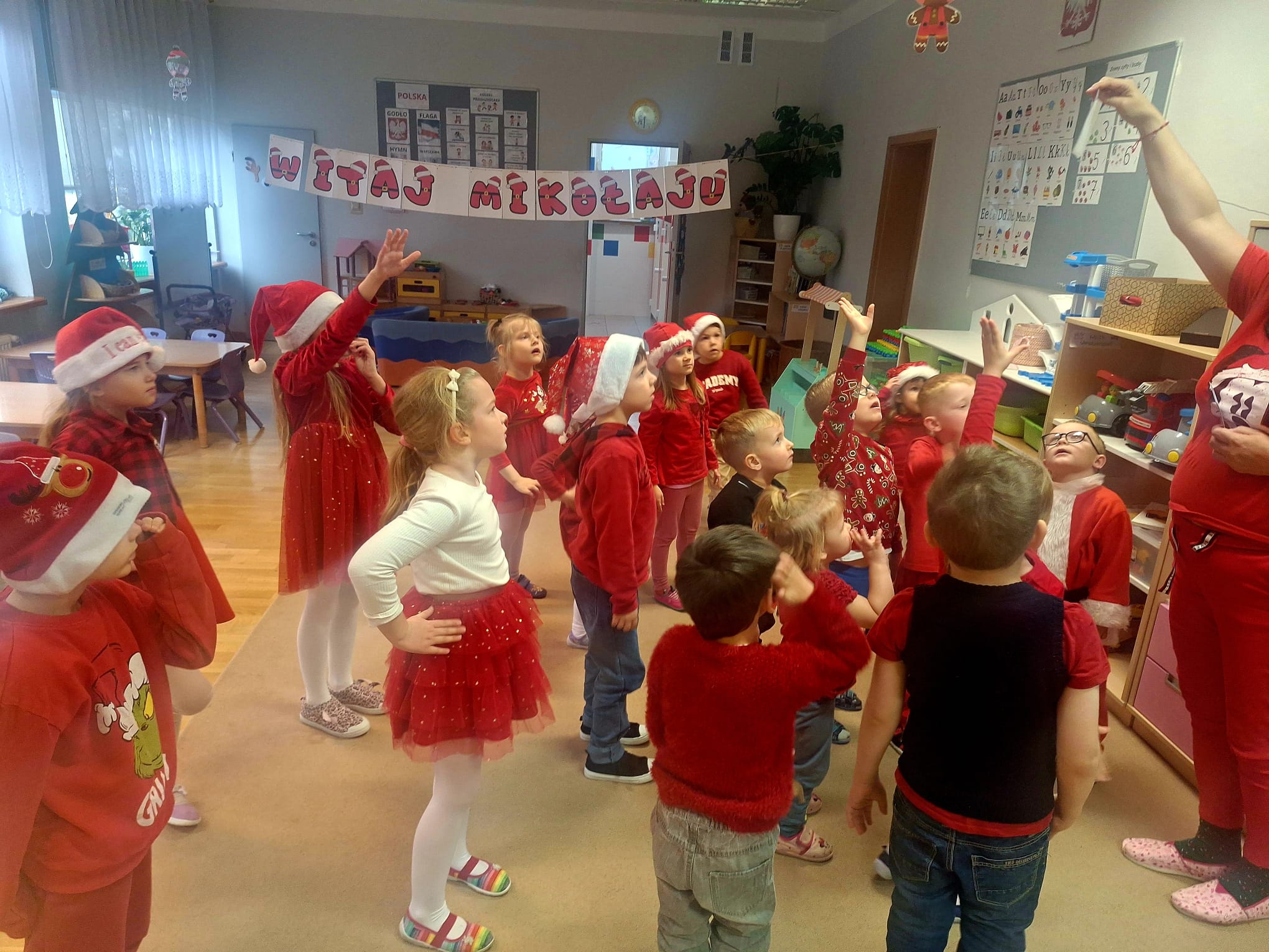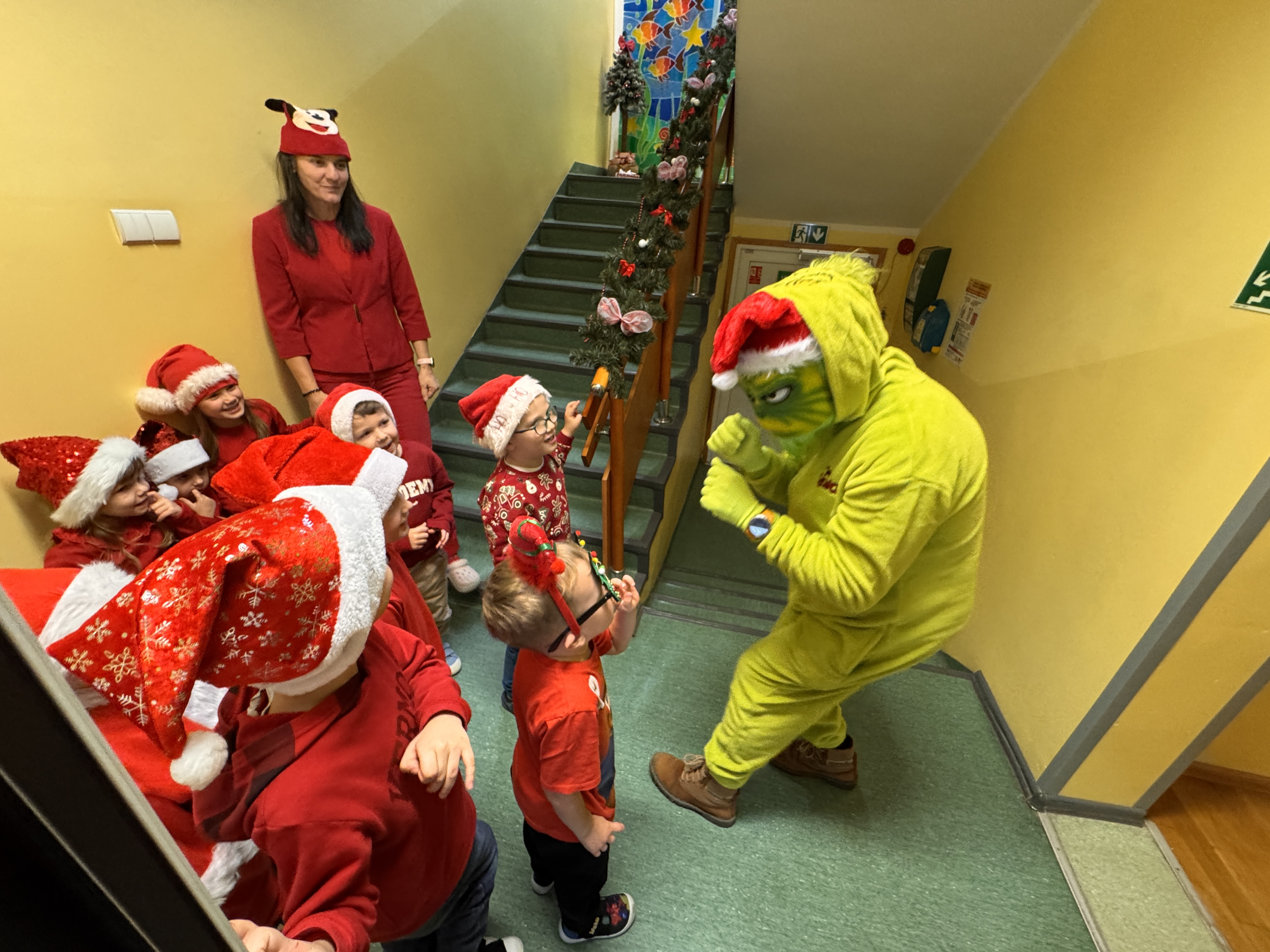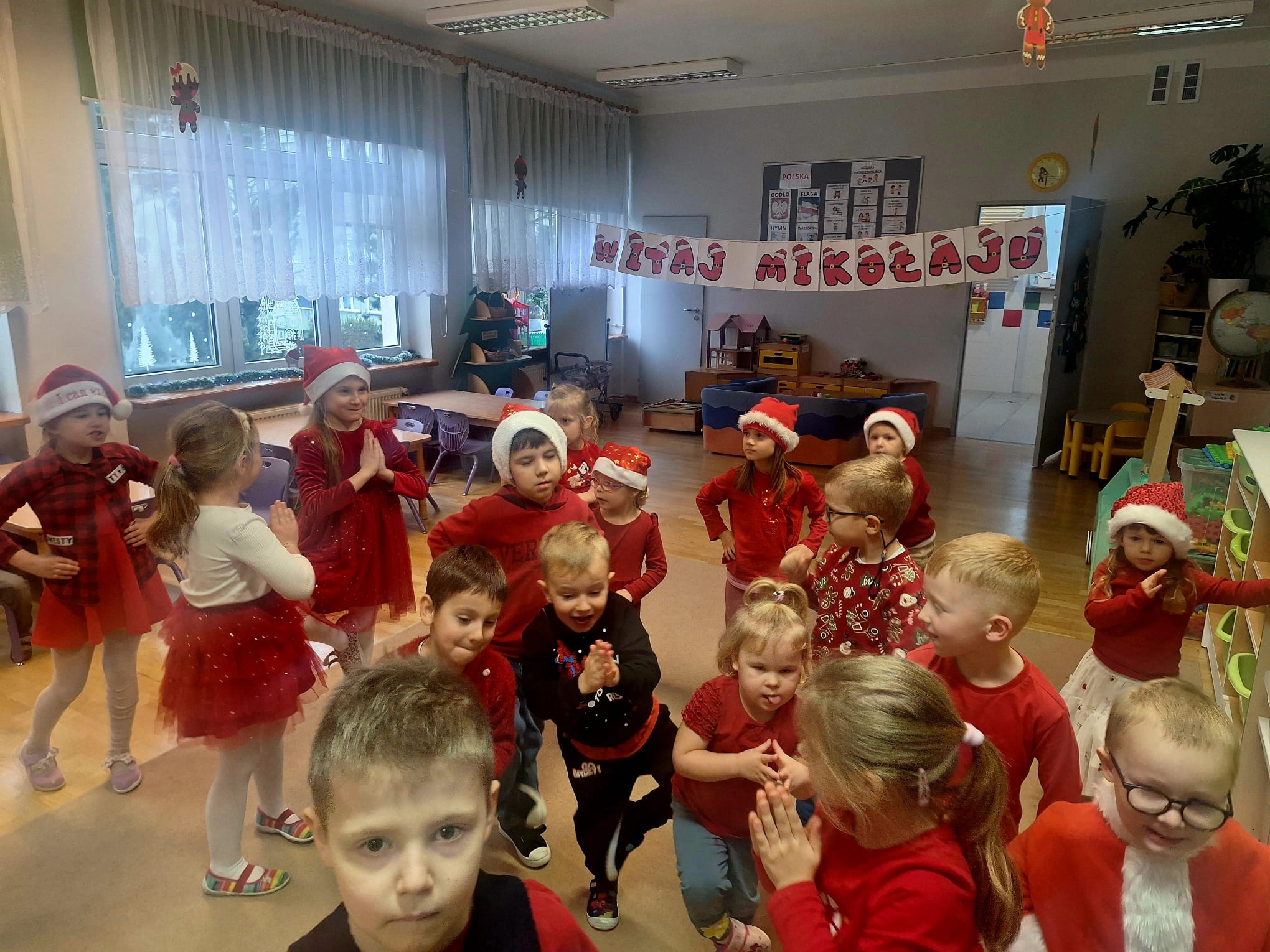 Od rana wszyscy z niecierpliwością spoglądaliśmy za okno i wypatrywaliśmy pojazdów Mikołaja. Nagle! Trąbienie klaksonów i pojawił się świąteczny zaprzęg Mikołaja. Z uśmiechem przywitaliśmy Mikołaja, jego pomocników, a nawet Grincha. Mikołaj zapytał, czy byliśmy grzeczni. Oczywiście, że tak! Każda z grup zaśpiewała piosenkę, a Mikołaj wręczył nam piękne prezenty.