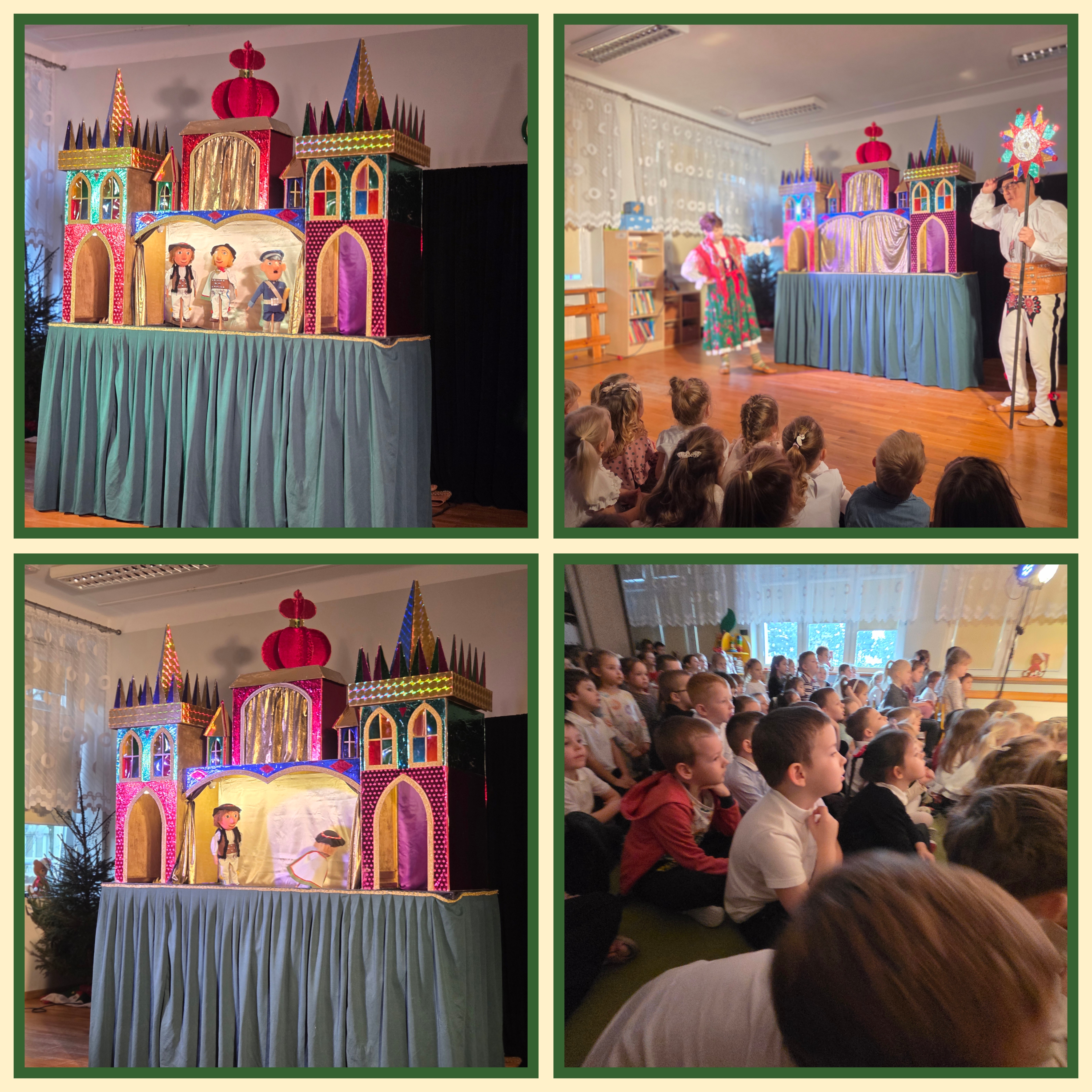 W naszym przedszkolu 9 grudnia 2025 odbył się niezwykły teatrzyk pt. Hej kolęda ! nawiązujący do bardzo starej polskiej tradycji kolędowania – chodzenia z szopką, jednej z najstarszych form teatru lalek silnie związanej z polską kulturą i obyczajowością. Dzieci obejrzały wielowątkową historię o zwiastowaniu, o pasterzach podążających do Betlejem oraz o Herodzie. Sceny te przedstawiane były przez przepiękne lalki w okazałej, ponad dwumetrowej szopce krakowskiej – niemalże repliki budowli stworzonych przez najsłynniejszych krakowskich szopkarzy, braci Ezenkierów. Wesołe intermedia w wykonaniu aktorów grających „w planie żywym” (w oryginalnych, ludowych strojach) ukazywały charakterystyczne dla szopki krakowskiej sceny z Żydem, Góralami, Dziadem i Babą oraz Maćkiem i Turoniem. Całość zakończyła się barwną rewią postaci świeckich. Aktorzy śpiewali kolędy z zapałem wiejskich kolędników, zachęcając do wspólnego śpiewu również nasze przedszkolaki. Język był subtelnie podbarwiony gwarą, lecz całkowicie zrozumiały. Historia była jednocześnie wzruszająca i zabawna, oparta na tradycyjnych tekstach szopkowych.