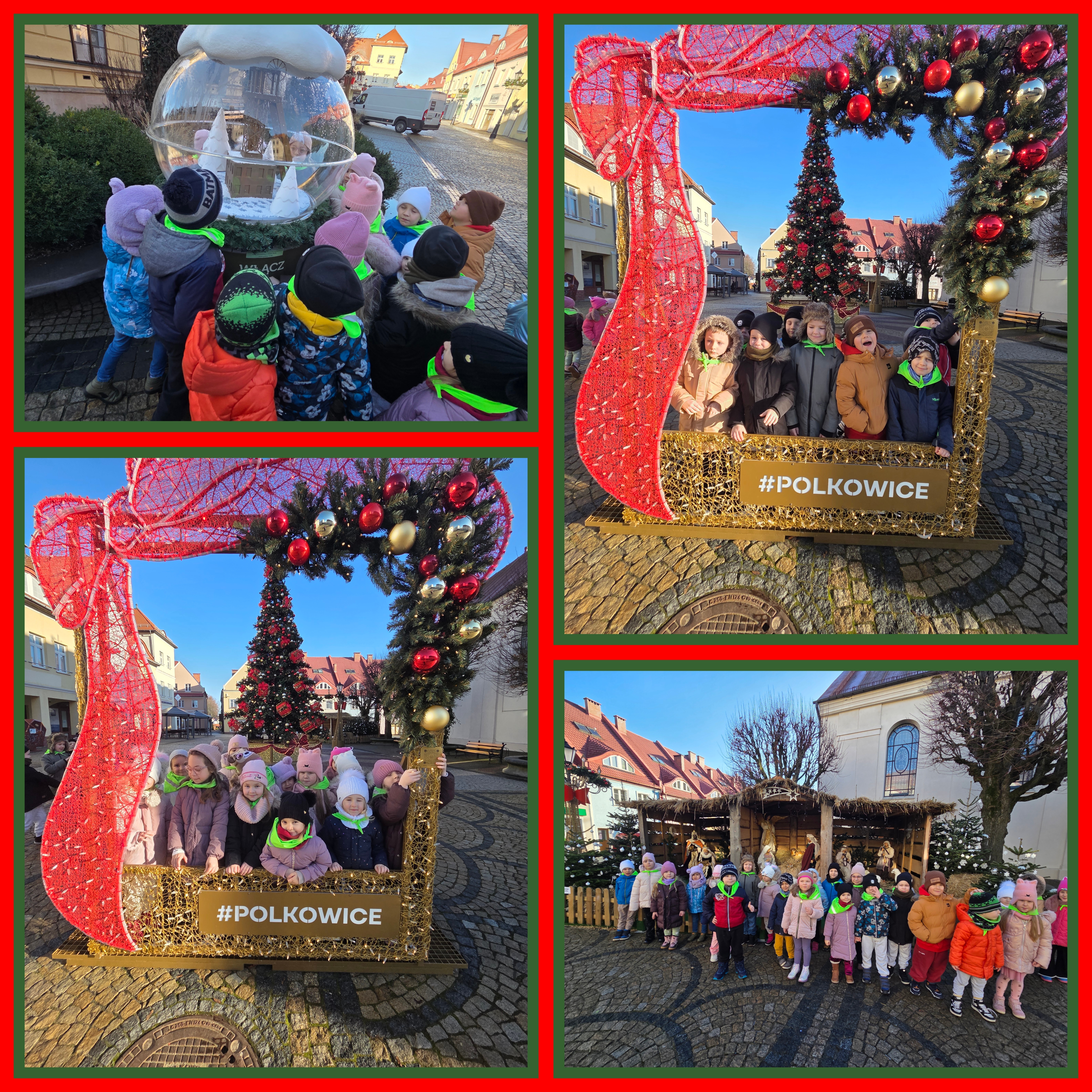 Dnia 18 grudnia 2025 dzieci z grupy Wróbelki w mroźne przedpołudnie uczestniczyły w świątecznym spacerze po okolicy. Podczas wyjścia miały okazję oglądać miejskie ozdoby bożonarodzeniowe oraz podziwiać pięknie udekorowane ulice. Szczególną atrakcją była wizyta na rynku Polkowic, gdzie dzieci z dużym zainteresowaniem oglądały okazałą choinkę oraz świąteczną szopkę. Spacer sprawił dzieciom wiele radości i pozwolił poczuć wyjątkową, świąteczną atmosferę.
