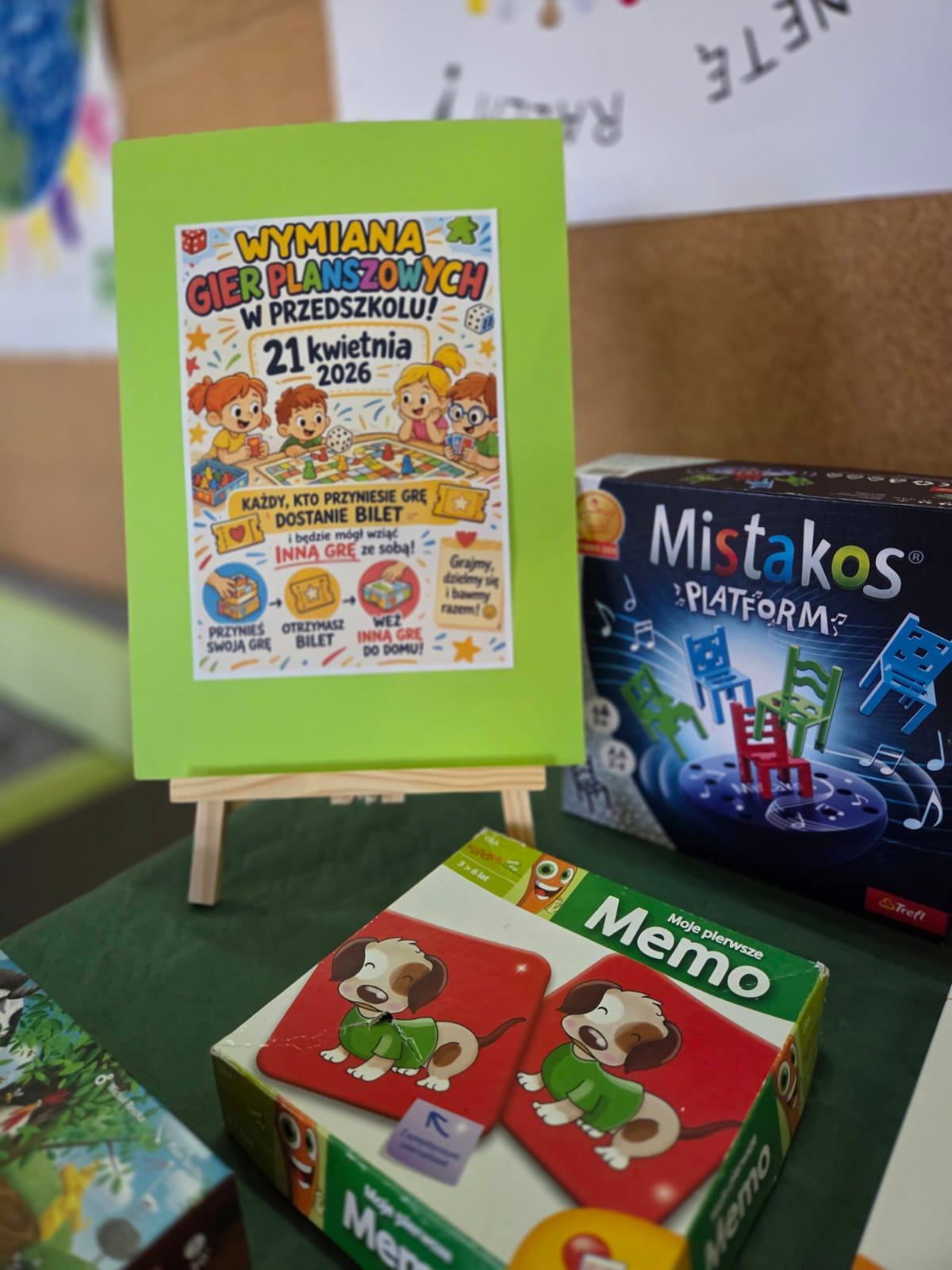 Dnia 21 kwietnia 2026 roku w ramach obchodów Polkowickiego Festiwalu Ziemi w naszym przedszkolu odbyła się akcja wymiany gier planszowych. Dzieci miały możliwość przyniesienia gier, z których już nie korzystają i wymienienia ich na inne. Inicjatywa spotkała się z dużym zainteresowaniem oraz radością przedszkolaków, którzy z entuzjazmem wybierali „nowe” gry do zabawy.