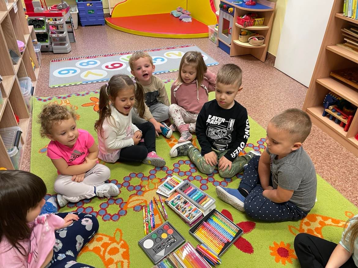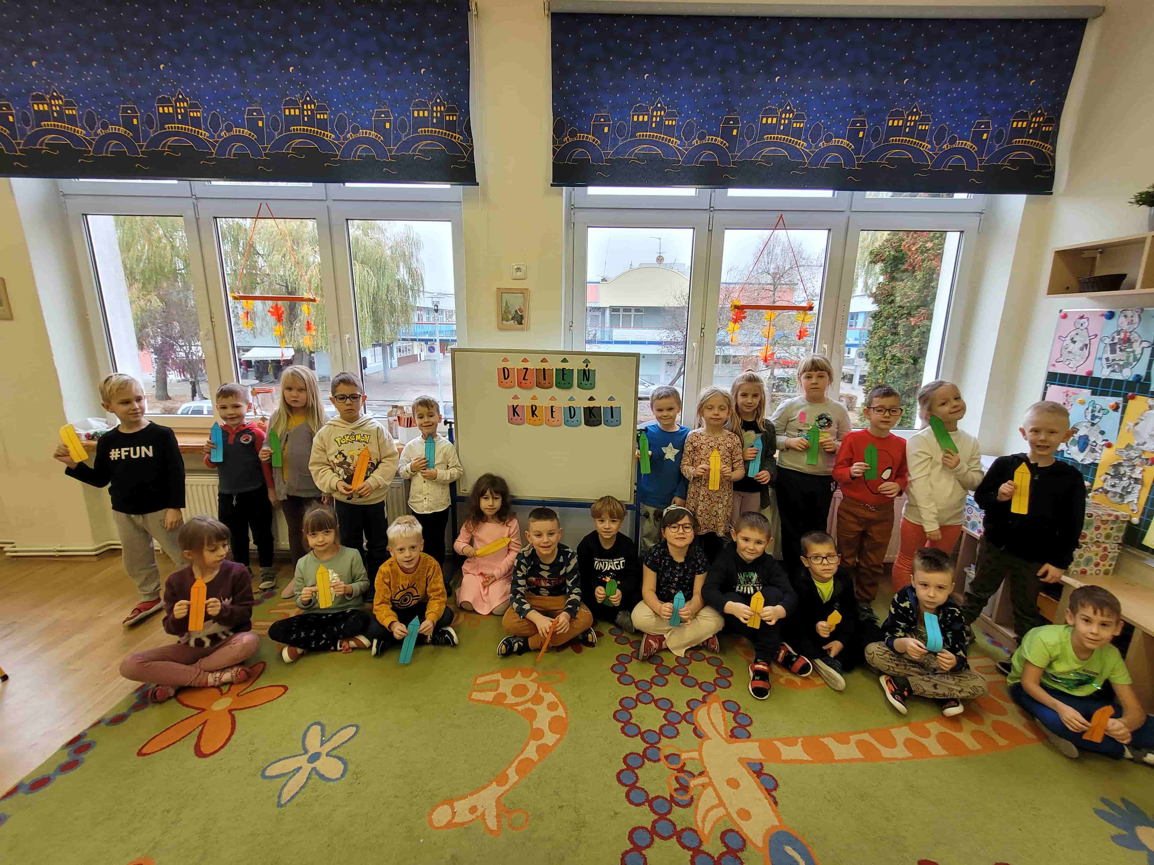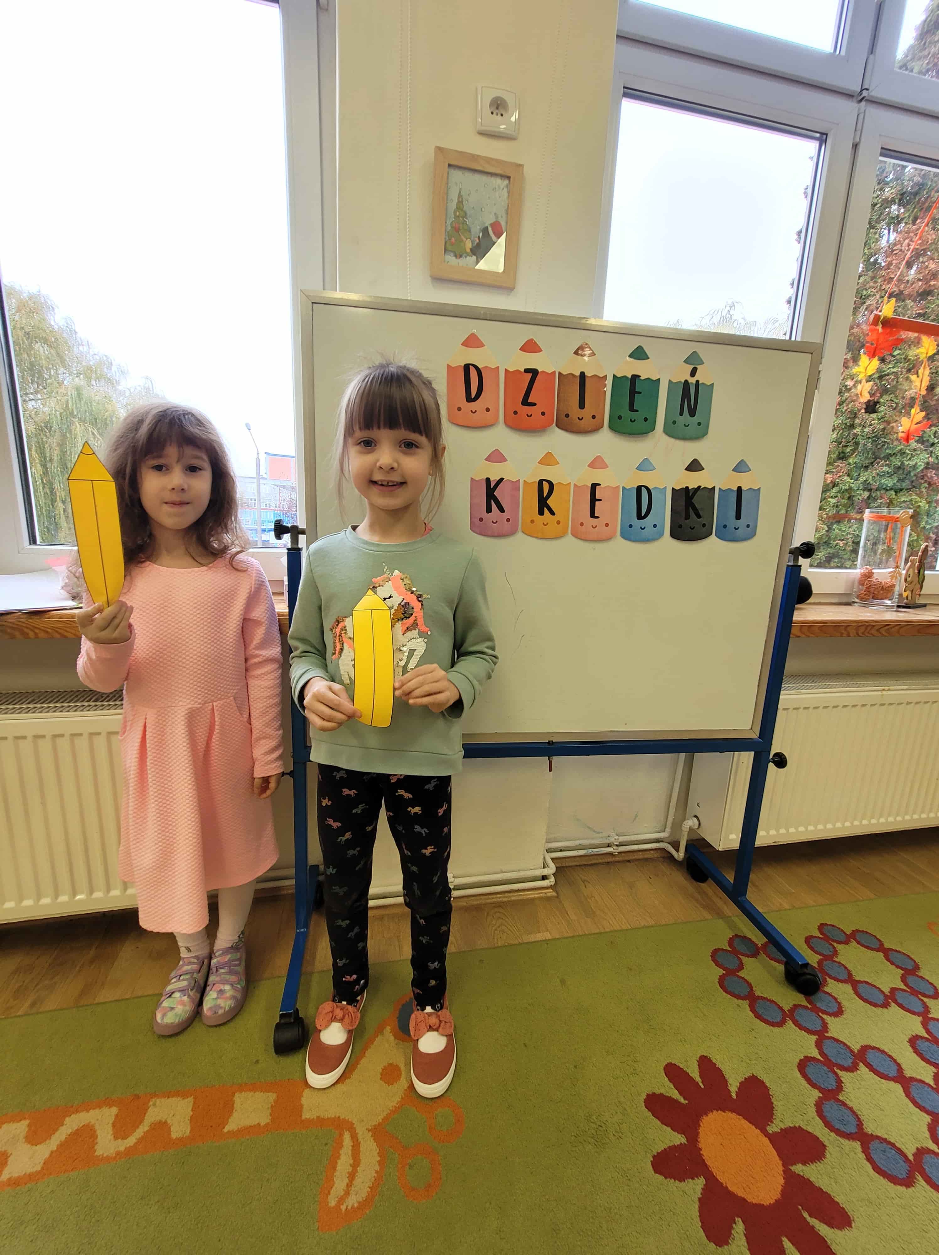 Z tej okazji w grupach Wróbelki i Wiewiórki odbywały się zabawy z kredkami w roli głównej. Przedszkolaki słuchały opowiadań, których bohaterami były kredki, poznały ich rodzaje oraz obejrzały krótki film o tym, jak są zrobione. Tworzyły zbiory kredek według kryterium koloru, kształtu, wielkości, rodzaju i porównywały ich liczebność.