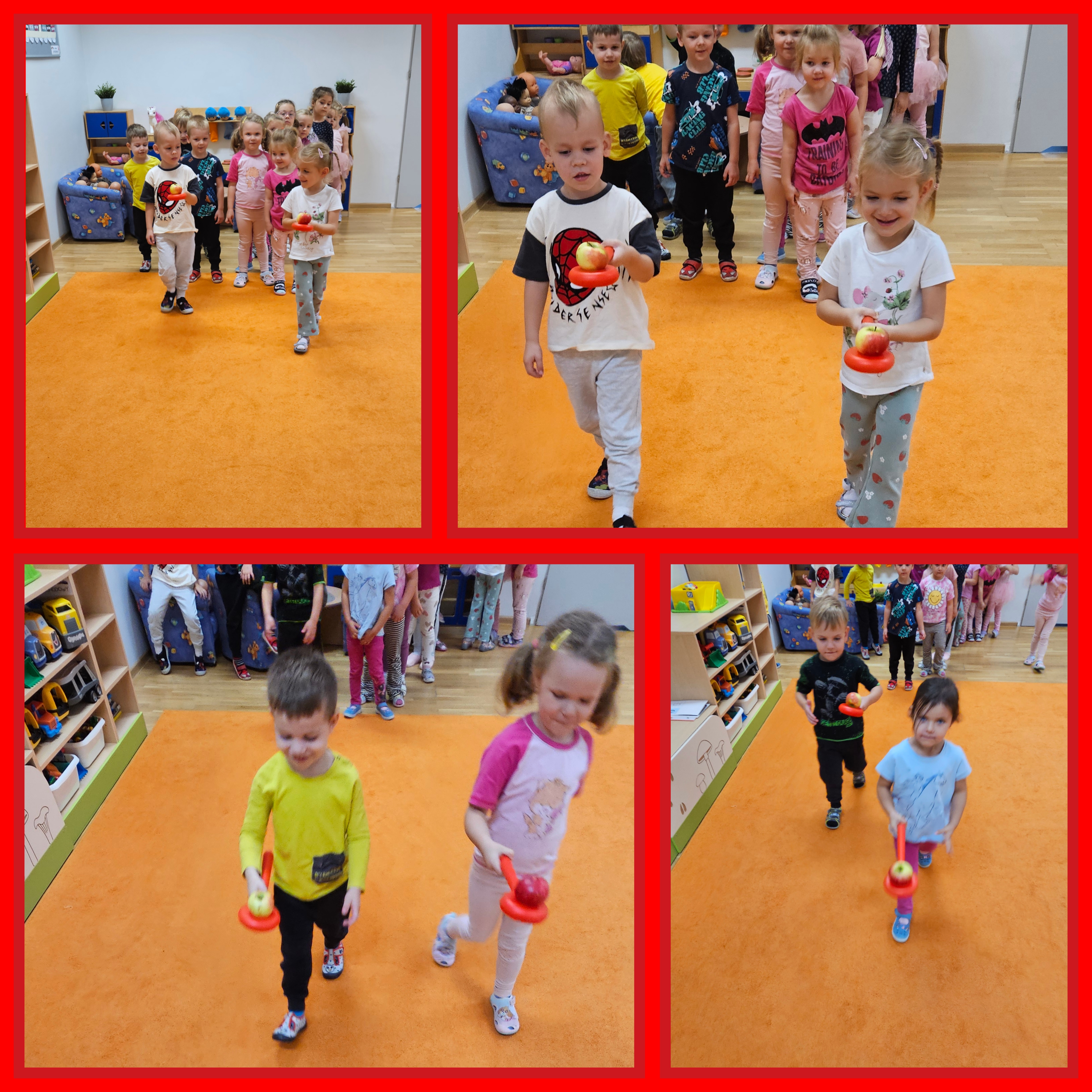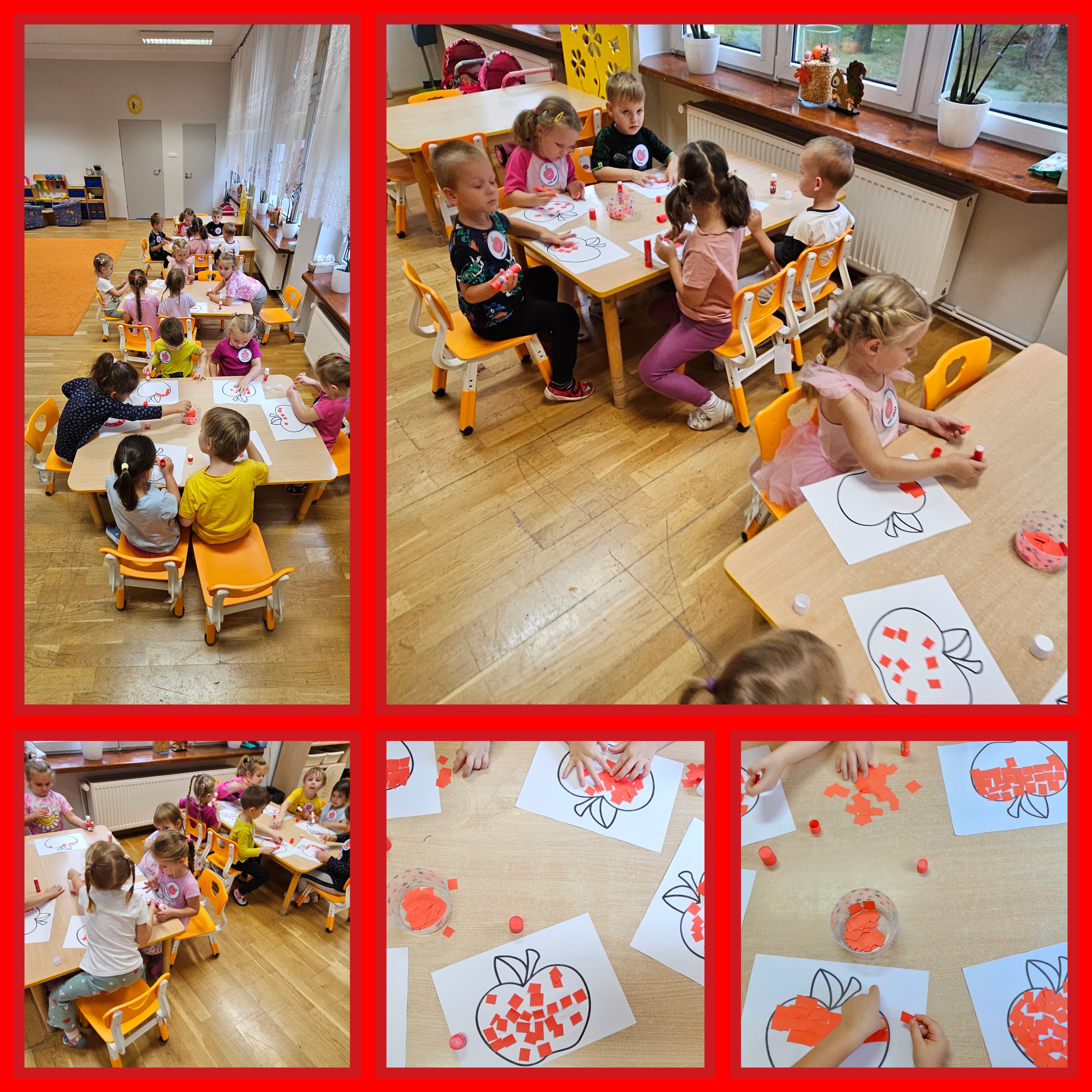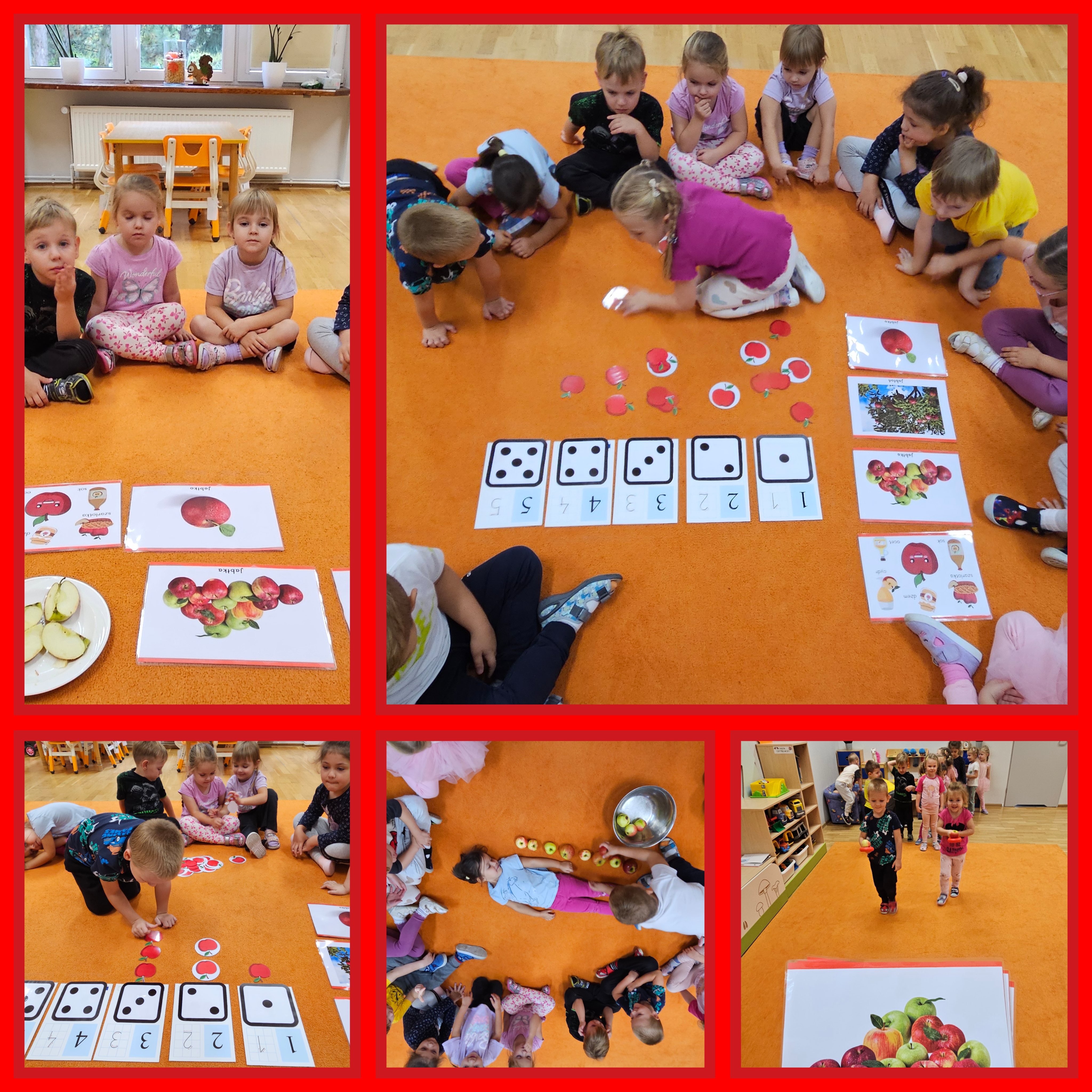 Jabłko jest jednym z najpopularniejszych owoców w naszym kraju i na świecie. Co czwarte jabłko w Europie pochodzi właśnie z Polski. Celem naszych zajęć było zachęcenie dzieci do spożywania jabłek i ich przetworów jako źródła witamin. Obchody tego wyjątkowego dnia rozpoczęliśmy od rozmów na temat jego wyglądu, kolorów, wielkości, kształtu, smaku, różnych odmian, dlaczego warto je jeść, pod jaką postacią. Wróbelki obejrzały film edukacyjne „Jabłuszko – największe sady owocowe w Polsce”. Wszystkie kolejne zabawy podczas pobytu dzieci w tym dniu w przedszkolu dotyczyły oczywiście jabłek. Były to zabawy dydaktyczne, ruchowe, matematyczne oraz logopedyczne. Tego dnia przedszkolaki wykonały także piękne prace plastyczne –rumiane jabłuszko.
